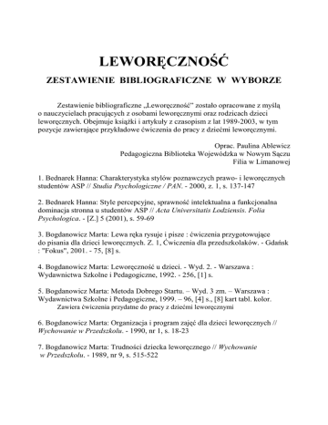 LEWORĘCZNOŚĆ ZESTAWIENIE BIBLIOGRAFICZNE W WYBORZE Zestawienie bibliograficzne „Leworęczność” zostało opracowane z myślą o nauczycielach pracujących z osobami leworęcznymi oraz rodzicach dzieci leworęcznych. Obejmuje ksiąŜki i artykuły z czasopism z lat 1989-2003, w tym pozycje zawierające przykładowe ćwiczenia do pracy z dziećmi leworęcznymi. Oprac. Paulina Ablewicz Pedagogiczna Biblioteka Wojewódzka w Nowym Sączu Filia w Limanowej 1. Bednarek Hanna: Charakterystyka stylów poznawczych prawo- i leworęcznych studentów ASP // Studia Psychologiczne / PAN. - 2000, z. 1, s. 137-147 2. Bednarek Hanna: Style percepcyjne, sprawność intelektualna a funkcjonalna dominacja stronna u studentów ASP // Acta Universitatis Lodziensis. Folia Psychologica. - [Z.] 5 (2001), s. 59-69 3. Bogdanowicz Marta: Lewa ręka rysuje i pisze : ćwiczenia przygotowujące do pisania dla dzieci leworęcznych. Z. 1, Ćwiczenia dla przedszkolaków. - Gdańsk : "Fokus", 2001. - 75, [8] s. 4. Bogdanowicz Marta: Leworęczność u dzieci. - Wyd. 2. - Warszawa : Wydawnictwa Szkolne i Pedagogiczne, 1992. - 256, [1] s. 5. Bogdanowicz Marta: Metoda Dobrego Startu. – Wyd. 3 zm. – Warszawa : Wydawnictwa Szkolne i Pedagogiczne, 1999. – 96, [4] s., [8] kart tabl. kolor. Zawiera ćwiczenia przydatne do pracy z dziećmi leworęcznymi 6. Bogdanowicz Marta: Organizacja i program zajęć dla dzieci leworęcznych // Wychowanie w Przedszkolu. - 1990, nr 1, s. 18-23 7. Bogdanowicz Marta: Trudności dziecka leworęcznego // Wychowanie w Przedszkolu. - 1989, nr 9, s. 515-522 8. Brejnak Wojciech: Kocham i wychowuję : poradnik dla rodziców i nauczycieli. - Warszawa : Oficyna Wydawniczo-Poligraficzna i Reklamowo-Handlowa "ADAM", 1993. - S. 98-108: Czy jest leworęczny? 9. Czajkowska Irena, Herda Kazimierz: Zajęcia korekcyjno-kompensacyjne w szkole : poradnik dla nauczycieli. – Wyd. 4 – Warszawa : Wydawnictwa Szkolne i Pedagogiczne, 2001. – 232 s. Zawiera ćwiczenia przydatne do pracy z dziećmi leworęcznymi 10. Dmochowska Maria: Zanim dziecko zacznie pisać. – Wyd. 4. – Warszawa : Wydawnictwa Szkolne i Pedagogiczne, 1991. – 263, [1] s. Zawiera ćwiczenia przydatne do pracy z dziećmi leworęcznymi 11. Gąsowska Teresa, Pietrzak-Stępkowska Zofia: Praca wyrównawcza z dziećmi mającymi trudności w czytaniu i pisaniu. – Wyd. 3. – Warszawa : Wydawnictwa Szkolne i Pedagogiczne, 1994. – 367, [1] s. Zawiera ćwiczenia przydatne do pracy z dziećmi leworęcznymi 12. Grabowska Anna: Ewolucyjne korzenie leworęczności // Problemy Poradnictwa Psychologiczno-Pedagogicznego. - 2000, nr 1, s. 42-50 13. Grabowska Anna: Leworęczność - praworęczność : próby kategoryzacji // Problemy Poradnictwa Psychologiczno-Pedagogicznego. - 2000, nr 1, s. 51-59 14. Grabowska Anna: Neurobiologiczne podstawy leworęczności // Przegląd Psychologiczny. - 1999, nr 1/2, s. 57-72 15. Grabowska Anna: Przyczyny leworęczności // Problemy Poradnictwa Psychologiczno-Pedagogicznego. - 2000, nr 2, s. 5-24 16. Healey Jane M.: Leworęczność : jak wychować leworęczne dziecko w świecie ludzi praworęcznych. - Gdańsk : Gdańskie Wydawnictwo Psychologiczne, 2003. 119 s. 17. Hercka Anna, Hercka Magdalena: Stronniczość mózgu // Gazeta Wyborcza. 1999, nr 116, dod. s. 50-53 18. Jaworska BoŜena: Dzieci leworęczne a przewroty // śycie Szkoły. - 1997, nr 10, s. 594-595 19. Krzywoń Danuta: Leworęczność w oczach "praworęcznego społeczeństwa" // Auxilium Sociale. - 1998, nr 2, s. 53-57 20. Krzywoń Danuta: Zasady postępowania z dziećmi leworęcznymi // Nauczyciel i Szkoła. - 1999, nr 1, s. 104-108 21. Oszwa Urszula: Dziecko leworęczne. Cz. I // Remedium. - 2002, nr 7-8, s. 2223 22. Oszwa Urszula: Dziecko leworęczne. Cz. II // Remedium. - 2002, nr 10, s. 12 23. Romanowska Dorota: Na odwrót // Wprost. - 1997, nr 20, s. 80 Leworęczność u dzieci 24. Sawa Barbara: JeŜeli dziecko źle czyta i pisze. – Wyd. 4 popr. – Warszawa : Wydawnictwa Szkolne i Pedagogiczne, 1994. - 180 s. Zawiera ćwiczenia przydatne do pracy z dziećmi leworęcznymi 25. Sobieszczyk Maria: Percepcja kierunków u dzieci leworęcznych // Zeszyty Naukowe WyŜszej Szkoły Pedagogicznej w Bydgoszczy. Studia Pedagogiczne. – Z. 33 (1997), s. 193-202 26. Szymczakiewicz-Bik BoŜena: SkrzyŜowana lateralizacja i leworęczność u dzieci // Auxilium Sociale. - 1997, n 2, s. 105-109 27. Walewski Paweł: Odwrócony świat // Polityka. - 2003, nr 19, s. 80-82 Leworęczność 28. Zakrzewska Barbara: Trudności w czytaniu i pisaniu : modele ćwiczeń. – Warszawa : Wydawnictwa Szkolne i Pedagogiczne, 1996. – 248 s. Zawiera ćwiczenia przydatne do pracy z dziećmi leworęcznymi