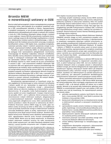 informacje ogólne Branża MEW o nowelizacji ustawy o OZE Branża małej hydroenergetyki z dużym zaniepokojeniem przyjmuje propozycje zmian, jakie pojawiły się w projekcie nowelizacji ustawy o OZE, procedowanym aktualnie w Sejmie. Zaproponowane w projekcie rozwiązania, w tym przede wszystkim odstąpienie od zabezpieczenia obowiązkowej puli energii w aukcjach dla instalacji o mocy do 1 MW, likwidacja obowiązku zakupu energii z instalacji o mocy większej i równej 500 kW, przywrócenie możliwości korzystania z pełnego wsparcia dla technologii współspalania w ramach tzw. dedykowanej instalacji spalania wielopaliwowego, a także likwidacja taryf dla instalacji prosumenckich oznaczają, że jedynym beneficjentem ustawy o OZE będzie duża, zawodowa energetyka, natomiast potrzeby małych i średnich wytwórców energii w prywatnych, rozproszonych źródłach zostały całkowicie pominięte. Ponadto w opinii środowiska MEW, na zdecydowaną krytykę zasługuje brak wprowadzenia jakiegokolwiek mechanizmu zmierzającego do likwidacji nadpodaży zielonych certyfikatów, który dawałby szansę odzyskania rentowności przez wytwórców energii w istniejących instalacjach OZE. Nowelizacja nie tylko nie wprowadza żadnych nowych mechanizmów naprawczych, ale likwiduje również te, które zostały do tej pory przewidziane w ustawie o OZE – czyli ustanowienie wielkości obowiązku OZE na poziomie 20% oraz ograniczenie wsparcia przewidzianego dla współspalania do instalacji, które uzyskały koncesje na wytwarzanie energii elektrycznej przed 30 czerwca 2014 r. W opiniowanym projekcie pojawiło się bowiem zobowiązanie Ministra Energii do obniżenia wielkości obowiązku OZE w 2017 roku, a ponadto projekt przywraca możliwości korzystania z pełnego wsparcia, w tym wsparcia w postaci zielonych certyfikatów, dla nowych dedykowanych instalacji spalania wielopaliwowego. Konsekwencją zaproponowanych w nowelizacji zmian będzie pogłębienie nierównowagi na rynku zielonych certyfikatów i kolejne spadki ich cen. Spowoduje to pogorszenie kondycji finansowej istniejących wytwórców energii z odnawialnych źródeł, którzy już obecnie znajdują się w katastrofalnej sytuacji ekonomicznej. W przypadku małej hydroenergetyki systematyczny spadek cen praw majątkowych, trwający nieprzerwanie od początku 2014 r. jest w głównej mierze przyczyną trwałej nierentowności małych elektrowni wodnych, zdiagnozowanej w przeprowadzonych badaniach1. Dodatkowo sytuację finansową pogorszyła ubiegłoroczna susza, która spowodowała obniżenie produkcji o około 30 procent w odniesieniu do 2014 r. Problemy finansowe sektora MEW mogą się nasilić, gdyż niedobory wody utrzymują się także w 2016 roku, a w najbliższym czasie przychody wytwórców energii w elektrowniach wodnych uszczuplą dodatkowo opłaty za wodę, zaplanowane w przygotowywanym przez Rząd nowym Prawie wodnym. Skutkiem tego będzie konieczność likwidacji wielu obiektów hydroenergetycznych, sygnalizowana obecnie przez licznych przedsiębiorców z branży MEW. Warto przy tej okazji wspomnieć, że likwidacja małych elektrowni wodnych oznacza nie tylko zmniejszenie liczby źródeł wytwórczych, ale także likwidację obiektów małej retencji i wzrost kosztów utrzymania rzek i urządzeń wodnych, 1 Raport Avanta Auditors and Advisors z dnia 19 października 2012 r. dotyczący wybranych konsekwencji projektowanych zmian regulacji prawnych w funkcjonowaniu małych elektrowni wodnych; Raport Avanta Auditors and Advisors z dnia 15 sierpnia 2013 roku dotyczący rentowności elektrowni wodnych w zakresie zainstalowanej mocy 300 kW-1 MW oraz związanych z tym wybranych skutków potencjalnych zmian wsparcia OZE; Raport Avanta Auditors and Advisors z dnia 10 stycznia 2014 roku dotyczący rentowności elektrowni wodnych w zakresie zainstalowanej mocy 1 MW-5MW oraz związanych z tym wybranych skutków potencjalnych zmian wsparcia OZE. technika chłodnicza i klimatyzacyjna 5/2016 które będzie musiał ponosić Skarb Państwa. Oceniając projekt nowelizacji ustawy, branża MEW zwróciła również uwagę na niezwykle dotkliwy nakaz zwrotu całej pomocy publicznej uzyskanej w aukcji przez wytwórcę, który nie uzyskał określonego stopnia wykorzystania mocy, tj. nie wytworzył w danym okresie zakładanego wolumenu energii. Kary tego typu nie uwzględniają specyfiki funkcjonowania instalacji OZE, w których ilość wyprodukowanej energii zależy z definicji od czynników naturalnych. Branża krytycznie ocenia również likwidację gwarancji 15-letniego okresu wsparcia. Ponadto, Towarzystwo Rozwoju Małych Elektrowni Wodnych (TRMEW) zwróciło uwagę na treść uzasadnienia projektu ustawy. Zawarto w nim nieprawdziwą informację, iż zaproponowane w nowelizacji rozwiązania dotyczące rozliczeń prosumenta zyskały aprobatę przedstawicieli środowisk prosumenckich, w tym Towarzystwa Rozwoju Małych Elektrowni Wodnych. W związku z faktem, iż TRMEW nie wyraziło żadnej opinii na temat rozwiązań dla prosumentów, zaproponowanych w projekcie nowelizacji ustawy o OZE, stowarzyszenie uznaje zapis uzasadnienia za nadużycie i zwróciło się o sprostowanie jego treści do Marszałka Sejmu oraz Posłanki Ewy Malik – przedstawicielki wnioskodawców w pracach nad projektem ustawy. Oceniając działania ustawodawcy w zakresie OZE branża małej hydroenergetyki wskazuje na niepewność warunków prawnych, w jakich funkcjonuje sektor OZE. Jest ona skutkiem wprowadzania kolejnych zmian w przyjętej ustawie o odnawialnych źródłach energii, jak również delegowania do rozporządzeń wielu zasadniczych regulacji, dotyczących kwestii takich jak kolejność przeprowadzania aukcji, wolumen energii w poszczególnych koszykach, wysokość cen referencyjnych czy sposób wyliczania pomocy publicznej, jest olbrzymim problemem destabilizującym funkcjonowanie wytwórców i powstrzymującym rozwój sektora. Oprócz zastrzeżeń odnoszących si