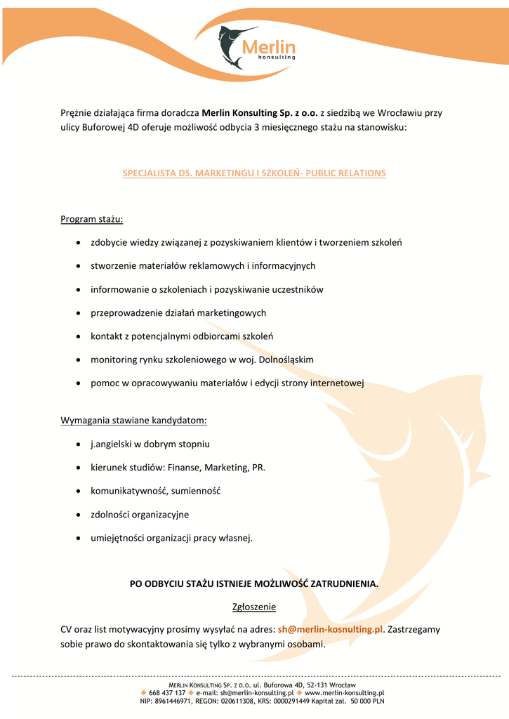 Prężnie działająca firma doradcza Merlin Konsulting Sp. z o.o. z siedzibą we Wrocławiu przy ulicy Buforowej 4D oferuje możliwość odbycia 3 miesięcznego stażu na stanowisku: SPECJALISTA DS. MARKETINGU I SZKOLEŃ- PUBLIC RELATIONS Program stażu: zdobycie wiedzy związanej z pozyskiwaniem klientów i tworzeniem szkoleń stworzenie materiałów reklamowych i informacyjnych informowanie o szkoleniach i pozyskiwanie uczestników przeprowadzenie działań marketingowych kontakt z potencjalnymi odbiorcami szkoleń monitoring rynku szkoleniowego w woj. Dolnośląskim pomoc w opracowywaniu materiałów i edycji strony internetowej Wymagania stawiane kandydatom: j.angielski w dobrym stopniu kierunek studiów: Finanse, Marketing, PR. komunikatywność, sumienność zdolności organizacyjne umiejętności organizacji pracy własnej. PO ODBYCIU STAŻU ISTNIEJE MOŻLIWOŚĆ ZATRUDNIENIA. Zgłoszenie CV oraz list motywacyjny prosimy wysyłać na adres: [email protected]. Zastrzegamy sobie prawo do skontaktowania się tylko z wybranymi osobami. MERLIN KONSULTING SP. Z O.O. ul. Buforowa 4D, 52-131 Wrocław 668 437 137 e-mail: [email protected] www.merlin-konsulting.pl NIP: 8961446971, REGON: 020611308, KRS: 0000291449 Kapitał zał. 50 000 PLN