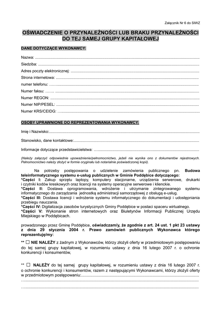 Załącznik Nr 6 do SIWZ OŚWIADCZENIE O PRZYNALEŻNOŚCI LUB BRAKU PRZYNALEŻNOŚCI DO TEJ SAMEJ GRUPY KAPITAŁOWEJ DANE DOTYCZĄCE WYKONAWCY: Nazwa: ........................................................................................................................................................ Siedziba: ..................................................................................................................................................... Adres poczty elektronicznej: ....................................................................................................................... Strona internetowa: .................................................................................................................................... numer telefonu: ……................................................................................................................................... Numer faksu: ……. ..................................................................................................................................... Numer REGON: .......................................................................................................................................... Numer NIP/PESEL: .................................................................................................................................... Numer KRS/CEIDG: …................................................................................................................................ OSOBY UPRAWNIONE DO REPREZENTOWANIA WYKONAWCY: Imię i Nazwisko:........................................................................................................................................... Stanowisko, dane kontaktowe:.................................................................................................................... Informacje dotyczące przedstawicielstwa: ….............................................................................................. (Należy załączyć odpowiednie upoważnienie/pełnomocnictwo, jeżeli nie wynika ono z dokumentów rejestrowych. Pełnomocnictwo należy złożyć w formie oryginału lub notarialnie poświadczonej kopii). Na potrzeby postępowania o udzielenie zamówienia publicznego pn. Budowa teleinformatycznego systemu e-usług publicznych w Gminie Poddębice dotyczącego: *Części I: Zakup sprzętu laptopy, komputery stacjonarne, urządzenia serwerowe, drukarki i czytniki kodów kreskowych oraz licencji na systemy operacyjne serwerowe i klienckie. *Części II: Dostawa oprogramowania, wdrożenie i utrzymanie zintegrowanego systemu informatycznego do zarządzania jednostką administracji samorządowej z obsługą e-usług. *Części III: Dostawa licencji i wdrożenie systemu informatycznego do dokumentacji i udostępniania przebiegu nauczania. *Części IV: Digitalizacja zasobów turystycznych Gminy Poddębice w postaci spaceru wirtualnego. *Części V: Wykonanie stron internetowych oraz Biuletynów Informacji Publicznej Urzędu Miejskiego w Poddębicach. prowadzonego przez Gminę Poddębice, oświadczam/y, że zgodnie z art. 24 ust. 1 pkt 23 ustawy z dnia 29 stycznia 2004 r. Prawo zamówień publicznych Wykonawca którego reprezentuję/my: □ ** NIE NALEŻY z żadnym z Wykonawców, którzy złożyli oferty w przedmiotowym postępowaniu do tej samej grupy kapitałowej, w rozumieniu ustawy z dnia 16 lutego 2007 r. o ochronie konkurencji i konsumentów, □ ** NALEŻY do tej samej grupy kapitałowej, w rozumieniu ustawy z dnia 16 lutego 2007 r. o ochronie konkurencji i konsumentów, razem z następującymi Wykonawcami, którzy złożyli oferty w przedmiotowym postępowaniu:........................................................................................................ …......................................................................................................................................................... …......................................................................................................................................................... ............................................................................................................................................................. ............................................................................................................................................................. * niepotrzebne skreślić, ** należy zaznaczyć właściwe przy użyciu znaku „X”. …........................................................... (Data i podpis Wykonawcy) W przypadku Wykonawców wspólnie ubiegających się o udzielenie zamówienia (konsorcjum/spółki cywilne) wszyscy członkowie konsorcjum/spółek cywilnych składają odrębne oświadczenie. Oświadczenie o przynależności lub braku przynależności do tej samej grupy kapitałowej, Wykonawca przekazuje Zamawiającemu najpóźniej w terminie 3 dni od zamieszczenia na stronie internetowej informacji, o której mowa w art. 86 ust. 5 ustawy Prawo zamówień publicznych. Wraz ze złożeniem oświadczenia, Wykonawca może przedstawić dowody, że powiązania z innymi Wykonawcami nie prowadzą do zakłócenia konkurencji w postępowaniu o udzielenie zamówienia.
