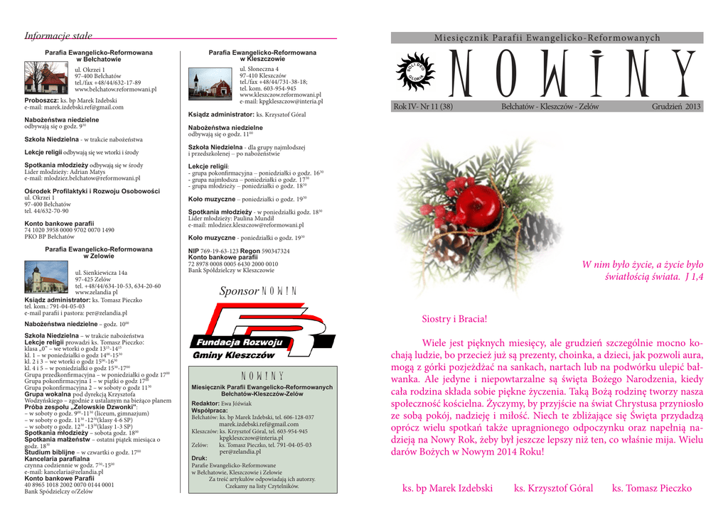 Informacje stałe Miesięcznik Paraf ii Ewangelicko-Reformowanych ul. Słoneczna 4 97-410 Kleszczów tel./fax +48/44/731-38-18; tel. kom. 603-954-945 www.kleszczow.reformowani.pl e-mail: [email protected] ul. Okrzei 1 97-400 Bełchatów tel./fax +48/44/632-17-89 www.belchatow.reformowani.pl Proboszcz: ks. bp Marek Izdebski e-mail: [email protected] Nabożeństwa niedzielne odbywają się o godz. 930 Szkoła Niedzielna - w trakcie nabożeństwa Lekcje religii odbywają się we wtorki i środy Spotkania młodzieży odbywają się w środy Lider młodzieży: Adrian Matys e-mail: [email protected] Ośrodek Profilaktyki i Rozwoju Osobowości ul. Okrzei 1 97-400 Bełchatów tel. 44/632-70-90 Konto bankowe parafii 74 1020 3958 0000 9702 0070 1490 PKO BP Bełchatów Parafia Ewangelicko-Reformowana w Zelowie ul. Sienkiewicza 14a 97-425 Zelów tel. +48/44/634-10-53, 634-20-60 www.zelandia pl Ksiądz administrator: ks. Tomasz Pieczko tel. kom.: 791-04-05-03 e-mail parafii i pastora: [email protected] Rok IV- Nr 11 (38) Ksiądz administrator: ks. Krzysztof Góral Bełchatów - Kleszczów - Zelów Grudzień 2013 Nabożeństwa niedzielne odbywają się o godz. 1100 Szkoła Niedzielna - dla grupy najmłodszej i przedszkolenej – po nabożeństwie Lekcje religii: - grupa pokonfirmacyjna – poniedziałki o godz. 1630 - grupa najmłodsza – poniedziałki o godz. 1730 - grupa młodzieży – poniedziałki o godz. 1830 Koło muzyczne – poniedziałki o godz. 1930 Spotkania młodzieży - w poniedziałki godz. 1830 Lider młodzieży: Paulina Mundił e-mail: [email protected] Koło muzyczne - poniedziałki o godz. 1930 NIP 769-19-63-123 Regon 590347324 Konto bankowe parafii 72 8978 0008 0005 6430 2000 0010 Bank Spółdzielczy w Kleszczowie W nim było życie, a życie było światłością świata. J 1,4 Sponsor N O W I N Nabożeństwa niedzielne – godz. 1000 Szkoła Niedzielna – w trakcie nabożeństwa Lekcje religii prowadzi ks. Tomasz Pieczko: klasa „0” – we wtorki o godz 1315-1415 kl. 1 – w poniedziałki o godz 1400-1530 kl. 2 i 3 – we wtorki o godz 1500-1630 kl. 4 i 5 – w poniedziałki o godz 1530-1700 Grupa przedkonfirmacyjna – w poniedziałki o godz 1700 Grupa pokonfirmacyjna 1 – w piątki o godz 1700 Grupa pokonfirmacyjna 2 – w soboty o godz 1130 Grupa wokalna pod dyrekcją Krzysztofa Wodzyńskiego – zgodnie z ustalanym na bieżąco planem Próba zespołu „Zelowskie Dzwonki”: – w soboty o godz. 900-1130 (liceum, gimnazjum) – w soboty o godz. 1130 -1230(klasy 4-6 SP) – w soboty o godz. 1230 -1330(klasy 1-3 SP) Spotkania młodzieży – sobota godz. 1800 Spotkania małżeństw – ostatni piątek miesiąca o godz. 1830 Studium biblijne – w czwartki o godz. 1700 Kancelaria parafialna czynna codziennie w godz. 730-1500 e-mail: [email protected] Konto bankowe Parafii 40 8965 1018 2002 0070 0144 0001 Bank Spódzielczy o/Zelów NOWINY Parafia Ewangelicko-Reformowana w Kleszczowie Parafia Ewangelicko-Reformowana w Bełchatowie NOWINY Miesięcznik Parafii Ewangelicko-Reformowanych Bełchatów-Kleszczów-Zelów Redaktor: Ewa Jóźwiak Współpraca: Bełchatów: ks. bp Marek Izdebski, tel. 606-128-037 [email protected] Kleszczów: ks. Krzysztof Góral, tel. 603-954-945 Zelów: [email protected] ks. Tomasz Pieczko, tel. 791-04-05-03 [email protected] Druk: Parafie Ewangelicko-Reformowane w Bełchatowie, Kleszczowie i Zelowie Za treść artykułów odpowiadają ich autorzy. Czekamy na listy Czytelników. Siostry i Bracia! Wiele jest pięknych miesięcy, ale grudzień szczególnie mocno kochają ludzie, bo przecież już są prezenty, choinka, a dzieci, jak pozwoli aura, mogą z górki pozjeżdżać na sankach, nartach lub na podwórku ulepić bałwanka. Ale jedyne i niepowtarzalne są święta Bożego Narodzenia, kiedy cała rodzina składa sobie piękne życzenia. Taką Bożą rodzinę tworzy nasza społeczność kościelna. Życzymy, by przyjście na świat Chrystusa przyniosło ze sobą pokój, nadzieję i miłość. Niech te zbliżające się Święta przydadzą oprócz wielu spotkań także upragnionego odpoczynku oraz napełnią nadzieją na Nowy Rok, żeby był jeszcze lepszy niż ten, co właśnie mija. Wielu darów Bożych w Nowym 2014 Roku! ks. bp Marek Izdebski ks. Krzysztof Góral ks. Tomasz Pieczko Zwiastowanie Kącik dla dzieci KOŚCIÓŁ BOŻY, CIAŁO CHRYSTUSA, WSPÓLNOTA… Na podstawie tekstu Listu Apostoła Pawła do Rzymian 8,31-39 Warto myśleć o nim często, zwłaszcza wtedy, gdy przychodzi nam przeżywać jego trudną codzienność, w tak trudnych czasach... Jan Kalwin pisze w Katechizmie Genewskim (pkt 94) o Kościele, że „jest on widzialnym przejawem całości dzieła zbawienia, aby nasza wiara w nim była umocniona”. Stwierdzenie to jest kapitalne dla życia naszych wspólnot. Kościół - w swoim znaczeniu widzialnym - nie jest celem sam w sobie, ale ma być w sposób stały podporządkowany swemu celowi nadrzędnemu: świadczyć o darze zbawienia w Jezusie Chrystusie (por. Rz 8,29) i umacniać tych, którzy w jego wspólnocie się łączą. Jezus Chrystus, Jego dzieło Syna Bożego, musi być w stałym centrum życia Kościoła, ponieważ to On sam oddał się za nas... Powiecie może, wszystko to piękne i nie ma wątpliwości, że tak być powinno, ale życie jest takie skomplikowane... Fakt, Kościół, pomimo swojego początku w zamiarze i dziele Bożym, będąc częścią tego świata, nie jest doskonały i święty w znaczeniu potocznym. Więcej, obserwując czasem życie naszych wspólnot, możemy powiedzieć, że jest daleki od świętości ciągle w tym potocznym znaczeniu. To nie jest jednak powód do smutku. Wydaje się wręcz, że jest to raczej powód do radości. Możemy uwolnić się od snów o naszej ludzkiej doskonałości. Możemy przyjąć w pokorze nasz stan ludzkiej niedoli i z wolnością, w radości, zaangażować się w dzieło wspólnoty Kościoła. Możemy to uczynić ponieważ wiemy, że jedyną naszą prawdziwą si