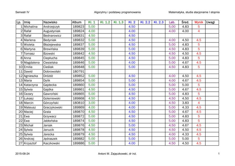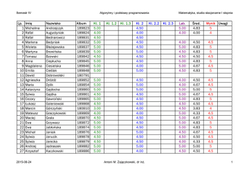 Semestr IV Lp. 1 2 3 4 5 6 7 8 9 10 11 12 13 14 15 16 17 18 19 20 21 22 23 24 25 26 27 Imię Michalina Rafał Rafał Marlena Wioleta Martyna Tomasz Anna Magdalena Emilia Dawid Agnieszka Maria Katarzyna Sylwia Cezary Łukasz Marcin Mateusz Maciej Ewa Ewa Michał Sylwia Sylwia Andrzej Krzysztof 2015-08-24 Algorytmy i podstawy programowania Nazwisko Andrzejczyk Augustyniak Bednarowicz Bedyniak Błażejewska Brewińska Bzowski Ciepłucha Ciesielska Cieślak Dobrowolski Dróżdż Dylik Gajdecka Gajdka Gawroński Goleniewski Górczyński Graczykowski Grala Grzywacz Jabłońska Janiak Janucik Jarecka Jędraszek Kaczkowski Album 189823 189824 189831 189832 189837 189839 189842 189845 189846 189848 180791 189852 189854 189860 189861 189865 189868 180810 189869 189870 189872 189874 189876 189878 189879 189882 189886 Kl. 1 5.00 4.00 4.50 5.00 5.00 5.00 4.50 5.00 5.00 5.00 5.00 5.00 5.00 4.50 5.00 4.50 3.00 4.00 4.50 5.00 5.00 4.50 4.50 4.50 5.00 5.00 Kl. 1.2 Kl. 1.3 Kl. 2 4.50 4.00 4.50 4.50 4.50 5.00 4.50 4.50 4.00 5.00 4.50 5.00 5.00 4.50 4.50 4.50 4.00 4.00 4.50 4.50 4.50 5.00 4.50 4.50 5.00 4.00 Antoni M. Zajączkowski, dr inż. Kl. 2.2 Matematyka, studia stacjonarne I stopnia Kl. 2.3 Lab. 5.00 4.00 Śred. 4.83 4.00 Wynik Uwagi 5 4 4.00 5.00 4.50 4.50 5.00 5.00 4.50 4.50 4.83 4.83 4.50 4.83 4.67 4.83 4.5 5 5 4.5 5 4.5 5 4.00 4.00 5.00 5.00 5.00 4.50 4.50 5.00 5.00 5.00 5.00 4.50 4.50 4.00 5.00 4.50 4.50 4.67 5.00 4.67 4.83 4.50 3.83 4.33 4.67 4.83 4.83 4.67 4.50 4.33 5.00 4.50 4.5 4.5 5 4.5 5 4.5 4 4.5 4.5 5 5 4.5 4.5 4.5 5 4.5 1 Semestr IV 28 29 30 31 32 33 34 35 37 38 39 40 41 42 43 44 45 46 47 48 49 50 51 52 53 54 55 56 Bartłomiej Paulina Agnieszka Przemysław Agata Joanna Dawid Anna Ewelina Weronika Justyna Magdalena Paweł Michał Konrad Tomasz Marta Przemysław Arkadiusz Klaudia Łukasz Marcin Karolina Anna Mikołaj Katarzyna Anna Paweł 2015-08-24 Algorytmy i podstawy programowania Kałużniak Kasianiuk Kaźmierczak Kijak Kluska Kobacka Kobiela Kowalińska Kroc Królasik Krzymińska Kujawa Laska Lis Łosiewicz Macias Madej Malinowski Marchewa Marszałek Maślanka Matuszewski Mieszek Misztal Moniuszko Myszka Niewiadomska Nowak 189887 189888 189889 189891 189892 189894 189895 189902 189904 189906 189908 189909 189912 189913 189915 180873 189918 180879 189919 189920 189923 189926 189928 189929 189930 189933 189934 189935 5.00 4.50 5.00 5.00 5.00 5.00 4.00 4.50 4.00 4.50 5.00 5.00 4.50 4.50 5.00 5.00 4.50 5.00 4.50 5.00 4.50 5.00 4.50 5.00 5.00 5.00 4.50 4.50 5.00 5.00 5.00 4.50 4.50 5.00 4.50 4.50 5.00 5.00 5.00 4.50 4.50 4.50 5.00 4.50 2.00 4.50 5.00 4.50 5.00 4.50 5.00 4.50 4.50 4.00 Antoni M. Zajączkowski, dr inż. Matematyka, studia stacjonarne I stopnia 4.50 4.00 5.00 5.00 4.00 4.00 5.00 4.00 4.00 5.00 4.50 5.00 5.00 5.00 4.50 4.50 4.50 4.50 5.00 5.00 5.00 5.00 5.00 4.00 4.00 4.00 4.00 4.67 4.50 5.00 5.00 4.50 4.50 4.67 4.33 4.17 4.83 4.83 5.00 4.67 4.67 4.67 4.83 4.50 4.5 4.5 5 5 4.5 4.5 4.5 4.5 4.5 4 5 5 5 4.5 4.5 4.5 5 4.5 4.67 5.00 4.67 5.00 4.67 4.67 4.50 4.50 4.17 4.5 5 4.5 5 4.5 4.5 4.5 4.5 4 19.IX.14 2 Semestr IV 57 58 59 60 61 62 63 64 65 66 67 68 69 70 71 72 73 74 75 76 Damian Vadim Aneta Joanna Katarzyna Agata Katarzyna Filip Marlena Paulina Zuzanna Emilia Marta Adrian Roksana Przemysław Edyta Agata Natalia Katarzyna 2015-08-24 Algorytmy i podstawy programowania Olczak Oleksiejczuk Ostrowska Pawelczyk Pawlik Piasta Piestrzeniewicz Pietrusiak Pietrzak Popecka Popielarczyk Porada Rzeżniczak Samiec Szejna Szewc Teresiak Włodarczyk Zybert Żmuda 189937 180899 180904 189942 189943 189946 189947 189948 189949 189955 180856 189956 189966 189967 189978 189979 189986 189993 190004 180994 5.00 5.00 4.00 5.00 5.00 4.50 5.00 4.00 5.00 5.00 5.00 5.00 5.00 5.00 4.00 5.00 4.50 5.00 5.00 Matematyka, studia stacjonarne I stopnia 4.50 4.50 5.00 4.50 4.83 5 4.50 4.50 2.00 4.50 5.00 3.50 4.50 4.50 4.50 4.50 5.00 4.00 4.00 4.50 4.50 4.50 4.50 4.00 4.00 5.00 4.00 5.00 4.00 5.00 5.00 4.00 4.50 4.50 3.50 5.00 5.00 5.00 5.00 4.50 4.17 4.50 4 4.5 4.33 5.00 3.83 4.83 4.83 4.50 4.67 4.83 4.17 4.33 4.83 4.67 4.83 4.67 4.5 5 4 5 5 4.5 4.5 5 4 4.5 5 4.5 5 4.5 19.IX.14 Antoni M. Zajączkowski, dr inż. 3 Semestr IV Algorytmy i podstawy programowania Matematyka, studia stacjonarne I stopnia LAB-POM 5.00 4.17 0.00 4.17 4.92 4.42 4.58 4.75 4.92 4.58 4.17 3.83 4.75 4.75 4.92 4.67 4.25 5.00 4.75 4.75 4.83 4.58 4.67 3.58 4.92 4.25 2015-08-24 Antoni M. Zajączkowski, dr inż. 4 Semestr IV Algorytmy i podstawy programowania Matematyka, studia stacjonarne I stopnia 4.58 4.17 4.83 4.92 3.83 3.83 5.00 4.00 4.08 4.75 4.42 4.92 4.83 5.00 4.33 4.42 4.33 4.25 4.75 5.00 4.92 4.83 4.75 4.17 3.83 4.00 3.83 2015-08-24 Antoni M. Zajączkowski, dr inż. 5 Semestr IV Algorytmy i podstawy programowania Matematyka, studia stacjonarne I stopnia 4.83 4.33 4.17 4.17 4.83 4.17 5.00 4.00 4.92 5.00 4.08 4.33 4.58 3.67 5.00 4.75 4.83 4.83 4.25 2015-08-24 Antoni M. Zajączkowski, dr inż. 6