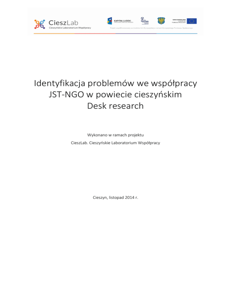 Identyfikacja problemów we współpracy JST-NGO w powiecie cieszyńskim Desk research Wykonano w ramach projektu CieszLab. Cieszyńskie Laboratorium Współpracy Cieszyn, listopad 2014 r. Spis treści Wstęp ............................................................................................................................................... 3 Definicje zastosowane w opracowaniu .......................................................................................... 5 1. Trzeci sektor w powiecie cieszyńskim ........................................................................................ 7 1.1 Organizacje pozarządowe w powiecie cieszyńskim – liczba i charakterystyka .................. 7 1.2 Formy współpracy JST-NGO................................................................................................ 10 1.3 Zasady współpracy samorządu z organizacjami pozarządowymi ..................................... 12 2. Rola organizacji pozarządowych w skali województwa śląskiego........................................... 21 2.1 Strategia Rozwoju Województwa Śląskiego ...................................................................... 21 2.1 Ocena współpracy samorząd – organizacje w województwie śląskim............................. 22 3. Diagnoza stanu współpracy samorządu z organizacjami pozarządowymi ............................. 27 3.1 Podstawowe dane o aktywności organizacji pozarządowych .......................................... 27 3.2 Czynniki kształtujące współpracę samorządu z organizacjami pozarządowymi .............. 28 3.3 Ocena jakości współpracy organizacji z samorządem ....................................................... 31 3.4 Bariery we współpracy samorządu z organizacjami pozarządowymi............................... 35 3.5 Ocena jakości współpracy – kontekst lokalny.................................................................... 42 3.5.1 Badanie CieszLab – Cieszyńskie Laboratorium Współpracy. Raport 2009................ 42 3.5.2 Strategia Współpracy Organizacji Pozarządowych i Sektora Publicznego w Powiecie Cieszyńskim ........................................................................................................................... 47 3.6 Bariery, które można przełamać ........................................................................................ 49 4. Ocena jakości współpracy administracji publicznej i organizacji pozarządowych w powiecie cieszyńskim .................................................................................................................................... 54 4.1 Ocena jakości współpracy w zakresie tworzenia i realizacji polityk publicznych ............. 54 4.2 Ocena jakości współpracy w zakresie współpracy finansowej i partnerstw projektowych .................................................................................................................................................... 61 4.3 Ocena jakości współpracy w zakresie wspierania inicjatyw obywatelskich i integracji III sektora ....................................................................................................................................... 69 Spis zestawień ................................................................................................................................ 77 Strona Spis tabel ........................................................................................................................................ 77 2 6. Rekomendacje w zakresie Lokalnego Indeksu Jakości Współpracy........................................ 76 Wstęp Niniejsze opracowanie zostało sporządzone w ramach projektu pt. „CieszLab. Cieszyńskie Laboratorium Współpracy”. Projekt realizowany jest przez Stowarzyszenie Wspierania Inicjatyw Gospodarczych Delta Partner z Cieszyna (Lider projektu) oraz Powiat Cieszyński (Partner projektu) w ramach Programu Operacyjnego Kapitał Ludzki - Priorytet V. Dobre rządzenie. Działanie 5.4. Rozwój potencjału trzeciego sektora, Poddziałanie 5.4.2. Rozwój dialogu obywatelskiego - współfinansowanego ze środków Unii Europejskiej w ramach Europejskiego Funduszu Społecznego. Celem opracowania jest przedstawienie barier we współpracy samorządów i organizacji pozarządowych w powicie cieszyńskim. To właśnie przezwyciężenie barier stanowi punkt wyjścia do uzyskania dobrych relacji samorządu i NGO. Analiza obejmuje współpracę samorządu z NGO w gminach powiatu cieszyńskiego w województwie śląskim (13 jednostek samorządu terytorialnego). W szczegółowym ujęciu obejmuje następujące elementy: − Opis stanu obecnego współpracy samorządów i organizacji pozarządowych w zakresie konsultowania projektowanych uchwał, będący elementem tworzenia polityk publicznych; − Analizę prawną dotyczącą tworzenia polityk lokalnych oraz standaryzacji współpracy międzysektorowej; − Identyfikację procedur oraz standardów współpracy samorządu lokalnego z sektorem pozarządowym; − Katalog problemów i potrzeb przedstawicieli samorządu oraz organizacji pozarządowych oraz występujące deficyty we wzajemnej współpracy. Powiat cieszyński bywa często wskazywany jako jedno z miejsc w Polsce, gdzie poziom konsultowania polityk publicznych można uznać za dość dobrze rozwinięty, jednakże w wielu Strona i samorządów jest prezentowana jako modelowa. Poziom współpracy JST i NGO w zakresie 3 aktywności obywatelskiej jest bardzo wysoki, a współpraca sektora pozarządowego miejscach wymagający znacznej poprawy i wdrożenia rekomendowanych na poziomie krajowym form współpracy. Podstawą opracowania są zagadnienia dotyczące współpracy samorządu z organizacjami pozarządowymi zaproponowane w publikacji pt. „Model współpracy administracji publicznej i organizacji pozarządowych - wypracowanie i upowszechnienie standardów współpracy” (źródło: www.pokl5