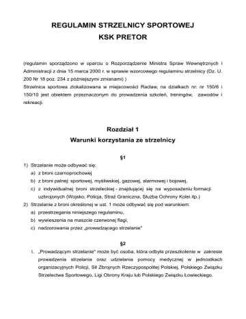 REGULAMIN STRZELNICY SPORTOWEJ KSK PRETOR (regulamin sporządzono w oparciu o Rozporządzenie Ministra Spraw Wewnętrznych i Administracji z dnia 15 marca 2000 r. w sprawie wzorcowego regulaminu strzelnicy (Dz. U. 200 Nr 18 poz. 234 z późniejszymi zmianami) ) Strzelnica sportowa zlokalizowana w miejscowości Racław, na działkach nr: nr 150/6 i 150/10 jest obiektem przeznaczonym do prowadzenia szkoleń, treningów, zawodów i rekreacji. Rozdział 1 Warunki korzystania ze strzelnicy §1 1) Strzelanie może odbywać się: a) z broni czarnoprochowej b) z broni palnej: sportowej, myśliwskiej, gazowej, alarmowej i bojowej, c) z indywidualnej broni strzeleckiej - znajdującej się na wyposażeniu formacji uzbrojonych (Wojsko, Policja, Straż Graniczna, Służba Ochrony Kolei itp.) 2) Strzelanie z broni określonej w ust. 1 może odbywać się pod warunkiem: a) przestrzegania niniejszego regulaminu, b) wywieszenia na maszcie czerwonej flagi, c) nadzorowania przez „prowadzącego strzelanie" §2 1. „Prowadzącym strzelanie" może być osoba, która odbyła przeszkolenie w zakresie prowadzenia strzelania oraz udzielania pomocy medycznej w jednostkach organizacyjnych Policji, Sił Zbrojnych Rzeczypospolitej Polskiej, Polskiego Związku Strzelectwa Sportowego, Ligi Obrony Kraju lub Polskiego Związku Łowieckiego. §3 1) Prowadzący strzelanie: a) odpowiada za bezpieczeństwo użytkowników strzelnicy oraz osób im towarzyszących, b) wyznacza korzystającym ze strzelnicy stanowiska strzeleckie, a osobom towarzyszącym - miejsce bezpiecznego pobytu, c) prowadzi książkę rejestru pobytu na strzelnicy, w której zamieszcza się następujące dane: - imię i nazwisko korzystającego ze strzelnicy, - numer pozwolenia na broń oraz nazwę organu, który je wydał, albo adres korzystającego ze strzelnicy, jeśli nie posiada on pozwolenia na broń, - oświadczenie korzystającego ze strzelnicy o zapoznaniu się z regulaminem strzelnicy i przepisami bezpieczeństwa, potwierdzone własnoręcznym podpisem. §4 1) Na strzelnicy zabrania się: a) osobom towarzyszącym osobom korzystającym ze strzelnicy wchodzenia na stanowiska strzeleckie oraz styczności z bronią, b) używania broni innych osób korzystających ze strzelnicy, bez zgody jej użytkownika, c) spożywania alkoholu lub używania środków odurzających oraz przebywania na terenie strzelnicy osób będących pod ich wpływem. §5 1) Na strzelnicy, w miejscu widocznym, umieszcza się: a) regulamin strzelnicy, b) decyzję o dopuszczeniu strzelnicy do użytkowania, c) plan strzelnicy z oznaczeniem: d) stanowisk strzeleckich, e) punktu sanitarnego, f) dróg ewakuacji, g) miejsca instalacji telefonu lub innych urządzeń łączności, h) wykaz sygnałów alarmowych, i) informację o możliwości i sposobie połączenia się z najbliższym punktem pomocy medycznej. §6 Za szkody powstałe podczas strzelania oraz spowodowanie wypadku odpowiada właściciel lub zarządca strzelnicy, prowadzący strzelanie lub trening strzelecki albo korzystający ze strzelnicy, na zasadach określonych w odrębnych przepisach. §7 1) Dopuszcza się indywidualne treningi bez bezpośredniego nadzoru przez prowadzącego strzelanie dla osób posiadających broń myśliwską lub sportową, lub posiadających uprawnienia trenera lub sędziego strzelectwa myśliwskiego lub sportowego albo obronnego. 2) Przed rozpoczęciem strzelań osoby, o której mowa w pkt. 1 zobowiązane są do zgłoszenia się do prowadzącego strzelanie i uzyskanie pozwolenia na rozpoczęcie treningu indywidualnego. W czasie takiego treningu prowadzący strzelanie musi być obecny w obrębie strzelnicy, potwierdzając zgodę wpisem w księdze rejestru pobytu na strzelnicy Rozdział 2 Sposób obchodzenia się z bronią §8 Na terenie strzelnicy poza stanowiskiem strzeleckim nosi się broń rozładowaną bez jakiejkolwiek amunicji, łusek, atrap i zbijaków w jej obrębie; bez podpiętego magazynka, z lufą skierowaną w górę lub w dół z otwartymi komorami nabojowymi lub z włożonym znacznikiem bezpieczeństwa, bez pasów i pokrowców. W przypadku pistoletów i rewolwerów dozwolone jest ich noszenie w kaburach. Dopuszcza się inny sposób noszenia broni, jeśli tak stanowi regulamin zawodów. §9 Wyjmowanie broni odbywa się wyłącznie na stanowisku strzeleckim lub treningowym tylko na polecenie prowadzącego strzelanie lub trening strzelecki , lub w miejscach do tego wyznaczonych. §10 Wszelkich czynności związanych z obsługą broni dokonuje się wyłącznie z lufą skierowaną w kierunku kulochwytu, tarcz bądź przedmiotów będących celem na strzelnicy. §11 Strzelanie rozpoczyna się wyłącznie na komendę prowadzącego strzelanie. §12 Zakończenie strzelania zgłasza się prowadzącemu strzelanie. §13 Po zakończeniu strzelania broń rozładowuje się i przedstawia do kontroli prowadzącemu strzelanie oraz opuszcza się stanowisko strzeleckie z bronią z otwartą komorą nabojową lub z włożonym znacznikiem bezpieczeństwa. §14 Strzelanie i celowanie na terenie strzelnicy odbywa się wyłącznie na wyznaczonych stanowiskach strzeleckich, do tarcz lub innych przedmiotów będących celem na strzelnicy. §15 Załadowanej i nabitej broni nie można wypuszczać z ręki, jak również w takim stanie odkładać lub przekazywać innej osobie. §16 Wyjmowanie broni do prób, ćwiczenia, sprawdzania, czyszczenia i napraw broni dozwolenie jest w wyraźnie oznakowanym miejscu zwanym Strefą bezpieczeństwa, §17 W Strefa bezpieczeństwa zakazane jest operowanie w niej jakąkolwiek amunicją, jej częściami (np. łuskami) Rozdział 3 Sposób zachowania się osób przebywających na strzelnicy §18 Korzystający ze strzelnicy jest obowiązany ściśle przestrzegać poleceń wydawanych przez prowadzącego strzelanie. §19 Zabrania się wchodzenia przed stanowisko strzeleckie bez zgody prowadzącego strzelanie. §20 Po komendzie "STOP", wydanej przez prowadzącego strzelanie lub inną oso