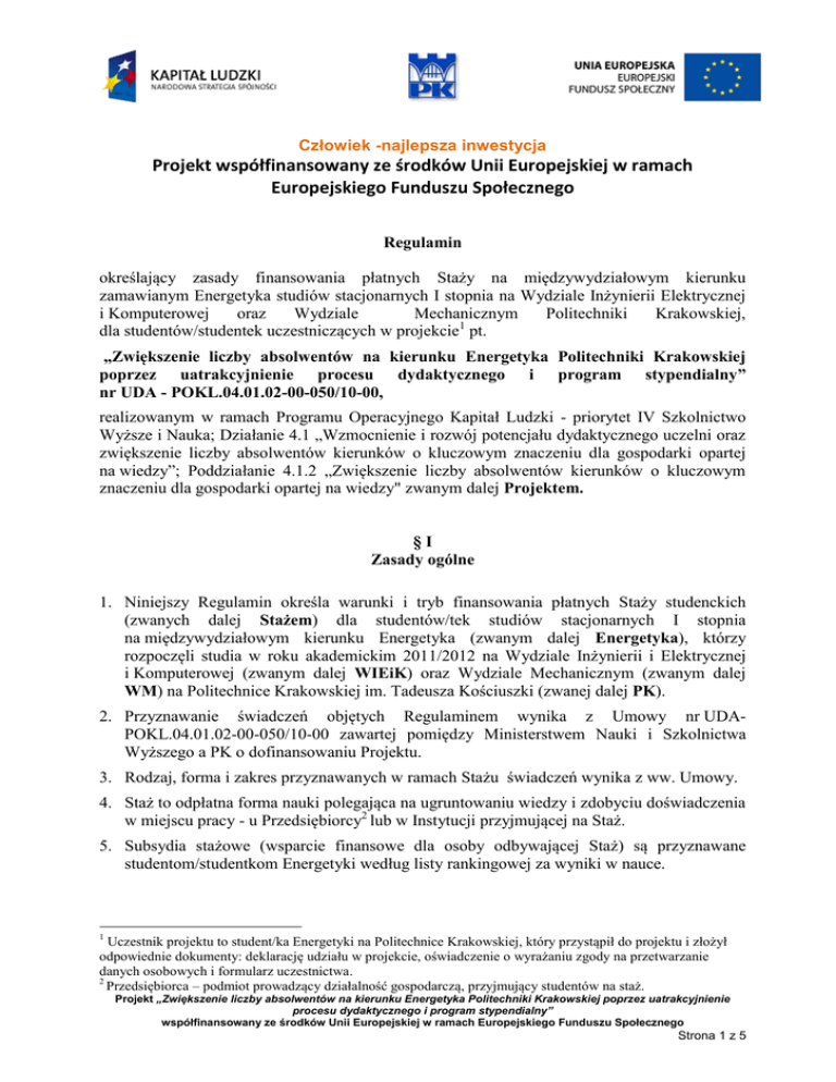 Człowiek -najlepsza inwestycja Projekt współfinansowany ze środków Unii Europejskiej w ramach Europejskiego Funduszu Społecznego Regulamin określający zasady finansowania płatnych Staży na międzywydziałowym kierunku zamawianym Energetyka studiów stacjonarnych I stopnia na Wydziale Inżynierii Elektrycznej i Komputerowej oraz Wydziale Mechanicznym Politechniki Krakowskiej, 1 dla studentów/studentek uczestniczących w projekcie pt. „Zwiększenie liczby absolwentów na kierunku Energetyka Politechniki Krakowskiej poprzez uatrakcyjnienie procesu dydaktycznego i program stypendialny” nr UDA - POKL.04.01.02-00-050/10-00, realizowanym w ramach Programu Operacyjnego Kapitał Ludzki - priorytet IV Szkolnictwo Wyższe i Nauka; Działanie 4.1 „Wzmocnienie i rozwój potencjału dydaktycznego uczelni oraz zwiększenie liczby absolwentów kierunków o kluczowym znaczeniu dla gospodarki opartej na wiedzy”; Poddziałanie 4.1.2 „Zwiększenie liczby absolwentów kierunków o kluczowym znaczeniu dla gospodarki opartej na wiedzy" zwanym dalej Projektem. §I Zasady ogólne 1. Niniejszy Regulamin określa warunki i tryb finansowania płatnych Staży studenckich (zwanych dalej Stażem) dla studentów/tek studiów stacjonarnych I stopnia na międzywydziałowym kierunku Energetyka (zwanym dalej Energetyka), którzy rozpoczęli studia w roku akademickim 2011/2012 na Wydziale Inżynierii i Elektrycznej i Komputerowej (zwanym dalej WIEiK) oraz Wydziale Mechanicznym (zwanym dalej WM) na Politechnice Krakowskiej im. Tadeusza Kościuszki (zwanej dalej PK). 2. Przyznawanie świadczeń objętych Regulaminem wynika z Umowy nr UDAPOKL.04.01.02-00-050/10-00 zawartej pomiędzy Ministerstwem Nauki i Szkolnictwa Wyższego a PK o dofinansowaniu Projektu. 3. Rodzaj, forma i zakres przyznawanych w ramach Stażu świadczeń wynika z ww. Umowy. 4. Staż to odpłatna forma nauki polegająca na ugruntowaniu wiedzy i zdobyciu doświadczenia w miejscu pracy - u Przedsiębiorcy2 lub w Instytucji przyjmującej na Staż. 5. Subsydia stażowe (wsparcie finansowe dla osoby odbywającej Staż) są przyznawane studentom/studentkom Energetyki według listy rankingowej za wyniki w nauce. 1 Uczestnik projektu to student/ka Energetyki na Politechnice Krakowskiej, który przystąpił do projektu i złożył odpowiednie dokumenty: deklarację udziału w projekcie, oświadczenie o wyrażaniu zgody na przetwarzanie danych osobowych i formularz uczestnictwa. 2 Przedsiębiorca – podmiot prowadzący działalność gospodarczą, przyjmujący studentów na staż. Projekt „Zwiększenie liczby absolwentów na kierunku Energetyka Politechniki Krakowskiej poprzez uatrakcyjnienie procesu dydaktycznego i program stypendialny” współfinansowany ze środków Unii Europejskiej w ramach Europejskiego Funduszu Społecznego Strona 1 z 5 6. Warunkiem udziału w Stażu jest zaliczenie semestru piątego w terminie określonym odpowiednim zarządzeniem Rektora PK dot. organizacji roku akademickiego i wpis na listę studentów szóstego semestru. 7. Czas trwania Stażu wynosi 3 miesiące, a okres realizacji przypada na miesiące od lipca do września danego roku akademickiego. 8. Organizatorem Staży jest Biuro Projektu na Wydziale Inżynierii Elektrycznej i Komputerowej, PK ul. Warszawska 24, 31-155 Kraków, pok. 1/4A (zwane dalej Organizatorem). a) Organizacją Staży na WIEiK oraz na WM zajmują się Opiekunowie Stażu (koordynatorzy ds. Staży). b) Opiekunowie powoływani są osobno na WIEiK i WM przez Prodziekanów ds. Energetyki. § II Wymagane dokumenty 1. Kandydat - student/studentka uczestniczący w Projekcie i ubiegający się o wsparcie – przyznanie Stażu, przekazując potrzebne informacje wyraża jednocześnie zgodę na przetwarzanie swoich danych osobowych. 2. Kandydat poświadcza na piśmie znajomość i akceptację niniejszego Regulaminu. 3. Ponadto Kandydat dostarcza: a) kserokopię legitymacji studenckiej, b) Wniosek o przyznanie subsydium stażowego. § III Rekrutacja na Staż 1. Proces rekrutacji na Staże przebiega jednoetapowo. 2. Na bazie złożonych Wniosków o przyznanie subsydium stażowego (Załącznik nr 1 do Regulaminu) w terminie wyznaczonym przez Opiekunów stażu, Organizator przygotowuje Listę Rankingową Kandydatów. 3. Kandydat może ubiegać się o subsydium stażowe jednokrotnie. 4. Informacja o przyjmowaniu zgłoszeń Kandydatów na Staż wraz z określeniem liczby miejsc stażowych będzie umieszczona na tablicy ogłoszeń Dziekanatów WIEiK, WM oraz na stronie internetowej Projektu (www.energetykazamawiana.wieik.pk.edu.pl). 5. Kandydaci mają możliwość zgłaszania swoich propozycji Przedsiębiorstw i/lub Instytucji przyjmujących na Staż, poprzez złożenie u Organizatora we wcześniej podanym do wiadomości terminie „Ankiety potencjalnego Przedsiębiorstwa lub Instytucji przyjmujących na Staż” (Załącznik nr 2 do Regulaminu). 6. Propozycje Przedsiębiorstw lub Instytucji przyjmujących na Staż zgłoszone przez Kandydatów mogą zostać odrzucone, jeśli proponowany zakres Stażu w Przedsiębiorstwie lub Instytucji nie będzie związany z energetyką i/lub elektroenergetyką. Projekt „Zwiększenie liczby absolwentów na kierunku Energetyka Politechniki Krakowskiej poprzez uatrakcyjnienie procesu dydaktycznego i program stypendialny” współfinansowany ze środków Unii Europejskiej w ramach Europejskiego Funduszu Społecznego Strona 2 z 5 7. Niedopuszczalne jest odbywanie Stażu w Przedsiębiorstwie, w którym Kandydat jest zatrudniony. § IV Procedura przyznawania subsydiów stażowych 1. Przebieg procedury przedstawia się następująco: a) Ogłoszenie terminu przyjmowania Wniosków o subsydia stażowe. b) Złożenie u Organizatora Wniosków przez Kandydatów w wyznaczonym terminie. c) Ogłoszenie przez Organizatora Listy Rankingowej, na której podani zostaną wszyscy Kandydaci, którzy złożyli wniosek, ze wskazaniem, którym osobom przysługują subsydia stażowe (§1, pkt. 5)