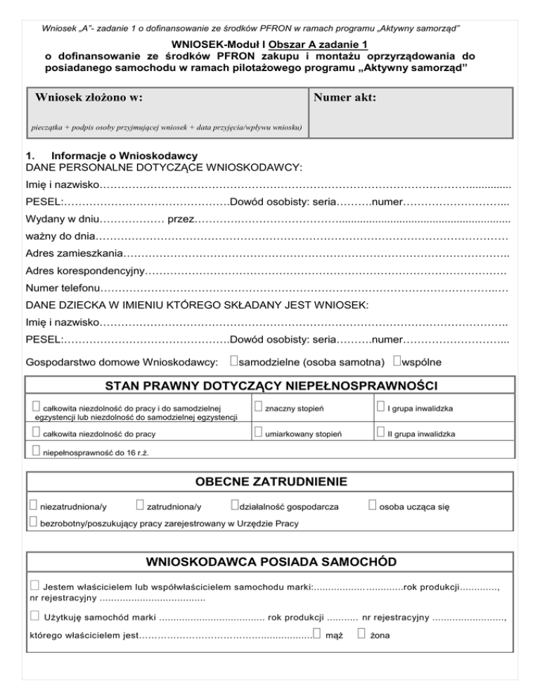 Wniosek „A”- zadanie 1 o dofinansowanie ze środków PFRON w ramach programu „Aktywny samorząd” WNIOSEK-Moduł I Obszar A zadanie 1 o dofinansowanie ze środków PFRON zakupu i montażu oprzyrządowania do posiadanego samochodu w ramach pilotażowego programu „Aktywny samorząd” Wniosek złożono w: Numer akt: pieczątka + podpis osoby przyjmującej wniosek + data przyjęcia/wpływu wniosku) 1. Informacje o Wnioskodawcy DANE PERSONALNE DOTYCZĄCE WNIOSKODAWCY: Imię i nazwisko………………………………………………………………………………………….............. PESEL:……………………………………….Dowód osobisty: seria……….numer………………………... Wydany w dniu……………… przez………….………………………......................................................... ważny do dnia…………………………………………………………………………………………………… Adres zamieszkania…………………………………………………………………………………………….. Adres korespondencyjny………………………………………………………………………………………. Numer telefonu………………………………………………………………………………………………..… DANE DZIECKA W IMIENIU KTÓREGO SKŁADANY JEST WNIOSEK: Imię i nazwisko………………………………………………………………………………………………….. PESEL:……………………………………….Dowód osobisty: seria……….numer………………………... Gospodarstwo domowe Wnioskodawcy: samodzielne (osoba samotna) wspólne STAN PRAWNY DOTYCZĄCY NIEPEŁNOSPRAWNOŚCI całkowita niezdolność do pracy i do samodzielnej znaczny stopień I grupa inwalidzka całkowita niezdolność do pracy niepełnosprawność do 16 r.ż. umiarkowany stopień II grupa inwalidzka egzystencji lub niezdolność do samodzielnej egzystencji OBECNE ZATRUDNIENIE niezatrudniona/y zatrudniona/y działalność gospodarcza bezrobotny/poszukujący pracy zarejestrowany w Urzędzie Pracy osoba ucząca się WNIOSKODAWCA POSIADA SAMOCHÓD Jestem właścicielem lub współwłaścicielem samochodu marki:.................. .............rok produkcji............., nr rejestracyjny ..................................... Użytkuję samochód marki ..................................... rok produkcji ........... nr rejestracyjny ........................., którego właścicielem jest………………………………….................. mąż żona Wniosek „A”- zadanie 1 o dofinansowanie ze środków PFRON w ramach programu „Aktywny samorząd” 2. Specyfikacja przedmiotu dofinansowania ORIENTACYJNA CENA brutto (kwota w zł) Specyfikacja zakupu (rodzaj planowanego oprzyrządowania samochodu) dodatkowe pasy, uchwyty ułatwiające wsiadanie i wysiadanie automatyczna skrzynia biegów, sprzęgło automatyczne, ręczny sterownik sprzęgła elektrohydrauliczne mechanizmy do obniżania i podnoszenia nadwozia specjalne siedzenia elektroniczna obręcz przyspieszenia ręczny gaz – hamulec przedłużenie pedałów sterowanie elektroniczne podnośnik lub najazd do wózka inwalidzkiego przeniesienie dźwigni lub pedałów, przełączników system wspomagania parkowania inne, jakie: RAZEM: 3. Wnioskowana kwota dofinansowania Orientacyjna cena brutto (KWOTA RAZEM Z PKT 2) Kwota wnioskowana (w zł) 4. Informacje o korzystaniu ze środków PFRON Czy Wnioskodawca w ciągu 3 lat przed złożeniem wniosku uzyskał na ten cel pomoc ze środków PFRON Cel (nazwa instytucji, programu i/ lub zadania, w ramach którego przyznana została pomoc) Przedmiot dofinansowania (co zostało zakupione ze środków PFRON) Beneficjent (imię i nazwisko osoby, dla której Wnioskodawca uzyskał środki PFRON) Numer i data zawarcia umowy Termin rozliczenia Czy Wnioskodawca posiada wymagalne zobowiązania wobec PFRON? TAK NIE Kwota przyznana (w zł) Kwota rozliczona przez organ udzielający pomocy (w zł) TAK NIE Strona 2 Wniosek „A”- zadanie 1 o dofinansowanie ze środków PFRON w ramach programu „Aktywny samorząd” 5. Informacje do oceny merytorycznej wniosku INFORMACJE WNIOSKODAWCY PYTANIE / ZAGADNIENIE 1) uzasadnienie wniosku (należy uzasadnić wybór przedmiotu dofinansowania w odniesieniu do posiadanego samochodu) ................................................................................................................ ................................................................................................................ ................................................................................................................ ................................................................................................................ ................................................................................................................ 2) Czy występują szczególne utrudnienia Wnioskodawcy (jakie?) np. pogorszenie stanu zdrowia, konieczność leczenia szpitalnego, skomplikowana sytuacja rodzinna, trudności finansowe, itp. potwierdzone przedstawioną dokumentacją TAK NIE 6. ................................................................................................................ ................................................................................................................ ................................................................................................................ ................................................................................................................ Oświadczenie dotyczące ubiegania się o dofinansowanie ze środków PFRON Oświadczam, iż nie ubiegam się i nie będę ubiegał w danym roku odrębnym wnioskiem o środki PFRON na ten sam cel za pośrednictwem innego Realizatora (na terenie innego samorządu powiatowego) oraz, że posiadam środki w