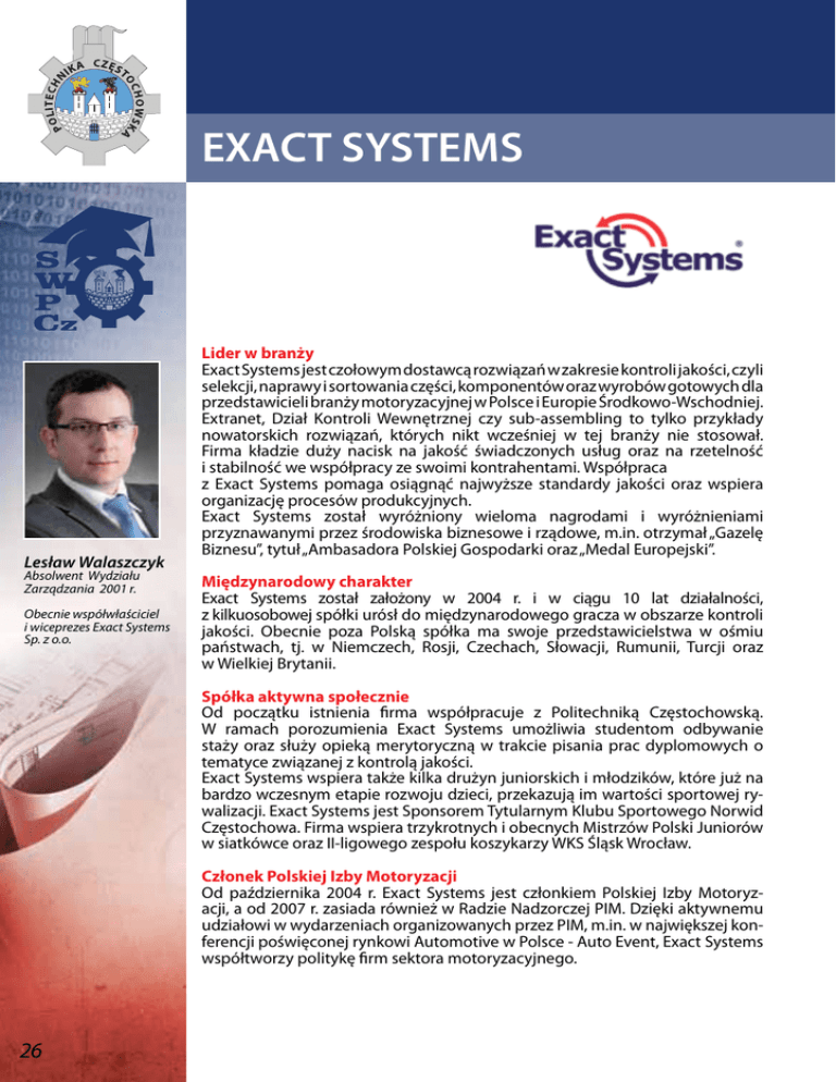 EXACT SYSTEMS Lesław Walaszczyk Absolwent Wydziału Zarządzania 2001 r. Obecnie współwłaściciel i wiceprezes Exact Systems Sp. z o.o. Lider w branży Exact Systems jest czołowym dostawcą rozwiązań w zakresie kontroli jakości, czyli selekcji, naprawy i sortowania części, komponentów oraz wyrobów gotowych dla przedstawicieli branży motoryzacyjnej w Polsce i Europie Środkowo-Wschodniej. Extranet, Dział Kontroli Wewnętrznej czy sub-assembling to tylko przykłady nowatorskich rozwiązań, których nikt wcześniej w tej branży nie stosował. Firma kładzie duży nacisk na jakość świadczonych usług oraz na rzetelność i stabilność we współpracy ze swoimi kontrahentami. Współpraca z Exact Systems pomaga osiągnąć najwyższe standardy jakości oraz wspiera organizację procesów produkcyjnych. Exact Systems został wyróżniony wieloma nagrodami i wyróżnieniami przyznawanymi przez środowiska biznesowe i rządowe, m.in. otrzymał „Gazelę Biznesu”, tytuł „Ambasadora Polskiej Gospodarki oraz „Medal Europejski”. Międzynarodowy charakter Exact Systems został założony w 2004 r. i w ciągu 10 lat działalności, z kilkuosobowej spółki urósł do międzynarodowego gracza w obszarze kontroli jakości. Obecnie poza Polską spółka ma swoje przedstawicielstwa w ośmiu państwach, tj. w Niemczech, Rosji, Czechach, Słowacji, Rumunii, Turcji oraz w Wielkiej Brytanii. Spółka aktywna społecznie Od początku istnienia firma współpracuje z Politechniką Częstochowską. W ramach porozumienia Exact Systems umożliwia studentom odbywanie staży oraz służy opieką merytoryczną w trakcie pisania prac dyplomowych o tematyce związanej z kontrolą jakości. Exact Systems wspiera także kilka drużyn juniorskich i młodzików, które już na bardzo wczesnym etapie rozwoju dzieci, przekazują im wartości sportowej rywalizacji. Exact Systems jest Sponsorem Tytularnym Klubu Sportowego Norwid Częstochowa. Firma wspiera trzykrotnych i obecnych Mistrzów Polski Juniorów w siatkówce oraz II-ligowego zespołu koszykarzy WKS Śląsk Wrocław. Członek Polskiej Izby Motoryzacji Od października 2004 r. Exact Systems jest członkiem Polskiej Izby Motoryzacji, a od 2007 r. zasiada również w Radzie Nadzorczej PIM. Dzięki aktywnemu udziałowi w wydarzeniach organizowanych przez PIM, m.in. w największej konferencji poświęconej rynkowi Automotive w Polsce - Auto Event, Exact Systems współtworzy politykę firm sektora motoryzacyjnego. 26