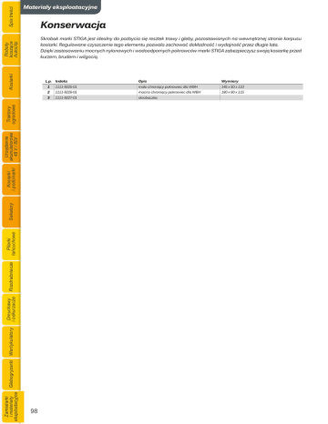 Konserwacja Skrobak marki STIGA jest idealny do pozbycia się resztek trawy i gleby, pozostawionych na wewnętrznej stronie korpusu kosiarki. Regulowane czyszczenie tego elementu pozwala zachować dokładność i wydajność przez długie lata. Dzięki zastosowaniu mocnych nylonowych i wodoodpornych pokrowców marki STIGA zabezpieczysz swoją kosiarkę przed kurzem, brudem i wilgocią. Kosiarki Roboty koszące Autoclip Spis treści Materiały eksploatacyjne Zamiatarki i materiały Glebogryzarki Wertykulatory eksploatacyjne Dmuchawy i odkurzacze Rozdrabniacze Pilarki łańcuchowe Sekatory Kosiarki i podcinarki Urządzenia akumulatorowe 48 V / 80V Traktory ogrodowe L.p. �� 98 Indeks Opis Wymiary 1 ������������ mało chroniący pokrowiec dla ��� ��� � �� � ��� 2 ������������ mocno chroniący pokrowiec dla ��� ��� � �� � ��� 3 ������������ skrobaczka