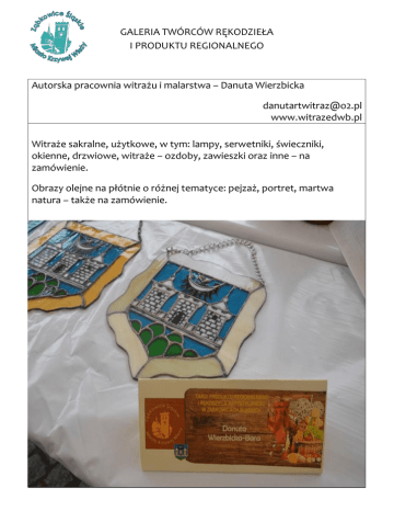 GALERIA TWÓRCÓW RĘKODZIEŁA I PRODUKTU REGIONALNEGO Autorska pracownia witrażu i malarstwa – Danuta Wierzbicka [email protected] www.witrazedwb.pl Witraże sakralne, użytkowe, w tym: lampy, serwetniki, świeczniki, okienne, drzwiowe, witraże – ozdoby, zawieszki oraz inne – na zamówienie. Obrazy olejne na płótnie o różnej tematyce: pejzaż, portret, martwa natura – także na zamówienie.