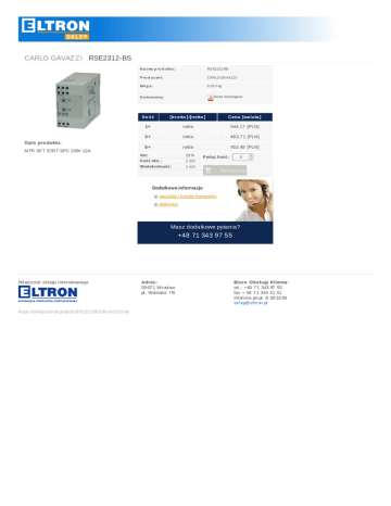 CARLOGAVAZ Z IRSE2312-BS N a z wa p ro d u ktu : RS E2312-BS P ro d u c en t: CARLOGAVAZ Z I Wa g a : 0.26 3kg Ka rta ka ta logowa D o ku m en ty: O pis pro duktu: MTRSFTSTRTSPC230V12A Ilo ś ć [brutto ] /[netto ] Cena [wa luta ] 1+ netto 544,17 [PLN] 3+ netto 48 3,7 1[PLN] 5+ netto 453,48 [PLN] Vat: Ilośćmin.: Wielokrotność: 23% 1sz t. 1sz t. Pod ajIlość: 0 + - dokosz yka Maszdodatkowepytania? +48713439755 Wł aści ci el skl epui nter netowego: https://skl ep.el tr on.pl /pl /p/18 5122193519/r se2312-bs Adres : 50-07 1Wr ocł aw pl .Wol ności 7 B Biuro O bs ługiKlienta : tel .:+48 7 134397 55 fax+48 7 13441141 Infol i ni apn-pt.8 .00-16.00 skl ep@ el tr on.pl