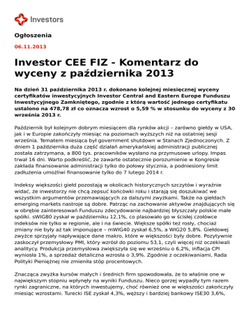 Ogłoszenia 06.11.2013 Investor CEE FIZ - Komentarz do wyceny z października 2013 Na dzień 31 października 2013 r. dokonano kolejnej miesięcznej wyceny certyfikatów inwestycyjnych Investor Central and Eastern Europe Funduszu Inwestycyjnego Zamkniętego, zgodnie z którą wartość jednego certyfikatu ustalono na 478,78 zł co oznacza wzrost o 5,59 % w stosunku do wyceny z 30 września 2013 r. Październik był kolejnym dobrym miesiącem dla rynków akcji – zarówno giełdy w USA, jak i w Europie zakończyły miesiąc na poziomach wyższych niż na ostatniej sesji września. Tematem miesiąca był government shutdown w Stanach Zjednoczonych. Z dniem 1 października duża część działań amerykańskiej administracji publicznej została zatrzymana, a 800 tys. pracowników wysłano na przymusowe urlopy. Impas trwał 16 dni. Warto podkreślić, że zawarte ostatecznie porozumienie w Kongresie zakłada finansowanie administracji tylko do połowy stycznia, a podniesiony limit zadłużenia umożliwi finansowanie tylko do 7 lutego 2014 r. Indeksy większości giełd pozostają w okolicach historycznych szczytów i wyraźnie widać, że inwestorzy nie chcą zepsuć końcówki roku i starają się doszukiwać we wszystkim argumentów przemawiających za dalszymi zwyżkami. Także na giełdach emerging markets nastroje są dobre. Patrząc na zachowanie aktywów znajdujących się w obrębie zainteresowań Funduszu zdecydowanie najbardziej błyszczały polskie małe spółki. sWIG80 zyskał w październiku 12,1%, co plasowało go w ścisłej czołówce indeksów nie tylko w regionie, ale i na świecie. Większe spółki też rosły, chociaż zmiany nie były aż tak imponujące – mWIG40 zyskał 6,5%, a WIG20 5,8%. Giełdowej zwyżce sprzyjały napływające dane makro, które w większości były dobre. Pozytywnie zaskoczył przemysłowy PMI, który wzrósł do poziomu 53,1, czyli więcej niż oczekiwali analitycy. Produkcja przemysłowa zwiększyła się we wrześniu o 6,2%, inflacja CPI wyniosła 1%, a sprzedaż detaliczna wzrosła o 3,9%. Zgodnie z oczekiwaniami, Rada Polityki Pieniężnej nie zmieniła stóp procentowych. Znacząca zwyżka kursów małych i średnich firm spowodowała, że to właśnie one w największym stopniu wpłynęły na wyniki Funduszu. Nieco gorzej wypadły tym razem rynki zagraniczne, na których inwestujemy, choć również one w większości zakończyły miesiąc wzrostami. Turecki ISE zyskał 4,3%, węższy i bardziej bankowy ISE30 3,6%, rosyjskie RTS, RTS2 i Micex rosły odpowiednio o 4,1% , 1,2% i 3,2%, a bułgarski Sofix spadł o symboliczne 0,07%. Nasze wyniki były zbliżone do stóp zwrotu z indeksów (trochę lepsze w Rosji, nieznacznie gorsze w Turcji). Podtrzymujemy naszą opinię, że końcówka roku nie będzie zła. Wydaje nam się jednak, że po tak silnych wzrostach rynkowi należy się mały odpoczynek (raczej w formie trendu bocznego niż silnych spadków).
