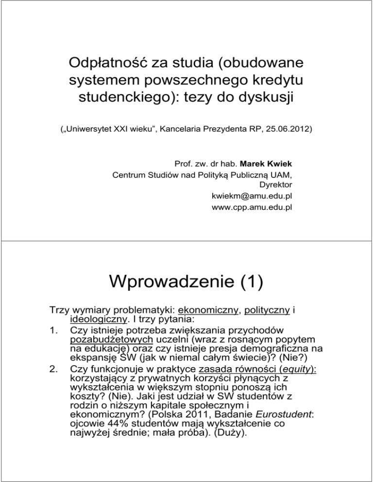 Odpłatność za studia (obudowane systemem powszechnego kredytu studenckiego): tezy do dyskusji („Uniwersytet XXI wieku”, Kancelaria Prezydenta RP, 25.06.2012) Prof. zw. dr hab. Marek Kwiek Centrum Studiów nad Polityką Publiczną UAM, Dyrektor [email protected] www.cpp.amu.edu.pl Wprowadzenie (1) Trzy wymiary problematyki: ekonomiczny, polityczny i ideologiczny. I trzy pytania: 1. Czy istnieje potrzeba zwiększania przychodów pozabudżetowych uczelni (wraz z rosnącym popytem na edukację) oraz czy istnieje presja demograficzna na ekspansję SW (jak w niemal całym świecie)? (Nie?) 2. Czy funkcjonuje w praktyce zasada równości (equity): korzystający z prywatnych korzyści płynących z wykształcenia w większym stopniu ponoszą ich koszty? (Nie). Jaki jest udział w SW studentów z rodzin o niższym kapitale społecznym i ekonomicznym? (Polska 2011, Badanie Eurostudent: ojcowie 44% studentów mają wykształcenie co najwyżej średnie; mała próba). (Duży). Wprowadzenie (2) 3. Czy wprowadzenie opłat za czesne ma podłoże ideologiczne: system opłat jest elementem szerszego systemu rynkowego (quasirynkowego) w SW? (Tak?) Każda dyskusja publiczna będzie miała przynajmniej powyższe trzy wymiary: jaki będzie po wprowadzeniu opłat za czesne stan finansów uczelni (wzrosną?), poziom równości dostępu (spadnie?), i poziom urunkowienia systemu SW (wzrośnie). Dodatkowy wymiar w Polsce to demografia (kurczenie się systemu 2010-2025) i dynamika prywatne-publiczne (rozbieżne interesy obydwu sektorów). Kontekst (1) – udział opłat dyd. w przychodach wybranych uczelni Kontekst (2) – struktura kierunków studiów, sektor prywatny Kontekst (3) – demografia, malejąca populacja młodzieży w wieku 19-24 lata Kontekst (4) – międzypokoleniowe dziedziczenie wykształcenia, szansa w % (dziecko wyższe → rodzice podstawowe, EU SILC) Kontekst (5) – międzypokoleniowe dziedziczenie wykształcenia, szansa w % (dziecko wyższe → rodzice wyższe, EU SILC) Tezy do dyskusji (1) 1. 2. Wprowadzenie powszechnego systemu odpłatności za studia (= współodpłatności w sektorze publicznym) jest elementem gry o sumie zerowej: to nowy strumień finansowy, ale nie wyższe finansowanie uczelni (państwo jednocześnie, z czasem, obniża swój udział w finansowaniu SW – zwiększa się udział finansowania przez studentów i ich rodzin)? Współodpłatność a demografia 2010-2025: zwiększa szansę przetrwania większej części sektora prywatnego? Współodpłatność jako najważniejszy element pakietu pomocowego dla tego sektora (drugi element to subsydiowanie studiów dziennych w sektorze prywatnym)? Poważny aspekt polityczny. Tezy do dyskusji (2) 3. Argumenty ideologiczne (urynkowienie) stojące za lub przeciw wprowadzeniu współodpłatności są równie ważne jak argumenty finansowe i polityczne. 4. Z finansowej perspektwy uczelni źródła finansowania są niestotne pod warunkiem utrzymywania stałego (lub rosnącego) poziomu finansowania. Z perspektywy państwa i polityki publicznej zmiana strumieni przychodów definiuje rolę SW w społecznej dystrybucji wykształcenia i dystrybucji płynących zeń dóbr prywatnych oraz w międzypokoleniowej ruchliwości społecznej. Tezy do dyskusji (3) 5. Rośnie rola dyfuzji polityk publicznych (w tym polityki SW) z organizacji ponadnarodowych i globalnych do państwa narodowych: rozwiązania w finansowaniu SW w Polsce pozostają kontekście zmian (zwłaszcza) europejskich. Europa myśli o powszechnym czesnym (16 krajów), ale oferuje potężną pomoc bezzwrotną? 6. W ramach logiki konkurencji (obowiązującej w kurczących się systemach) – i zajmującej miejsce logiki współpracy międzysektorowej – każda zmiana systemowa niesie konsekwencje dla obydwu sektorów (prywtanego i publicznego). Jednak na dłuższą metę, polityka publiczna jest odpowiedzialna za stabilność finansową sektora publicznego – tylko tam działa trójkąt edukacja – badania naukowe – innowacje? Tezy do dyskusji (4) 7. W perspektywie historycznej, sektor prywatny może być zjawiskiem przejściowym, powstałym w celu zaspokojenia popytu potężnego wyżu demograficznego (demandabsorbing growth). Wraz z systematycznym kurczeniem się całości systemu w latach 2010-2025 i później, sektor prywatny musi szukać nowych klientów (np. starsi, pracujący studenci, specjalistyczne studia podyplomowe)? 8. Dyskuje na temat wprowadzenia współodpłatności powinny brać pod uwagę przede wszystkim długoterminowe dobro publicznego SW jako twardego jądra systemu, na którego obrzeżach pozostaje sektor prywatny (wyjątki: półelitarny podsystem 15-20 uczelni). Krótkoterminowe uleganie ideologii „zdrowej konkurencji” międzysektorowej i „zasadom rynkowym” w SW (rektorzy PSW) może prowadzić do długoterminowej zapaści jądra systemu poprzez dekoncentrację środków? Tezy do dyskusji (5) 9. W Polsce nadal istnieje niska międzypokoleniowa ruchliwość społeczna – poziom dziedzicznia wykształcenia (wyższe/wyższe) i zawodów (white collar/white collar) należy do najwyższych w Europie. Równy dostęp do SW musi się radykalnie zwiększać (czyli struktura społeczna studentów musi przypominać strukturę społeczną całości społeczeństwa jeśli udział niższych warstw społecznych w dobrach prywatnych płynących z wykształcenia ma się zwiększać). Czy pomaga w tym aktualny/przyszły otwarty dostęp do bezpłatnego (tax-based) SW? (Tak.) Tezy do dyskusji (6) 10. Struktura studiów wedle kierunków w Polsce jest nieadekwatna w stosunku do potrzeb społecznych i gospodarczych. Nierównowaga systemowa podaży i popytu absolwentów na rynku pracy wedle kierunków studiów prowadzi do niedopasowania poziomego, pionowego lub bezrobocia. Zróżnicowane opłaty za czesne zmienią strukturę studiów: zwiążą na stałe zwrot z inwestycji w edukację wedle kierunku studiów, z zarobkami absolwentów. Dzisiaj zwrot ten (wliczają