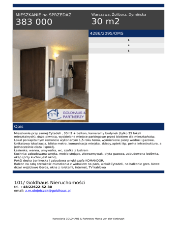 MIESZKANIE na SPRZEDAŻ 383 000 Warszawa, Żoliborz, Dymińska 30 m2 4286/2095/OMS 1 4 1 Opis Mieszkanie przy samej Cytadeli , 30m2 + balkon, kameralny budynek (tylko 25 lokali mieszkalnych), duża piwnica, wydzielone miejsce parkingowe przed blokiem dla mieszkańców. Lokal po kapitalnym remoncie wykonanym 1,5 roku temu, wymienione piony wodne i gazowe, Unikatowa lokalizacja, blisko metro, komunikacja miejska, sklepy,apteki itp. pełna infrastruktura, a jednocześnie cisza i spokój. Łazienka; wanna, umywalka, wc, szafka z lustrem Kuchnia: zabudowana wnęka, meble stojące, zlewozmywak, płyta gazowa, zabudowana lodówka, okap (przy kuchni jest okno), Pokój deska barlinecka i zabudowa wnęki szafa KOMANDOR, Balkon na całą szerokość mieszkania z widokiem na park, wokół Cytadeli, na balkonie gres. Nowe drzwi wejściowe Gerda, okna z roletami, internet, TV kablowa 101/ Goldhaus Nieruchomości tel. +48/22622-52-30 email: [email protected] Kancelaria GOLDHAUS & Partnerzy Marco von der Vanbrugh Powered by TCPDF (www.tcpdf.org)