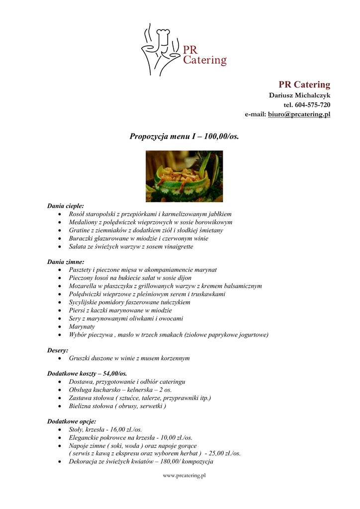PR Catering Dariusz Michalczyk tel. 604-575-720 e-mail: [email protected] Propozycja menu I – 100,00/os. Dania ciepłe: Rosół staropolski z przepiórkami i karmelizowanym jabłkiem Medaliony z polędwiczek wieprzowych w sosie borowikowym Gratine z ziemniaków z dodatkiem ziół i słodkiej śmietany Buraczki glazurowane w miodzie i czerwonym winie Sałata ze świeżych warzyw z sosem vinaigrette Dania zimne: Pasztety i pieczone mięsa w akompaniamencie marynat Pieczony łosoś na bukiecie sałat w sosie dijon Mozarella w płaszczyku z grillowanych warzyw z kremem balsamicznym Polędwiczki wieprzowe z pleśniowym serem i truskawkami Sycylijskie pomidory faszerowane tuńczykiem Piersi z kaczki marynowane w miodzie Sery z marynowanymi oliwkami i owocami Marynaty Wybór pieczywa , masło w trzech smakach (ziołowe paprykowe jogurtowe) Desery: Gruszki duszone w winie z musem korzennym Dodatkowe koszty – 54,00/os. Dostawa, przygotowanie i odbiór cateringu Obsługa kucharsko – kelnerska – 2 os. Zastawa stołowa ( sztućce, talerze, przyprawniki itp.) Bielizna stołowa ( obrusy, serwetki ) Dodatkowe opcje: Stoły, krzesła - 16,00 zł./os. Eleganckie pokrowce na krzesła - 10,00 zł./os. Napoje zimne ( soki, woda ) oraz napoje gorące ( serwis z kawą z ekspresu oraz wyborem herbat ) - 25,00 zł./os. Dekoracja ze świeżych kwiatów – 180,00/ kompozycja www.prcatering.pl Dodatkowe informacje: Istnieje możliwość wykonania usługi w ogrodzie z namiotami lub w formie bufetów połączonych z serwisem – koszt ustalany indywidualnie www.prcatering.pl
