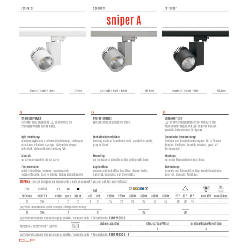 reflektor spotlight reflector sniper A długość /length / Länge 125,0mm szerokość / width / Breite PL 165,0mm wysokość / height / Höhe EN 190,0mm DE Charakterystyka: reflektor typu shoplight LED, do montażu na szynoprzewodzie lub na bazie. Characteristics: LED spotlight, mounted on track. Charakteristik: LED-Stromschienenstrahler mit Gehäuse von Aluminiumdrukguß, mit LED-Chip von OSRAM, Vossloh-Schwabe oder Bridgelux. Opis techniczny: obudowa wykonana z odlewu aluminiowego, malowane proszkowo w kolorze czarnym, białym lub szarym, odbłyśnik, statecznik elektroniczny EVG. Technical description: housing made of aluminum mold, painted on white, grey or black. Technische Beschreibung: Gehäuse aus Aluminiumdruckguss, Mit 3-Phasen Adaptor, Verfügbar in weiß, schwarz, grau. Mit Betriebsgerät. Montaż: na szynoprzewodzie lub na bazie. Mounting: on the track or directly on the ceiling with base. Montage: auf einer Stromschiene oder Basis. Zastosowanie: obiekty handlowe, biurowe, pomieszczenia reprezentacyjne, galerie, muzea, salony samochodowe. Application: commercial and office facilities, elegant halls, galleries, museums, car showrooms. Anwendung: Handels-und Büroobjekte, Repräsentationsräume, Galerien, Museum, Autohaus. SNIPER A - wersja dostępna na zamówienia / only on request / Version auf Anfrage verfügbar w type product Reflector SNIPER A white grey black >80 >90 2500K 2700K 3000K 3500K 4000K 5000K R SNA 1 2 3 8 9 25 27 30 35 40 50 20 ° 30 ° 45 ° 20 30 lm max 48W max 6210lm 45 przykład zamawiania/ order example /Beispielbestellung R SNA 2 9 35 30 przykład oznaczenia zamawianego produktu / example code / Beispielcode: RSNA293530 akcesoria / accessories / Zubehör szyba/glass/Glas mleczna/opal/Milch mrożona/frozen/Eingefroren 1 2 3 przykład oznaczenia zamawianego produktu / example code / Beispielcode: RSNA293530 - 1 Clf reflektor spotlight reflector sniper A SNIPER A w lm lm w kg RSNAx83020 >80 3000K 20 ° max 48W max 5980lm RSNAx93020 >90 3000K 20 ° max 48W max 4850lm 1,4 RSNAx84020 >80 4000K 20 ° max 48W max 6210lm RSNAx94020 >90 4000K 20 ° max 48W max 5320lm 1,4 RSNAx83030 >80 3000K 30 ° max 48W max 5980lm RSNAx93030 >90 3000K 30 ° max 48W max 4850lm 1,4 RSNAx84030 >80 4000K 30 ° max 48W max 6210lm RSNAx94030 >90 4000K 30 ° max 48W max 5320lm 1,4 RSNAx83045 >80 3000K 45 ° max 48W max 5980lm RSNAx93045 >90 3000K 45 ° max 48W max 4850lm 1,4 RSNAx84045 >80 4000K 45 ° max 48W max 6210lm RSNAx94045 >90 4000K 45 ° max 48W max 5320lm 1,4 kolor / color / Farbe follow the light RSNA..84045 1 biały/white/weiss 2 szary/grey/grau 3 czarny/black/schwarz SHOPPING MALL SUPER MARKETS OFFICE MUSEUM CAR SHOWROOMS CLF