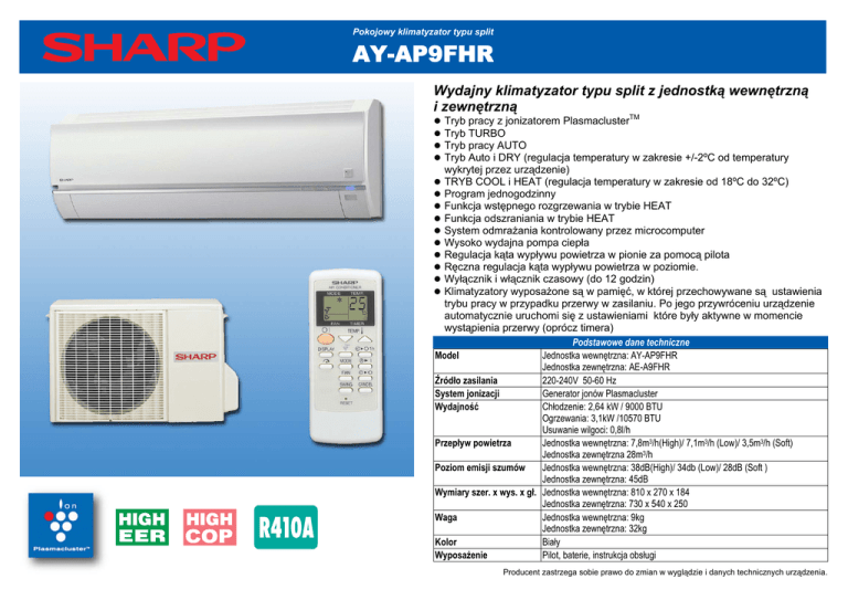 Pokojowy klimatyzator typu split AY-AP9FHR Wydajny klimatyzator typu split z jednostką wewnętrzną i zewnętrzną Tryb pracy z jonizatorem PlasmaclusterTM Tryb TURBO Tryb pracy AUTO Tryb Auto i DRY (regulacja temperatury w zakresie +/-2ºC od temperatury wykrytej przez urządzenie) TRYB COOL i HEAT (regulacja temperatury w zakresie od 18ºC do 32ºC) Program jednogodzinny Funkcja wstępnego rozgrzewania w trybie HEAT Funkcja odszraniania w trybie HEAT System odmrażania kontrolowany przez microcomputer Wysoko wydajna pompa ciepła Regulacja kąta wypływu powietrza w pionie za pomocą pilota Ręczna regulacja kąta wypływu powietrza w poziomie. Wyłącznik i włącznik czasowy (do 12 godzin) Klimatyzatory wyposażone są w pamięć, w której przechowywane są ustawienia trybu pracy w przypadku przerwy w zasilaniu. Po jego przywróceniu urządzenie automatycznie uruchomi się z ustawieniami które były aktywne w momencie wystąpienia przerwy (oprócz timera) Podstawowe dane techniczne Model Jednostka wewnętrzna: AY-AP9FHR Jednostka zewnętrzna: AE-A9FHR Źródło zasilania 220-240V 50-60 Hz System jonizacji Generator jonów Plasmacluster Wydajność Chłodzenie: 2,64 kW / 9000 BTU Ogrzewania: 3,1kW /10570 BTU Usuwanie wilgoci: 0,8l/h Przepływ powietrza Jednostka wewnętrzna: 7,8m3/h(High)/ 7,1m3/h (Low)/ 3,5m3/h (Soft) Jednostka zewnętrzna 28m3/h Poziom emisji szumów Jednostka wewnętrzna: 38dB(High)/ 34db (Low)/ 28dB (Soft ) Jednostka zewnętrzna: 45dB Wymiary szer. x wys. x gł. Jednostka wewnętrzna: 810 x 270 x 184 Jednostka zewnętrzna: 730 x 540 x 250 Waga Jednostka wewnętrzna: 9kg Jednostka zewnętrzna: 32kg Kolor Biały Wyposażenie Pilot, baterie, instrukcja obsługi Producent zastrzega sobie prawo do zmian w wyglądzie i danych technicznych urządzenia.