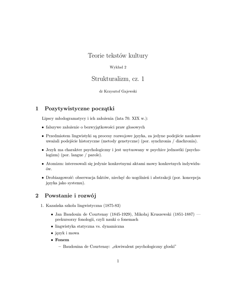 Teorie tekstów kultury Wykład 2 Strukturalizm, cz. 1 dr Krzysztof Gajewski 1 Pozytywistyczne początki Lipscy młodogramatycy i ich założenia (lata 70. XIX w.): • fałszywe założenie o bezwyjątkowości praw głosowych • Przedmiotem lingwistyki są procesy rozwojowe języka, za jedyne podejście naukowe uważali podejście historyczne (metody genetyczne) (por. synchronia / diachronia). • Jezyk ma charakter psychologiczny i jest usytuowany w psychice jednostki (psychologizm) (por. langue / parole). • Atomizm: interesowali się jedynie konkretnymi aktami mowy konkretnych indywiduów. • Drobiazgowość: obserwacja faktów, niechęć do uogólnień i abstrakcji (por. koncepcja języka jako systemu). 2 Powstanie i rozwój 1. Kazańska szkoła lingwistyczna (1875-83) • Jan Baudouin de Courtenay (1845-1929), Mikołaj Kruszewski (1851-1887) — prekursorzy fonologii, czyli nauki o fonemach • lingwistyka statyczna vs. dynamiczna • język i mowa • Fonem – Baudouina de Courtenay: „ekwiwalent psychologiczny głoski” 1 Strukturalizm, cz. 1 – Szkoła Praska: „zespół fonologicznych cech dystynktywnych traktowanych jako atrybuty elementarnej jednostki struktury fonologicznej” – Encyklopedia Językoznawstwa Ogólnego: „najmniejsza niepodzielna na następujące po sobie cechy dystynktywne jednostka planu wyrażania” • Allofon to wariant fonemu (głoska) 2. Ferdinand de Saussure (1857-1913) • Kurs językoznawstwa ogólnego (Cours de linguistique générale), 1916. Rozprawa powstała na podstawie notatek studentów z jego wykładów z lat 1906-1911 na Uniwersytecie Genewskim. • Przedmiot językoznawstwa wg de Saussure’a to język (langue) Mowa (langage): (a) Mowa jednostkowa (parole) — konkretny, jednostkowy akt wypowiedzi (b) Język (langue) — abstrakcyjny i społeczny, posiada charakter systemowy (przykład z partią szachów) i. Synchronia — stan języka (mieści się w świadomości zbiorowej) A. stan języka B. mieści się w świadomości zbiorowej C. składniki językowe tworzą system ii. Diachronia A. faza rozwoju języka B. nie dostrzegane przez świadomość zbiorową C. składniki językowe następują po sobie i nie tworzą systemu • Język jest systemem: znaczenie i funkcja znaku zależy od miejsca w systemie (tak jak wartość figury na szachownicy zależy od jej położenia). • Język nie jest substancją, lecz formą. • Znak językowy jest arbitralny. • Budowa znaku: signifié et signifiant, znaczone i znaczące • Projekt uniwersalnej nauki o znakach — semiologii • Stosunki syntagmantyczne i paradygmatyczne 3. Praskie Koło Lingwistyczne • Roman Jakobson (1896-1982), Mikołaj Trubiecki, Jan Mukařovský, Franciszek Vodička, Piotr Bogatyriew • Wprowadzili do użytku termin „struktura” • Teoria dzieła literackiego Teorie tekstów kultury 2 Strukturalizm, cz. 1 – Utwór literacki ma charakter semiotyczny, czyli uczestniczy w procesie komunikacji społecznej. – Każdy element dzieła literackiego jest nacechowany znaczeniowo. – Jednostkowa wypowiedź literacka realizuje możliwości systemowe pewnego języka poetyckiego. – Synchronia i diachronia • Koncepcja języka poetyckiego – podsystem nadbudowany na systemie języka naturalnego – Język poetycki należy interpretowaś w odniesieniu do języka literackiego oraz tradycji literackiej. – Dominującą funkcją języka poetyckiego jest funkcja estetyczna. • Proces historycznoliteracki – Pisarz w zasadzie realizuje możliwości systemu literackiego w danym momencie, jednak czasem poza niego wykracza. Jeśli owa jednostkowa innowacja upowszechni się, wówczas modyfikuje się system; następuje tym samym ewolucja języka literackiego i literatury. • Wersologia, stylistyka, socjologia literatury (teatr, film, malarstwo, architektura, sztuki użytkowe). 4. Kopenhaska szkoła strukturalistyczna (Louis Hjelmslev) • Odróżniali plan wyrażania i plan treści. • Zarówno w planie wyrażania, jak i w planie treści daje się wyróżnić substancja i forma. • Uprawiali glossematykę (od słowa glossem, czyli morfem, najmniejsza cząstka języka posiadająca zarówno plan wyrażania, jak i plan treści). 5. Amerykańska szkoła strukturalistyczna (Leonard Bloomfield, Franz Boas, Eduard Sapir) • Praktyczne potrzeby opisania ginących języków rdzennej Ameryki • Behawioryzm jako lek na psychologizm (teoria bodźca i reakcji). • Dystrybucjonalizm — nacisk na analizę wstępną: substytucja, segmentacja i klasyfikacja. Literatura [1] Red. K. Polański, Encyklopedia językoznawstwa ogólnego, Wrocław 2003. Teorie tekstów kultury 3 Strukturalizm, cz. 1 [2] M. Głowiński, T. Kostkiewiczowa, A. Okopień-Sławińska, J. Sławiński, Słownik terminów literackich, Wrocław 1998. Teorie tekstów kultury 4