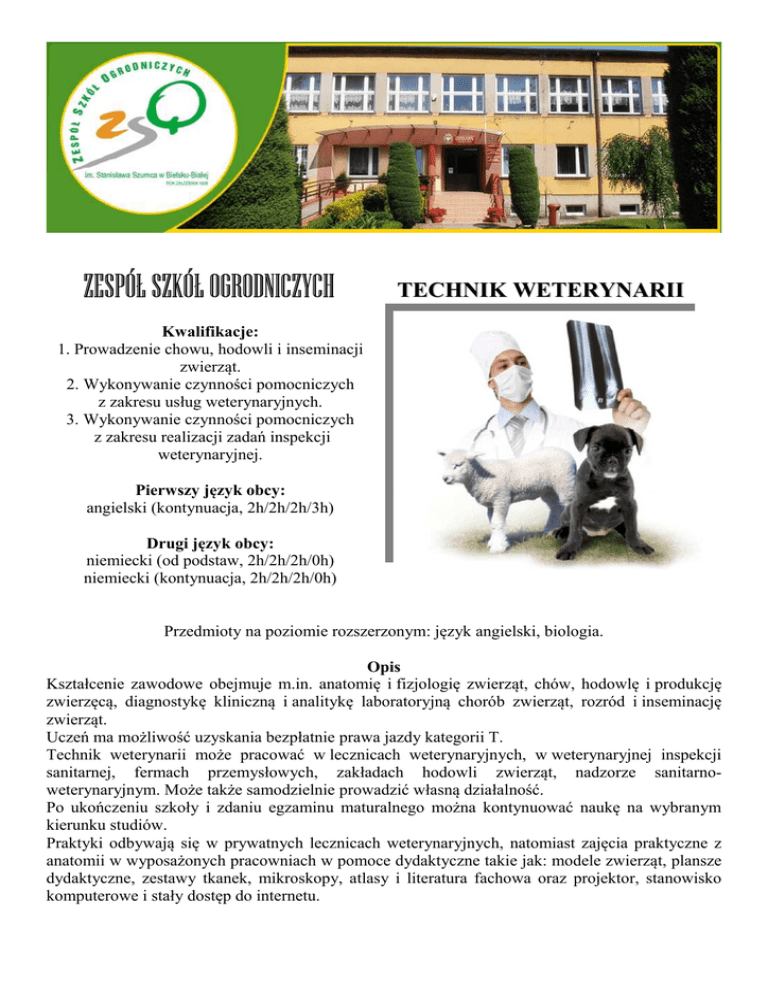 ZESPÓŁ SZKÓŁ OGRODNICZYCH TECHNIK WETERYNARII Kwalifikacje: 1. Prowadzenie chowu, hodowli i inseminacji zwierząt. 2. Wykonywanie czynności pomocniczych z zakresu usług weterynaryjnych. 3. Wykonywanie czynności pomocniczych z zakresu realizacji zadań inspekcji weterynaryjnej. Pierwszy język obcy: angielski (kontynuacja, 2h/2h/2h/3h) Drugi język obcy: niemiecki (od podstaw, 2h/2h/2h/0h) niemiecki (kontynuacja, 2h/2h/2h/0h) Przedmioty na poziomie rozszerzonym: język angielski, biologia. Opis Kształcenie zawodowe obejmuje m.in. anatomię i fizjologię zwierząt, chów, hodowlę i produkcję zwierzęcą, diagnostykę kliniczną i analitykę laboratoryjną chorób zwierząt, rozród i inseminację zwierząt. Uczeń ma możliwość uzyskania bezpłatnie prawa jazdy kategorii T. Technik weterynarii może pracować w lecznicach weterynaryjnych, w weterynaryjnej inspekcji sanitarnej, fermach przemysłowych, zakładach hodowli zwierząt, nadzorze sanitarnoweterynaryjnym. Może także samodzielnie prowadzić własną działalność. Po ukończeniu szkoły i zdaniu egzaminu maturalnego można kontynuować naukę na wybranym kierunku studiów. Praktyki odbywają się w prywatnych lecznicach weterynaryjnych, natomiast zajęcia praktyczne z anatomii w wyposażonych pracowniach w pomoce dydaktyczne takie jak: modele zwierząt, plansze dydaktyczne, zestawy tkanek, mikroskopy, atlasy i literatura fachowa oraz projektor, stanowisko komputerowe i stały dostęp do internetu.