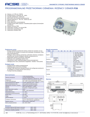 MANOMETRY CYFROWE I PRZETWORNIKI NISKICH CIŚNIEŃ PROGRAMOWALNE PRZETWORNIKI CIŚNIENIA I RÓŻNICY CIŚNIEŃ P26 Zakresy: od 10Pa do 100kPa Konfigurowany w zakresie 40...100% Wysoka dokładność i stabilność Brak dryftu zera (funkcja autozerowania) Sygnał wyjściowy 0...10V, 0/4...20mA lub ±5V Mała histereza Duża odporność na przeciążenia Konfigurowana stała czasowa i charakterystyka wyjścia (liniowa/pierwiastkowa) Stopień ochrony IP65 Opcjonalny montaż z na szynie DIN Opcjonalny wyświetlacz LCD Opcjonalny interfejs USB Podstawowe cechy: • Bardzo dokładany przetwornik różnicy ciśnień do montażu na szynie DIN lub do montażu na ścianie (do wentylacji, klimatyzacji, instalacji przemysłowych) • Dostępne różne zakresy pomiarowe, jednostki ciśnienia i przepływu powietrza jak również dostępne zakresy symetryczne (±). • Skalowalne zakresy pomiarowe i jednostki. • Kalibracja zera zapobiega dryfowi zera. • Wbudowany zawór zabezpieczający przed przeciążeniem • Wielojęzyczne menu (niemieckie /angielskie / włoskie / francuskie) Sposób zamawiania Dostępne opcje • Konfigurowane wyjścia przekaźnikowe • Kalibracja zera za pomocą interfejsu • Interfejs USB (darmowe oprogramowanie do konfiguracji przetwornika dostępne na naszej stronie www.acse.pl • Funkcja miernika przepływu Dokładność P26Sygnał - - Przyłącze ciśnieniowe Stopień ochrony Normy bezpieczeństwa - 24ACDC 24AC 230/115 Zakres pomiarowy ... S 2 0 LC Wyświetlacz 0 1 2 Wyjście 0 U0 0X UX 0...10V (RL ≥ 2kΩ) 0...20mA (RL≤500Ω) 4...20mA (RL≤500Ω) ±5V (RL ≥ 2kΩ) 24VAC/DC 24VAC 230/115VAC Pa, kPa, mbar ±0.5% (min. 0.3Pa) ±0.2% (min. 0.3Pa) Brak LCD i klawiatura Brak Wyjście impulsowe 2 przekaźniki Brak USB Zewn. kalibracja zera Kalibracja zera + USB Wymiary 164 149.5±1.5 6.5 6.5 76 Dokładność (0.3Pa błąd kalibracji) Dryft temperaturowy zakresu Dryft temperaturowy zera Maksymalne ciśnienie / przeciążalność Medium Czas odpowiedzi czujnika Stała czasowa Temperatura pracy Temperatura przechowywania Pobór mocy Waga Dławiki kablowe - 102.5 94.5 58.5±1.5 Zakresy pomiarowe 10/50/100/250/500Pa 1/2,5/5/10/20/50/100kPa Dowolnie ustawiane w zakresie 40...100% ±0.2% lub ±0.5% skalowanego zakresu (40...100% wartości końcowej), (min. 0.3Pa) ±0.03% zakresu/K (10°C...+50°C) ±0% (cykliczna kalibracja zera) 600kPa dla zakresów ≥ 2,5kPa 200 x dla zakresów < 2,5kPa Powietrze i nieagresywne gazy 25ms 25ms…40s (ustawiana) 10...50°C -10...70°C Ok. 6VA Ok. 0.75kg 3 x M16 Krócice dla przewodów o średnicy nominalnej ∅4...6mm (inne po uzgodnieniu) IP65 (wersja z USB IP40) CE, CSA, GOST - Zasilanie Interfejs Dane techniczne - 1 0 4 5 DATA: 26.01.2016 Akcesoria Certyfikat kalibracji DKD (język niemiecki) 9601.-0003 Certyfikat kalibracji DKD (język angielski) Fabryczny certyfikat kalibracji 9601.-0004 9601.-0002 388 ACSE Sp. z o.o., ul. Pachońskiego 2A, 31 - 223 Kraków, tel/fax +12 415 05 09, e-mail: [email protected], www.acse.pl