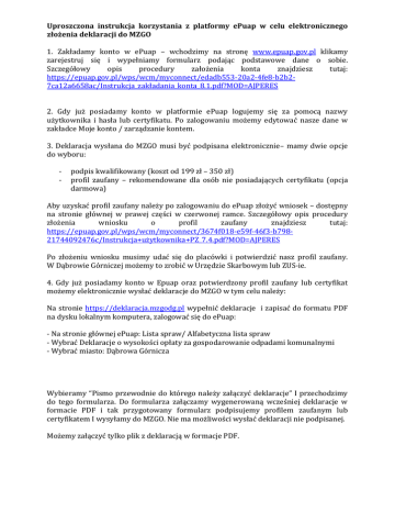 Uproszczona instrukcja korzystania z platformy ePuap w celu elektronicznego złożenia deklaracji do MZGO 1. Zakładamy konto w ePuap – wchodzimy na stronę www.epuap.gov.pl klikamy zarejestruj się i wypełniamy formularz podając podstawowe dane o sobie. Szczegółowy opis procedury założenia konta znajdziesz tutaj: https://epuap.gov.pl/wps/wcm/myconnect/edadb553-20a2-4fe8-b2b27ca12a6658ac/Instrukcja_zakładania_konta_8.1.pdf?MOD=AJPERES 2. Gdy już posiadamy konto w platformie ePuap logujemy się za pomocą nazwy użytkownika i hasła lub certyfikatu. Po zalogowaniu możemy edytować nasze dane w zakładce Moje konto / zarządzanie kontem. 3. Deklaracja wysłana do MZGO musi być podpisana elektronicznie– mamy dwie opcje do wyboru: - podpis kwalifikowany (koszt od 199 zł – 350 zł) profil zaufany – rekomendowane dla osób nie posiadających certyfikatu (opcja darmowa) Aby uzyskać profil zaufany należy po zalogowaniu do ePuap złożyć wniosek – dostępny na stronie głównej w prawej części w czerwonej ramce. Szczegółowy opis procedury złożenia wniosku o profil zaufany znajdziesz tutaj: https://epuap.gov.pl/wps/wcm/myconnect/3674f018-e59f-46f3-b79821744092476c/Instrukcja+użytkownika+PZ_7.4.pdf?MOD=AJPERES Po złożeniu wniosku musimy udać się do placówki i potwierdzić nasz profil zaufany. W Dąbrowie Górniczej możemy to zrobić w Urzędzie Skarbowym lub ZUS-ie. 4. Gdy już posiadamy konto w Epuap oraz potwierdzony profil zaufany lub certyfikat możemy elektronicznie wysłać deklaracje do MZGO w tym celu należy: Na stronie https://deklaracja.mzgodg.pl wypełnić deklaracje i zapisać do formatu PDF na dysku lokalnym komputera, zalogować się do ePuap: - Na stronie głównej ePuap: Lista spraw/ Alfabetyczna lista spraw - Wybrać Deklaracje o wysokości opłaty za gospodarowanie odpadami komunalnymi - Wybrać miasto: Dąbrowa Górnicza Wybieramy “Pismo przewodnie do którego należy załączyć deklaracje” I przechodzimy do tego formularza. Do formularza załączamy wygenerowaną wcześniej deklaracje w formacie PDF i tak przygotowany formularz podpisujemy profilem zaufanym lub certyfikatem I wysyłamy do MZGO. Nie ma możliwości wysłać deklaracji nie podpisanej. Możemy załączyć tylko plik z deklaracją w formacje PDF.
