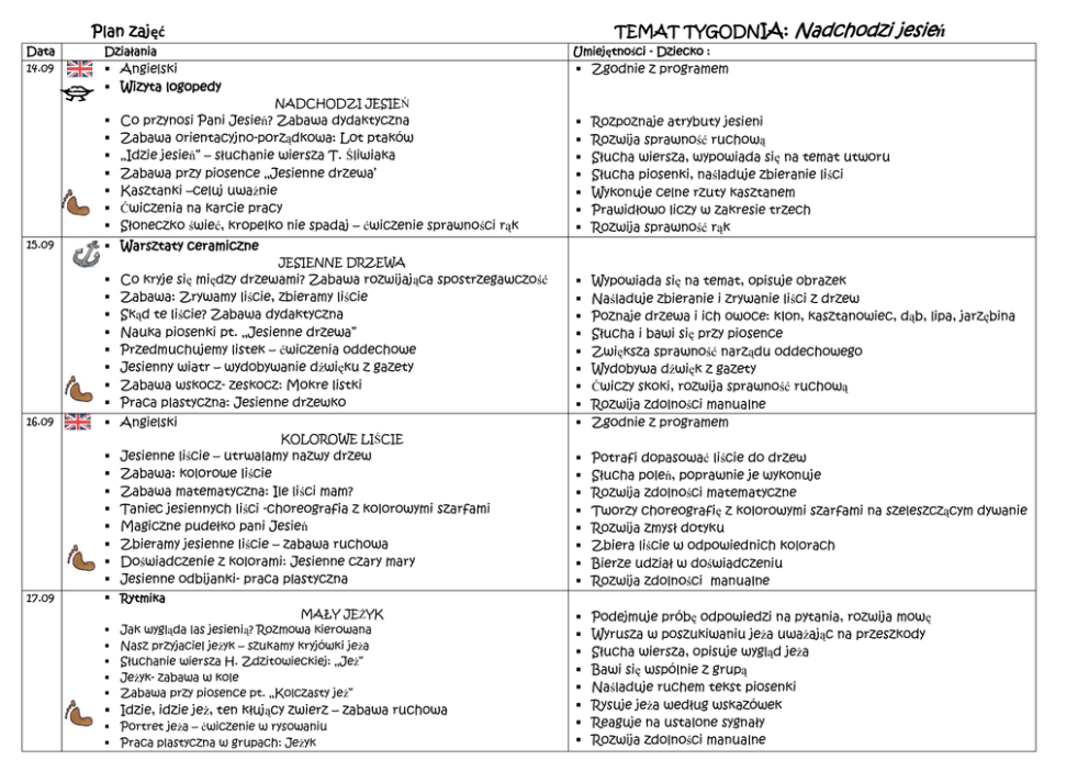 TEMAT TYGODNIA: Plan zajęć Data 14.09 Działania Umiejętności - Dziecko : Angielski Wizyta logopedy Zgodnie z programem Nadchodzi jesień NADCHODZI JESIEŃ 15.09 Co przynosi Pani Jesień? Zabawa dydaktyczna Zabawa orientacyjno-porządkowa: Lot ptaków „Idzie jesień” – słuchanie wiersza T. Śliwiaka Zabawa przy piosence „Jesienne drzewa’ Kasztanki –celuj uważnie Ćwiczenia na karcie pracy Słoneczko świeć, kropelko nie spadaj – ćwiczenie sprawności rąk Rozpoznaje atrybuty jesieni Rozwija sprawność ruchową Słucha wiersza, wypowiada się na temat utworu Słucha piosenki, naśladuje zbieranie liści Wykonuje celne rzuty kasztanem Prawidłowo liczy w zakresie trzech Rozwija sprawność rąk Wypowiada się na temat, opisuje obrazek Naśladuje zbieranie i zrywanie liści z drzew Poznaje drzewa i ich owoce: klon, kasztanowiec, dąb, lipa, jarzębina Słucha i bawi się przy piosence Zwiększa sprawność narządu oddechowego Wydobywa dźwięk z gazety Ćwiczy skoki, rozwija sprawność ruchową Rozwija zdolności manualne Zgodnie z programem Potrafi dopasować liście do drzew Słucha poleń, poprawnie je wykonuje Rozwija zdolności matematyczne Tworzy choreografię z kolorowymi szarfami na szeleszczącym dywanie Rozwija zmysł dotyku Zbiera liście w odpowiednich kolorach Bierze udział w doświadczeniu Rozwija zdolności manualne Podejmuje próbę odpowiedzi na pytania, rozwija mowę Wyrusza w poszukiwaniu jeża uważając na przeszkody Słucha wiersza, opisuje wygląd jeża Bawi się wspólnie z grupą Naśladuje ruchem tekst piosenki Rysuje jeża według wskazówek Reaguje na ustalone sygnały Rozwija zdolności manualne Warsztaty ceramiczne JESIENNE DRZEWA Co kryje się między drzewami? Zabawa rozwijająca spostrzegawczość Zabawa: Zrywamy liście, zbieramy liście Skąd te liście? Zabawa dydaktyczna Nauka piosenki pt. „Jesienne drzewa” Przedmuchujemy listek – ćwiczenia oddechowe Jesienny wiatr – wydobywanie dźwięku z gazety Zabawa wskocz- zeskocz: Mokre listki Praca plastyczna: Jesienne drzewko 16.09 Angielski 17.09 KOLOROWE LIŚCIE Jesienne liście – utrwalamy nazwy drzew Zabawa: kolorowe liście Zabawa matematyczna: Ile liści mam? Taniec jesiennych liści -choreografia z kolorowymi szarfami Magiczne pudełko pani Jesień Zbieramy jesienne liście – zabawa ruchowa Doświadczenie z kolorami: Jesienne czary mary Jesienne odbijanki- praca plastyczna Rytmika MAŁY JEŻYK Jak wygląda las jesienią? Rozmowa kierowana Nasz przyjaciel jeżyk – szukamy kryjówki jeża Słuchanie wiersza H. Zdzitowieckiej: „Jeż” Jeżyk- zabawa w kole Zabawa przy piosence pt. „Kolczasty jeż” Idzie, idzie jeż, ten kłujący zwierz – zabawa ruchowa Portret jeża – ćwiczenie w rysowaniu Praca plastyczna w grupach: Jeżyk 18.09 LICZYMY GRZYBY Grzyby w lesie – zabawa dydaktyczna Opowieść ruchowa: W lesie Których grzybów jest więcej? Porównywanie liczebności zbiorów Zabawa orientacyjno- porządkowa: Borowiki, muchomory Liczymy grzyby- zabawy matematyczne Muchomor zbiera kropeczki- zabawa ruchowa Praca plastyczna: Jesienny las Poznaje, rozpoznaje, zapamiętuje nazwy wybranych grzybów Naśladuje ruchem tekst opowiadania Porównuje liczebność zbiorów Reaguje na sygnał Liczy na konkretach Rozwija sprawność ruchową Rozwija zdolności manualne
