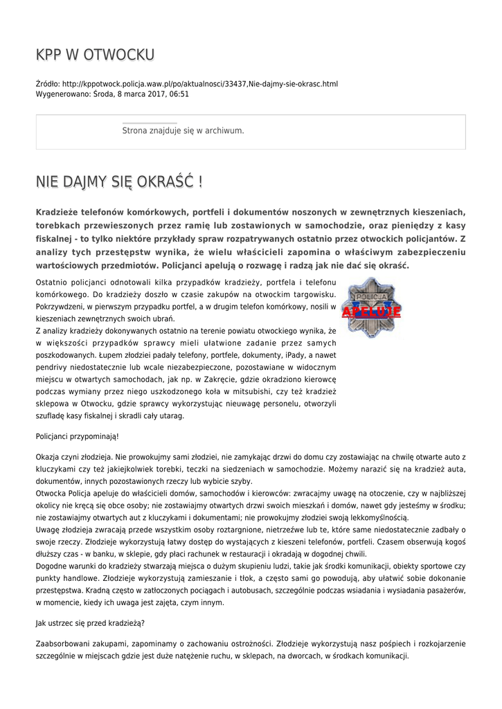 KPP W OTWOCKU Źródło: http://kppotwock.policja.waw.pl/po/aktualnosci/33437,Nie-dajmy-sie-okrasc.html Wygenerowano: Środa, 8 marca 2017, 06:51 Strona znajduje się w archiwum. NIE DAJMY SIĘ OKRAŚĆ ! Kradzieże telefonów komórkowych, portfeli i dokumentów noszonych w zewnętrznych kieszeniach, torebkach przewieszonych przez ramię lub zostawionych w samochodzie, oraz pieniędzy z kasy fiskalnej - to tylko niektóre przykłady spraw rozpatrywanych ostatnio przez otwockich policjantów. Z analizy tych przestępstw wynika, że wielu właścicieli zapomina o właściwym zabezpieczeniu wartościowych przedmiotów. Policjanci apelują o rozwagę i radzą jak nie dać się okraść. Ostatnio policjanci odnotowali kilka przypadków kradzieży, portfela i telefonu komórkowego. Do kradzieży doszło w czasie zakupów na otwockim targowisku. Pokrzywdzeni, w pierwszym przypadku portfel, a w drugim telefon komórkowy, nosili w kieszeniach zewnętrznych swoich ubrań. Z analizy kradzieży dokonywanych ostatnio na terenie powiatu otwockiego wynika, że w większości przypadków sprawcy mieli ułatwione zadanie przez samych poszkodowanych. Łupem złodziei padały telefony, portfele, dokumenty, iPady, a nawet pendrivy niedostatecznie lub wcale niezabezpieczone, pozostawiane w widocznym miejscu w otwartych samochodach, jak np. w Zakręcie, gdzie okradziono kierowcę podczas wymiany przez niego uszkodzonego koła w mitsubishi, czy też kradzież sklepowa w Otwocku, gdzie sprawcy wykorzystując nieuwagę personelu, otworzyli szufladę kasy fiskalnej i skradli cały utarag. Policjanci przypominają! Okazja czyni złodzieja. Nie prowokujmy sami złodziei, nie zamykając drzwi do domu czy zostawiając na chwilę otwarte auto z kluczykami czy też jakiejkolwiek torebki, teczki na siedzeniach w samochodzie. Możemy narazić się na kradzież auta, dokumentów, innych pozostawionych rzeczy lub wybicie szyby. Otwocka Policja apeluje do właścicieli domów, samochodów i kierowców: zwracajmy uwagę na otoczenie, czy w najbliższej okolicy nie kręcą się obce osoby; nie zostawiajmy otwartych drzwi swoich mieszkań i domów, nawet gdy jesteśmy w środku; nie zostawiajmy otwartych aut z kluczykami i dokumentami; nie prowokujmy złodziei swoją lekkomyślnością. Uwagę złodzieja zwracają przede wszystkim osoby roztargnione, nietrzeźwe lub te, które same niedostatecznie zadbały o swoje rzeczy. Złodzieje wykorzystują łatwy dostęp do wystających z kieszeni telefonów, portfeli. Czasem obserwują kogoś dłuższy czas - w banku, w sklepie, gdy płaci rachunek w restauracji i okradają w dogodnej chwili. Dogodne warunki do kradzieży stwarzają miejsca o dużym skupieniu ludzi, takie jak środki komunikacji, obiekty sportowe czy punkty handlowe. Złodzieje wykorzystują zamieszanie i tłok, a często sami go powodują, aby ułatwić sobie dokonanie przestępstwa. Kradną często w zatłoczonych pociągach i autobusach, szczególnie podczas wsiadania i wysiadania pasażerów, w momencie, kiedy ich uwaga jest zajęta, czym innym. Jak ustrzec się przed kradzieżą? Zaabsorbowani zakupami, zapominamy o zachowaniu ostrożności. Złodzieje wykorzystują nasz pośpiech i rozkojarzenie szczególnie w miejscach gdzie jest duże natężenie ruchu, w sklepach, na dworcach, w środkach komunikacji. Pamiętajmy, aby dobrze zabezpieczyć noszone przy sobie pieniądze i dokumenty. Starajmy się zwracać baczniejszą uwagę na nasze otoczenie, czy osoby znajdujące się obok nas nie robią tzw. sztucznego tłoku. Jeżeli my ich będziemy obserwować, to nie dokonają kradzieży. Szczególna uwaga dotyczy kobiet, nie należy nosić torebki na pasku z tyłu, wtedy wręcz kusimy złodzieja. Starajmy się nie demonstrować zawartości portfela, gdy widzą to przypadkowe osoby. Klucze do mieszkania, kluczyki do samochodu też mogą stać się łupem złodziei, chowajmy je do wewnętrznych kieszeni, a nie zewnętrznych. Jeżeli wyjeżdżamy, pamiętajmy też o zabezpieczeniu naszych mieszkań. Nie zostawiajmy uchylonych okien, dobrze wszystko pozamykajmy. Poprośmy sąsiadów, którzy zostają na miejscu, aby zwrócili uwagę na nasze mieszkanie, czy dom. W podróży również nie zapominajmy o zachowaniu bezpieczeństwa, a szczególnie o przestrzeganiu przepisów ruchu drogowego. Pamiętajmy, że okazja czyni złodzieja, dlatego też nie dajmy szans złodziejowi. W przypadku jakiegokolwiek zagrożenia powiadom oficera dyżurnego KPP w Otwocku, tel. ( 22) 779 40 91, (22) 60-41-213, telefony alarmowe 997, 112 lub najbliższą jednostkę Policji. Każdy otrzymany sygnał o zagrożeniu zostanie niezwłocznie przekazany załogom patrolowym. js Ocena: 0/5 (0) Tweetnij