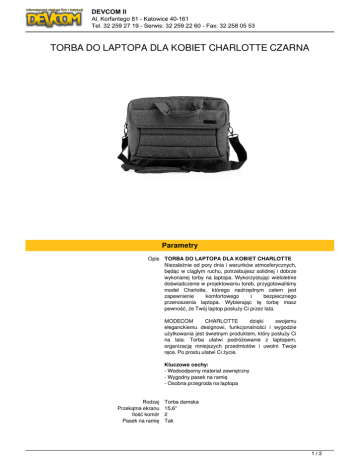 DEVCOM II Al. Korfantego 81 - Katowice 40-161 Tel. 32 259 27 19 - Serwis: 32 259 22 60 - Fax: 32 258 05 53 TORBA DO LAPTOPA DLA KOBIET CHARLOTTE CZARNA Parametry Opis TORBA DO LAPTOPA DLA KOBIET CHARLOTTE Niezależnie od pory dnia i warunków atmosferycznych, będąc w ciągłym ruchu, potrzebujesz solidnej i dobrze wykonanej torby na laptopa. Wykorzystując wieloletnie doświadczenie w projektowaniu toreb, przygotowaliśmy model Charlotte, którego nadrzędnym celem jest zapewnienie komfortowego i bezpiecznego przenoszenia laptopa. Wybierając tę torbę masz pewność, że Twój laptop posłuży Ci przez lata. MODECOM CHARLOTTE dzięki swojemu eleganckiemu designowi, funkcjonalności i wygodzie użytkowania jest świetnym produktem, który posłuży Ci na lata. Torba ułatwi podróżowanie z laptopem, organizację mniejszych przedmiotów i uwolni Twoje ręce. Po prostu ułatwi Ci życie. Kluczowe cechy: - Wodoodporny materiał zewnętrzny - Wygodny pasek na ramię - Osobna przegroda na laptopa Rodzaj Przekątna ekranu Ilość komór Pasek na ramię Torba damska 15,6'' 2 Tak 1/2 DEVCOM II Al. Korfantego 81 - Katowice 40-161 Tel. 32 259 27 19 - Serwis: 32 259 22 60 - Fax: 32 258 05 53 Uchwyt do ręki Tak Materiał Nylon Wymiary 400 x 300 x 75 mm Kolor Czarny Pasuje do Notebooki o przekątnej ekranu do 15.6'' 2/2 Powered by TCPDF (www.tcpdf.org)
