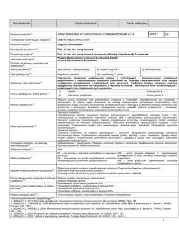 Rok akademicki: Grupa przedmiotów: Numer katalogowy: Nazwa przedmiotu1): NAWODNIENIA W OBSZARACH ZURBANIZOWANYCH Tłumaczenie nazwy na jęz. angielski3): URBAN AREAS IRRIGATION Kierunek studiów4): Inżynieria Środowiska 5) Koordynator przedmiotu : 6) ECTS 2) 2,0 Prof. dr hab. inż. Jerzy Jeznach Prowadzący zajęcia : Prof. dr hab. inż. Jerzy Jeznach, pracownicy Katedry Kształtowania Środowiska Jednostka realizująca7): Wydział Budownictwa i Inżynierii Środowiska SGGW, Katedra Kształtowania Środowiska Wydział, dla którego przedmiot jest realizowany8): Status przedmiotu9): a) przedmiot – specjalizacyjny b) stopień drugi rok 2 Cykl dydaktyczny10): Pojedynczy semestr Jęz. wykładowy11): polski Założenia i cele przedmiotu12): Formy dydaktyczne, liczba godzin13): 14) Metody dydaktyczne : Pełny opis przedmiotu15): Wymagania formalne (przedmioty wprowadzające)16): c) niestacjonarne Przekazanie studentom podstawowej wiedzy o technicznych i środowiskowych problemach projektowania i funkcjonowania systemów nawodnień na terenach zurbanizowanych oraz nabycie umiejętności projektowania i eksploatacji tych systemów. Realizacja takiego programu powinna przygotować absolwentów do korzystania z literatury fachowej i prowadzenia prac konstrukcyjnych i projektowych oraz użytkowania tych systemów. a) wykład …………………………………………………………… …………; liczba godzin 8.......; b) ćwiczenia projektowe …………………………………………………………; liczba godzin 8.......; Aktywna praca studentów nad problematyką związaną z materiałem przedstawionym na wykładach i ćwiczeniach. W trakcie zajęć stosowane są metody audiowizualne (prezentacje multimedialne, filmy dydaktyczne, slajdy i rysunki), komputerowe (projektowanie sieci, tradycyjne i satelitarne metody pomiarów) oraz analityczne i audytoryjne. Studentom udostępnione zostaną wszelkie pomoce dydaktyczne – konspekty, broszury, programy komputerowe, prezentacje multimedialne i inne. Tematyka wykładów: Charakterystyka potrzeb nawodnień terenów zurbanizowanych. Współdziałanie zabiegów hydro- i fitomelioracyjnych w kształtowaniu stosunków wodnych gleb i zahamowaniu zanieczyszczeń obszarowych. Elementy systemów nawadniających. Zasady projektowania systemów nawadniających. Dobór urządzeń nawadniających na terenach zurbanizowanych. Obliczenie parametrów hydraulicznych urządzeń i sieci przewodów. Projektowanie układu sieci nawadniającej. Automatyzacja nawodnień. Eksploatacja systemów nawadniających. Tematyka ćwiczeń: Ćwiczenia projektowe na mapach geodezyjnych i cyfrowych. Rozpoznanie podstawowego uzbrojenia technicznego terenu. Projektowanie gospodarki wodnej (dawki, terminy i czasy nawodnień, dopływ wody). Projekt systemu. Projektowanie parametrów technicznych urządzeń i układu sieci rurociągów. Obliczenia parametrów hydraulicznych. Gleboznawstwo i rekultywacja, Podstawy melioracji, Systemy odwodnień, Kształtowanie terenów dolinowych, Systemy nawodnień, Mikronawodnienia Założenia wstępne17): brak Efekty kształcenia18): 01 – zna procesy i zjawiska zachodzące w uprawach polowych 02 – ma wiedzę na temat projektowania systemów nawadniających na terenach zurbanizowanych Sposób weryfikacji efektów kształcenia19): Wykonanie projektu systemu nawadniającego wybranych fragmentów terenów zurbanizowanych Wykonanie instrukcji użytkowania systemu Dyskusja publiczna (na forum grupy) na temat projektu i opracowanej instrukcji 03 – umie postawić diagnozę i zaproponować postępowanie w celu usunięcia niedomagań systemu nawodnień 04 – umie publicznie zaprezentować instrukcję użytkowania systemu Forma dokumentacji osiągniętych efektów Złożone projekty odwodnienia i nawodnienia kształcenia 20): Złożone instrukcje obsługi Prawidłowość opracowania projektów 25% Elementy i wagi mające wpływ na ocenę Prezentacja projektów i uczestnictwo w dyskusji 25% 21) końcową : Prawidłowość wykonania instrukcji 25% Prezentacja instrukcji i uczestnictwo w dyskusji 25% Miejsce realizacji zajęć22): Teren kampusu Uczelni, Sala dydaktyczna, Pracownie komputerowe Literatura podstawowa i uzupełniająca23): 1. JEZNACH J. 2012: Materiały dydaktyczne: Nawadnianie terenów zurbanizowanych. Maszynopisy SGGW. Płyty CD. 2. JEZNACH J., TREDER W. 2006: Nawadnianie roślin w szklarniach i pod osłonami. W: „Nawadnianie roślin” Red. Karczmarczyk S., Nowak L. PWRiL. Poznań. 233 – 267. 3. JEZNACH J., MOSIEJ J. 2006: Nawadnianie trwałych użytków zielonych. W: „Nawadnianie roślin” Red. Karczmarczyk S., Nowak L. PWRiL. Poznań. 445 – 460. 4. JEZNACH J. 2005: Przyrodnicze problemy nawodnień. Postępy Nauk Rolniczych. Nr 3/2005. 125 – 134. 5. JEZNACH J. 2005: Techniczne problemy nawodnień. Postępy Nauk Rolniczych. Nr 3/2005. 135 – 145. 3. 1 6. KARCZMARCZYK S., NOWAK L. (Red.) 2006: Nawadnianie roślin. PWRiL. 7. OSTROMĘCKI J. 1973: Podstawy melioracji nawadniających. PWN. 8. PROCHAL P. (Red.) 1986: Podstawy melioracji rolnych. PWRiL. UWAGI24): Wskaźniki ilościowe charakteryzujące moduł/przedmiot25) : Szacunkowa sumaryczna liczba godzin pracy studenta (kontaktowych i pracy własnej) niezbędna dla osiągnięcia zakładanych efektów kształcenia18) - na tej podstawie należy wypełnić pole ECTS2: … Łączna liczba punktów ECTS, którą student uzyskuje na zajęciach wymagających bezpośredniego udziału nauczycieli akademickich: ……1…. ECTS Łączna liczba punktów ECTS, którą student uzyskuje w ramach zajęć o charakterze praktycznym, takich jak zajęcia laboratoryjne, projektowe, itp.: ……1…. ECTS 50 h Tabela zgodności kierunkowych efektów kształcenia efektami przedmiotu 26) Nr /symbol efektu 01 02 Wymienione w wierszu efekty kształcenia: zna procesy i zjawiska zachodzące w uprawach polowych Odniesienie do efektów dla programu kształcenia na kierunku K_W01, K_K04, K_