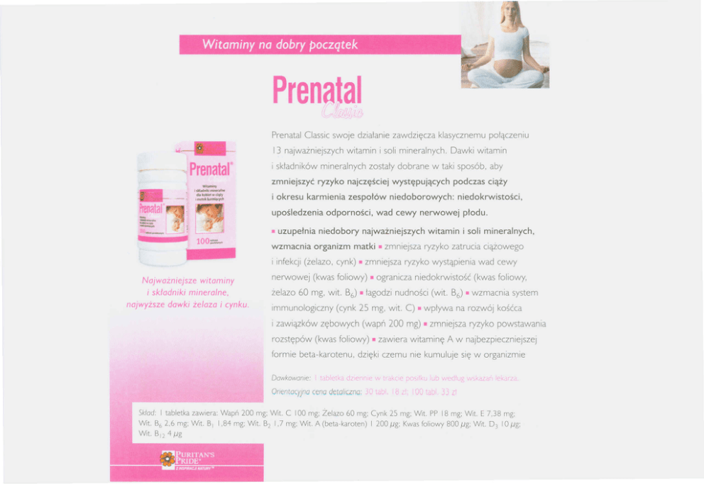 Prenatal C1assicswoJe działanie zawdzięcza klasycznemu połączeniu 13 najważniejszych witamin I soli mineralnych. Dawki witamin i składników mineralnych zostały dobrane w taki sposób, aby zmniejszyć ryzyko najczęściej występujących i okresu karmienia zespołów upośledzenia odporności, • uzupełnia niedobory podczas ciąży niedoborowych: wad cewy nerwowej niedokrwistości, płodu . najważniejszych witamin i soli mineralnych, wzmacnia organizm matki. zmniejsza ryzyko zatrucia ciążowego i infekcji (żelazo, cynk) • zmniejsza ryzyko wystąpienia wad cewy Najważniejsze witaminy i składniki mineralne. najwyższe dawki żelaza, cynku. nerwowej (kwas foliowy) • ogranicza niedokrwistość (kwas foliowy, żelazo 60 mg, wit. B6) • łagodzi nudności (wit. B6) • wzmacnia system immunologiczny (cynk 25 mg, wit. C) • wpływa na rozwój kośćca i zawiązków zębowych (wapń 200 mg) • zmniejsza ryzyko powstawania rozstępów (kwas foliowy) • zawiera witaminę A w najbezpieczniejszej formie beta-karotenu, dzięki czemu nie kumuluje się w organizmie Sklod. I tabletka zawiera: Wapń 200 mg; Wit. C 100 mg; Żelazo 60 mg; Cynk 25 mg; Wit. PP 18 mg; W,t. E 7,38 mg; Wit. B6 2,6 mg; Wit. BI 1,84 mg; W,t. B2 1,7 mg; Wit. A (beta-karoten) I 200llg; Kwas foliowy 800 Ilg; WIt. D3 10 Ilg; Wit. BI2 41lg
