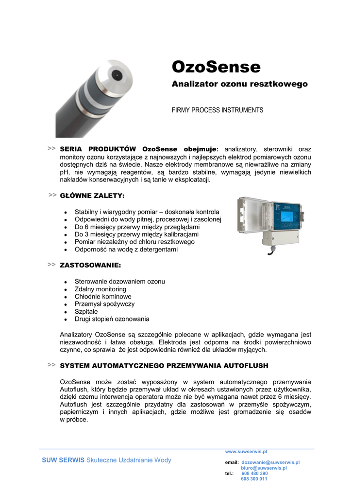 OzoSense Analizator ozonu resztkowego FIRMY PROCESS INSTRUMENTS >> SERIA PRODUKTÓW OzoSense obejmuje: analizatory, sterowniki oraz monitory ozonu korzystające z najnowszych i najlepszych elektrod pomiarowych ozonu dostępnych dziś na świecie. Nasze elektrody membranowe są niewrażliwe na zmiany pH, nie wymagają reagentów, są bardzo stabilne, wymagają jedynie niewielkich nakładów konserwacyjnych i są tanie w eksploatacji. >> GŁÓWNE ZALETY: Stabilny i wiarygodny pomiar – doskonała kontrola Odpowiedni do wody pitnej, procesowej i zasolonej Do 6 miesięcy przerwy między przeglądami Do 3 miesięcy przerwy między kalibracjami Pomiar niezależny od chloru resztkowego Odporność na wodę z detergentami >> ZASTOSOWANIE: Sterowanie dozowaniem ozonu Zdalny monitoring Chłodnie kominowe Przemysł spożywczy Szpitale Drugi stopień ozonowania Analizatory OzoSense są szczególnie polecane w aplikacjach, gdzie wymagana jest niezawodność i łatwa obsługa. Elektroda jest odporna na środki powierzchniowo czynne, co sprawia że jest odpowiednia również dla układów myjących. >> SYSTEM AUTOMATYCZNEGO PRZEMYWANIA AUTOFLUSH OzoSense może zostać wyposażony w system automatycznego przemywania Autoflush, który będzie przemywał układ w okresach ustawionych przez użytkownika, dzięki czemu interwencja operatora może nie być wymagana nawet przez 6 miesięcy. Autoflush jest szczególnie przydatny dla zastosowań w przemyśle spożywczym, papierniczym i innych aplikacjach, gdzie możliwe jest gromadzenie się osadów w próbce. www.suwserwis.pl SUW SERWIS Skuteczne Uzdatnianie Wody email: [email protected] [email protected] tel.: 608 480 390 608 300 011 >> KONFIGURACJA: Elektrody OzoSense i cele przepływowe są dostępne w zestawach z różnymi sterownikami i różnymi opcjami komunikacji, wyświetlaczem i opcjami sterowania. CRONOS® OzoSense Wysoka jakość i wielojęzyczne menu Niski koszt zakupu Możliwość podłączenia do 3 sond Opcje: - do 3 wyjść 3 4-20mA - do 4 przekaźników (półprzewodnikowych lub mechanicznych) - modbus TCP - modbus ASCII/RTU - profibus - HART - wejście czujnika przepływu - sterownik PID CRATOS® OzoSense CRIUS® OzoSense Wysoka jakość i wielojęzyczne menu Niski koszt zakupu Kolorowy wyświetlacz i klawiatura Szerokie możliwości komunikacji i sterowania Rejestracja danych pomiarowych Możliwość podłączenia do 6 sond Wszystkie opcje CRONOS, a dodatkowo: - alarmy SMS - zdalny dostęp przez internet - automatyczne czyszczenie - automatyczna kalibracja - zintegrowany czujnik przepływu Wysoka jakość i wielojęzyczne menu Umiarkowany koszt zakupu Kolorowy ekran dotykowy Rejestracja danych pomiarowych Możliwość podłączenia do 12 sond Wszystkie opcje CRONOS i CRIUS, a dodatkowo: - najniższy koszt w przeliczeniu na punkt pomiarowy >> SPECYFIKACJA: Typ: system dwóch elektrod amperometrycznych polarograficznych okrytych membraną Pomiar: Ozon (O3) resztkowy Zakres: 0.05-0.2, 0.05-2, 0.05-5, 0.05-10 mg/l (ppm) Rozdzielczość: 0.01 mg/l (1ppb) Powtarzalność: ±5% Stabilność: -1%/m-c (bez kalibracji0 Elektroda robocza: Złota katoda Przeciwelektroda: Srebrna Materiał membrany: mikroporowata membrana hydrofilowa Przepływ: ok.0.5l/min (min.0.2l/min) Zakres temperatury: >0°C do 50°C Kompensacja temperatury: automatyczna przez zintegrowany termistor (zmiana <5°C p/h) Zakres pH: od pH 2 do pH 11 Dopuszczone nadciśnienie: 0.5bar Czas pierwszej polaryzacji: 120 min Czas polaryzacji wtórnej: 30min Kalibracja zera: niewymagana Kalibracja: Ręczna z wykorzystaniem zestawu testowego. W zależności od aplikacji od 1 tygodnia do 3 miesięcy. Materiał: PVC, silikon, poliwęglan, stal nierdzewna Wymiary: Ø25mm, długość 175mm Zakłócenia: Cl2 pomijalne, ClO2 6% www.suwserwis.pl SUW SERWIS Skuteczne Uzdatnianie Wody email: [email protected] [email protected] tel.: 608 480 390 608 300 011 >> MOZLIWOŚĆ PODŁĄCZENIA WIELU ELEKTROD: Monitory OzoSense mogą zostać wyposażone w dodatkowe elektrody np. ozonu, chloru, pH i wiele innych. W celu uzyskania szczegółowych informacji prosimy o kontakt z dystrybutorem. >> ZASADA DZIAŁANIA: Amperomertyczna elektroda membranowa ozonu składa się z dwóch czujników, które pracują przy podwyższonym potencjale eliminującym pełzanie zera. Ta unikalna konstrukcja pozwoliła wyeliminować stosowanie odczynników i buforów. Dodatkowo amperometryczne elektrody OzoSense na długo zachowują funkcjonalność, której potrzebujesz. Wybierz spośród naszych sterowników CRONOS, CRIUS® lub CRATOS, a otrzymasz najwyższą jakość i funkcjonalność przy najniższej możliwej cenie. Płacisz dokładnie za to, czego potrzebujesz bez rezygnacji z wysokiej jakości pomiarów. >> INNE URZĄDZENIA W NASZEJ OFERCIE: ELEKTROMAGNETYCZNE POMPY DOZUJĄCE Pompy dozujące współpracujące z analizatorem dla utrzymania żądanych parametrów wody. Pompy o wydajnościach w zakresie 30…1300ml/min. i ciśnieniu 2…10 bar, sterowanie ręczne lub automatyczne.. DOZOWNIK SUBSTANCJI ODGAZOWUJĄCYCH Kompletna stacja dozująca (zbiornik i pompa) zaprojektowana głównie do dozowania podchlorynu sodu. Umożliwia precyzyjne dozowanie nawet niewielkich ilości, bez ryzyka zapowietrzenia głowicy pompy. Pojemność zbiornika 30…120l. BEZPULSACYJNE POMPY DOZUJĄCE Membranowe pompy dozujące o unikalnej konstrukcji eliminującej zjawisko pulsacji przepływu! Konstrukcja dla ochrony przed drganiami długich rurociągów, wytwarzania jednorodnej mieszaniny, dozowania lepkich chemikaliów, zraszania… Wydajności 0,05…80l/min. Sterowanie falownikiem. www.suwserwis.pl SUW SERWIS Skuteczne Uzdatnianie Wody email: [email protected] [email protected] tel.: 608 480 390 608 300 011