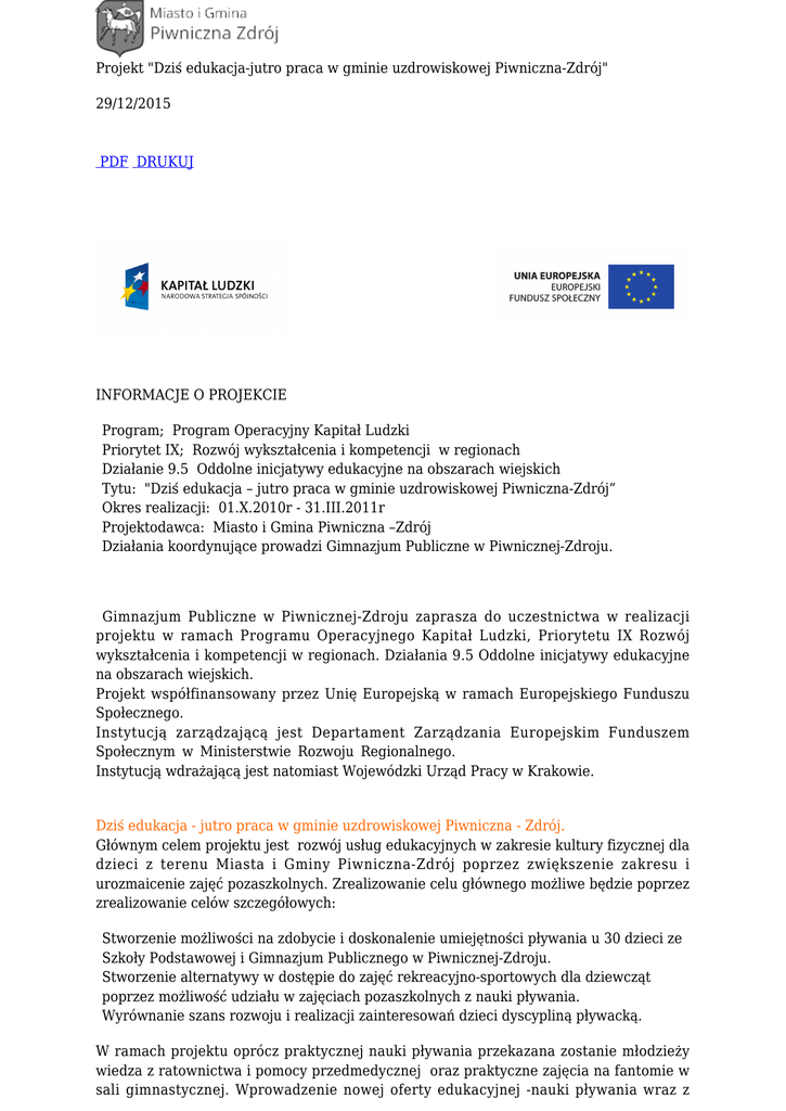 Projekt "Dziś edukacja-jutro praca w gminie uzdrowiskowej Piwniczna-Zdrój" 29/12/2015 PDF DRUKUJ INFORMACJE O PROJEKCIE Program; Program Operacyjny Kapitał Ludzki Priorytet IX; Rozwój wykształcenia i kompetencji w regionach Działanie 9.5 Oddolne inicjatywy edukacyjne na obszarach wiejskich Tytu: "Dziś edukacja – jutro praca w gminie uzdrowiskowej Piwniczna-Zdrój” Okres realizacji: 01.X.2010r - 31.III.2011r Projektodawca: Miasto i Gmina Piwniczna –Zdrój Działania koordynujące prowadzi Gimnazjum Publiczne w Piwnicznej-Zdroju. Gimnazjum Publiczne w Piwnicznej-Zdroju zaprasza do uczestnictwa w realizacji projektu w ramach Programu Operacyjnego Kapitał Ludzki, Priorytetu IX Rozwój wykształcenia i kompetencji w regionach. Działania 9.5 Oddolne inicjatywy edukacyjne na obszarach wiejskich. Projekt współfinansowany przez Unię Europejską w ramach Europejskiego Funduszu Społecznego. Instytucją zarządzającą jest Departament Zarządzania Europejskim Funduszem Społecznym w Ministerstwie Rozwoju Regionalnego. Instytucją wdrażającą jest natomiast Wojewódzki Urząd Pracy w Krakowie. Dziś edukacja - jutro praca w gminie uzdrowiskowej Piwniczna - Zdrój. Głównym celem projektu jest rozwój usług edukacyjnych w zakresie kultury fizycznej dla dzieci z terenu Miasta i Gminy Piwniczna-Zdrój poprzez zwiększenie zakresu i urozmaicenie zajęć pozaszkolnych. Zrealizowanie celu głównego możliwe będzie poprzez zrealizowanie celów szczegółowych: Stworzenie możliwości na zdobycie i doskonalenie umiejętności pływania u 30 dzieci ze Szkoły Podstawowej i Gimnazjum Publicznego w Piwnicznej-Zdroju. Stworzenie alternatywy w dostępie do zajęć rekreacyjno-sportowych dla dziewcząt poprzez możliwość udziału w zajęciach pozaszkolnych z nauki pływania. Wyrównanie szans rozwoju i realizacji zainteresowań dzieci dyscypliną pływacką. W ramach projektu oprócz praktycznej nauki pływania przekazana zostanie młodzieży wiedza z ratownictwa i pomocy przedmedycznej oraz praktyczne zajęcia na fantomie w sali gimnastycznej. Wprowadzenie nowej oferty edukacyjnej -nauki pływania wraz z nauką ratownictwa i pomocy przedmedycznej wskaże możliwości dalszej edukacji w celu zdobycia zawodu i zatrudnienia w miejscowości turystyczno - uzdrowiskowej. Dokumenty do pobrania: Regulamin uczestnictwa Deklaracja uczestnictwa w projekcie Wyrażenie zgody na przetwarzanie danych osobowych Kwestinariusz rekrutacyjny do projektu Oświadczenie lekarza Oświadczenie rodzica ------------------------------------------------------------------------ Informacje o projekcie Informacja z rekrutacji Lista uczestników Szkoła Podstawowa Lista uczestników Gimnazjum Zebranie organizacyjne Informacja z zebrania Zakończony został pierwszy etap projektu - - - - - ZAKOŃCZENIE PROJEKTU - - - - - - - - - - - - - - - - - - - - - - - - - - - - - - - - - - - - - - - - - ---------------"Dziś edukacja-jutro praca w gminie uzdrowiskowej Piwniczna-Zdrój” Dobiegł końca projekt , którego realizację rozpoczęliśmy w miesiącu pazdzierniku. Projektem zostało objętych 15 dzieci ze szkoły Podstawowej i 15 z Gimnazjum Publicznego w Piwnicznej-Zdroju. Projekt ten stanowił dodatkową ofertę edukacyjną zajęć pozalekcyjnych dla jego uczestników. Dzieci spędziły 40 godzin na basenie ucząc się pływać pod okiem doświadczonej kadry instruktorów Danuty Ryzner i Dariusza Gerharta. Pierwszy etap nauki prowadzony był na basenie hotelu” Panorama „w KrynicyZdroju , drugi na basenie hotelu „Perła Południa” w Rytrze. W ramach projektu dzieci miały przeprowadzone zajęcia z ratownictwa i pomocy przedmedycznej przez doświadczonych ratownikow i instruktorów WOPR z Nowego Sącza. W środę 23.03 2011 odbyły się ostatnie zajęcia na które zostali zaproszeni rodzice. Podczas tych zajęć przeprowadzono dla wszystkich uczestników egzamin na kartę „Już Pływam” oraz zawody pływackie w kategorii dziewcząt i chłopców. Po zaciętej walce do ścisłego finału zakwalfikowały się po 4 osoby a oto jego wyniki: Dziewczęta: I m - Małgorzata Porębska IIm - Ściurka Natalia IIIm - Polakiewicz Kinga IVm - Pustułka Magdalena Chłopcy: Im - Maślanka Patryk IIm - Izworski Michał IIIm - Lach Paweł IVm - Pamuła Arkadiusz Dodatkowym wyzwaniem dla uczestników projektu był egzamin na Kartę Pływacką, zdało go 19 osób. Na koniec dla wszystkich uczestników projektu przygotowany był poczęstunek podczas, którego rozdawane były puchary za zawody plywackie oraz dyplomy za udział w projekcie. Każdy uczestnik otrzymał materiały promocyjne. Uczestnicy zajeć skladają serdeczne podziękowanie autorce tego projektu pani Anecie Majocha, iż poprzez udział w tych zajęciach nie będą odbiegać umijetnościami od swoich rówiesników z innych miast. Projektodawcą był Urząd Miasta i Gminy Piwniczna - Zdrój a beneficjetem Gimnazjum Publiczne w Piwnicznej-Zdroju.