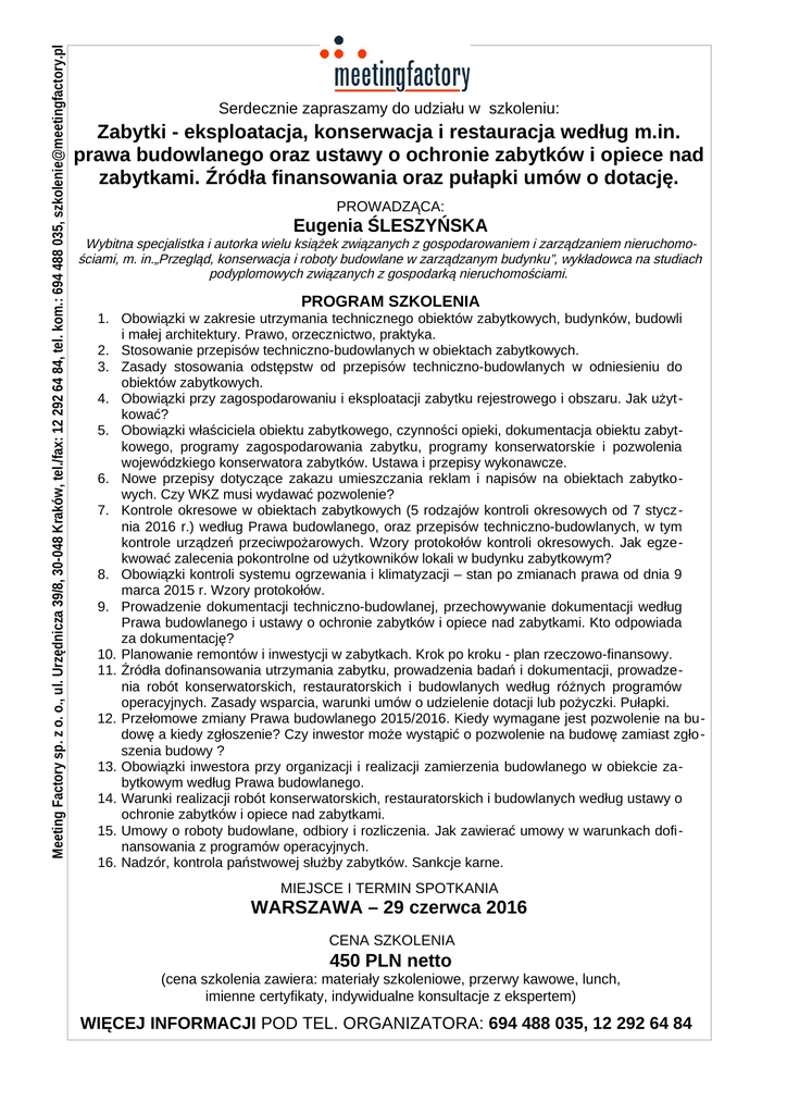 Meeting Factory sp. z o. o., ul. Urzędnicza 39/8, 30-048 Kraków, tel./fax: 12 292 64 84, tel. kom.: 694 488 035, [email protected] Serdecznie zapraszamy do udziału w szkoleniu: Zabytki - eksploatacja, konserwacja i restauracja według m.in. prawa budowlanego oraz ustawy o ochronie zabytków i opiece nad zabytkami. Źródła finansowania oraz pułapki umów o dotację. PROWADZĄCA: Eugenia ŚLESZYŃSKA Wybitna specjalistka i autorka wielu książek związanych z gospodarowaniem i zarządzaniem nieruchomościami, m. in.„Przegląd, konserwacja i roboty budowlane w zarządzanym budynku”, wykładowca na studiach podyplomowych związanych z gospodarką nieruchomościami. PROGRAM SZKOLENIA 1. Obowiązki w zakresie utrzymania technicznego obiektów zabytkowych, budynków, budowli i małej architektury. Prawo, orzecznictwo, praktyka. 2. Stosowanie przepisów techniczno-budowlanych w obiektach zabytkowych. 3. Zasady stosowania odstępstw od przepisów techniczno-budowlanych w odniesieniu do obiektów zabytkowych. 4. Obowiązki przy zagospodarowaniu i eksploatacji zabytku rejestrowego i obszaru. Jak użytkować? 5. Obowiązki właściciela obiektu zabytkowego, czynności opieki, dokumentacja obiektu zabytkowego, programy zagospodarowania zabytku, programy konserwatorskie i pozwolenia wojewódzkiego konserwatora zabytków. Ustawa i przepisy wykonawcze. 6. Nowe przepisy dotyczące zakazu umieszczania reklam i napisów na obiektach zabytkowych. Czy WKZ musi wydawać pozwolenie? 7. Kontrole okresowe w obiektach zabytkowych (5 rodzajów kontroli okresowych od 7 stycznia 2016 r.) według Prawa budowlanego, oraz przepisów techniczno-budowlanych, w tym kontrole urządzeń przeciwpożarowych. Wzory protokołów kontroli okresowych. Jak egzekwować zalecenia pokontrolne od użytkowników lokali w budynku zabytkowym? 8. Obowiązki kontroli systemu ogrzewania i klimatyzacji – stan po zmianach prawa od dnia 9 marca 2015 r. Wzory protokołów. 9. Prowadzenie dokumentacji techniczno-budowlanej, przechowywanie dokumentacji według Prawa budowlanego i ustawy o ochronie zabytków i opiece nad zabytkami. Kto odpowiada za dokumentację? 10. Planowanie remontów i inwestycji w zabytkach. Krok po kroku - plan rzeczowo-finansowy. 11. Źródła dofinansowania utrzymania zabytku, prowadzenia badań i dokumentacji, prowadzenia robót konserwatorskich, restauratorskich i budowlanych według różnych programów operacyjnych. Zasady wsparcia, warunki umów o udzielenie dotacji lub pożyczki. Pułapki. 12. Przełomowe zmiany Prawa budowlanego 2015/2016. Kiedy wymagane jest pozwolenie na budowę a kiedy zgłoszenie? Czy inwestor może wystąpić o pozwolenie na budowę zamiast zgłoszenia budowy ? 13. Obowiązki inwestora przy organizacji i realizacji zamierzenia budowlanego w obiekcie zabytkowym według Prawa budowlanego. 14. Warunki realizacji robót konserwatorskich, restauratorskich i budowlanych według ustawy o ochronie zabytków i opiece nad zabytkami. 15. Umowy o roboty budowlane, odbiory i rozliczenia. Jak zawierać umowy w warunkach dofinansowania z programów operacyjnych. 16. Nadzór, kontrola państwowej służby zabytków. Sankcje karne. MIEJSCE I TERMIN SPOTKANIA WARSZAWA – 29 czerwca 2016 CENA SZKOLENIA 450 PLN netto (cena szkolenia zawiera: materiały szkoleniowe, przerwy kawowe, lunch, imienne certyfikaty, indywidualne konsultacje z ekspertem) WIĘCEJ INFORMACJI POD TEL. ORGANIZATORA: 694 488 035, 12 292 64 84 Zabytki - eksploatacja, konserwacja i restauracja – Warszawa – 29.06, godz. 10.00 Meeting Factory sp. z o. o., ul. Urzędnicza 39/8, 30-048 Kraków, tel./fax: 12 292 64 84, tel. kom.: 694 488 035, www.meetingfactory.pl Nazwa firmy (dane jak do faktury):.................................................................................................................. Adres:................................................................................................................................................................. NIP:.....................................................................tel.:........................................................................................... fax.:.....................................................................e-mail:..................................................................................... Lp. Imię i nazwisko STANOWISKO Tel. kontaktowy 1. 2 MIEJSCE I TERMIN WARSZAWA – 29 czerwca 2016 EUROPROFES, ul. Czerska 14 kwota: □ 450 zł netto (553,50 zł brutto)* za osobę x liczba osób .......... = ................. zł (cena zawiera: szkolenie, materiały szkoleniowe, imienne certyfikaty, przerwy kawowe, lunch, indywidualne konsultacje z ekspertem) suma: ................. PLN; słownie ............................................................................ należność: Bank Pekao 54 1240 4533 1111 0010 5922 0160 (osoba zgłaszająca należność zobowiązuje się przekazać na konto Meeting Factory sp. z o. o.:) w tytule przelewu proszę wpisać: WA2906 * UWAGA: przy finansowaniu szkolenia w całości ze środków publicznych jest ono opodatkowane zwolnioną stawką VAT (art. 43 ust. 1 pkt 29c ustawy o VAT) WARUNKI UCZESTNICTWA: ■ przesłanie faksem lub e-mailem wypełnionej karty zgłoszenia ■ przesłanie zgłoszenia udziału w szkoleniu stanowi zgodę na wystawienie faktury VAT i zobowiązanie się do uiszczenia opłaty za szkolenie ■ wpłata na konto Meeting Factory sp. z o. o. należności za uczestnictwo przed szkoleniem ■ brak wpłaty nie jest jednoznaczny z rezygnacją z udziału ■ rezygnacja możliwa jest najpóźniej na 7 dni przed seminarium wyłącznie w formie pisemnej ■ Szkolenie może nie dojść do skutku w ww. terminie, jeśli nie zgłosi się odpowiednia ilość uczestników ■ Zapoznaliśmy się i akceptujemy warunki płatności oraz uczestnictwa w szkoleniu organizowanym przez Meeting Factory sp. z o. o. ■ wyrażamy zgodę na przetwarzanie danych osobowych do celów organizacyjnyc