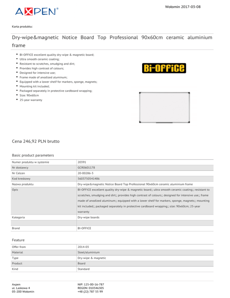 Wołomin 2017-03-08 Karta produktu: Dry-wipe&magnetic Notice Board Top Professional 90x60cm ceramic aluminium frame BI-OFFICE excellent quality dry-wipe & magnetic board; Ultra smooth ceramic coating; Resistant to scratches, smudging and dirt; Provides high contrast of colours; Designed for intensive use; Frame made of anodized aluminum; Equipped with a lower shelf for markers, sponge, magnets; Mounting kit included; Packaged separately in protective cardboard wrapping; Size: 90x60cm 25-year warranty Cena 246,92 PLN brutto Basic product parameters Numer produktu w systemie 20391 Nr dostawcy GCR0601178 Nr Celcen 20-00286-3 Kod kreskowy 5603750541486 Nazwa produktu Dry-wipe&magnetic Notice Board Top Professional 90x60cm ceramic aluminium frame Opis BI-OFFICE excellent quality dry-wipe & magnetic board;; ultra smooth ceramic coating;; resistant to scratches, smudging and dirt;; provides high contrast of colours;; designed for intensive use;; frame made of anodized aluminum;; equipped with a lower shelf for markers, sponge, magnets;; mounting kit included;; packaged separately in protective cardboard wrapping;; size: 90x60cm; 25-year warranty Kategoria Dry-wipe boards Brand BI-OFFICE Feature Offer from 2014-03 Material Steel/aluminium Type Dry-wipe & magnetic Product Board Kind Standard Axpen ul. Laskowa 4 05-200 Wołomin NIP: 125-00-16-787 REGON: 010346305 +48 (22) 787 55 99 Wołomin 2017-03-08 Karta katalogowa produktu cd. Dry-wipe&magnetic Notice Board Top Professional 90x60cm ceramic aluminium frame Replacement Replacement GCR0601170 Procurement vocabulary CPV 30195900-1 Tablice do pisania i tablice magnetyczne Certifications Warranty 25 Hit Hit New product Standard Colour Colour White Dimensions Dimensions (mm) 900x600 Serdecznie zapraszamy do współpracy Axpen zespół. Axpen ul. Laskowa 4 05-200 Wołomin NIP: 125-00-16-787 REGON: 010346305 +48 (22) 787 55 99