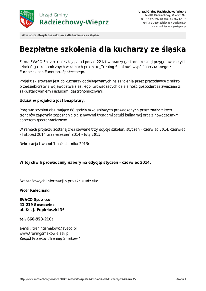 Urząd Gminy Radziechowy-Wieprz 34-381 Radziechowy, Wieprz 700 tel. 33 867 66 10, fax. 33 867 66 13 e-mail: [email protected] www.radziechowy-wieprz.pl Aktualności › Bezpłatne szkolenia dla kucharzy ze śląska Bezpłatne szkolenia dla kucharzy ze śląska Firma EVACO Sp. z o. o. działająca od ponad 22 lat w branży gastronomicznej przygotowała cykl szkoleń gastronomicznych w ramach projektu „Trening Smaków” współfinansowanego z Europejskiego Funduszu Społecznego. Projekt skierowany jest do kucharzy oddelegowanych na szkolenia przez pracodawcę z mikro przedsiębiorstw z województwa śląskiego, prowadzących działalność gospodarczą związaną z zakwaterowaniem i usługami gastronomicznymi. Udział w projekcie jest bezpłatny. Program szkoleń obejmujący 88 godzin szkoleniowych prowadzonych przez znakomitych trenerów zapewnia zapoznanie się z nowymi trendami sztuki kulinarnej oraz z nowoczesnym sprzętem gastronomicznym. W ramach projektu zostaną zrealizowane trzy edycje szkoleń: styczeń – czerwiec 2014, czerwiec – listopad 2014 oraz wrzesień 2014 – luty 2015. Rekrutacja trwa od 1 października 2013r. W tej chwili prowadzimy nabory na edycję: styczeń – czerwiec 2014. Szczegółowych informacji o projekcie udziela: Piotr Kaleciński EVACO Sp. z o.o. 41-219 Sosnowiec ul. Ks. J. Popiełuszki 36 tel. 660-953-210; e-mail: [email protected] www.treningsmakow-slask.pl Zespół Projektu „Trening Smaków ” http://www.radziechowy-wieprz.pl/aktualnosci/bezplatne-szkolenia-dla-kucharzy-ze-slaska,45 Strona 1