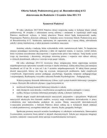 Oferta Szkoły Podstawowej przy ul. Boremlowskiej 6/12 skierowana do Rodziców i Uczniów klas III i VI Szanowni Państwo! W roku szkolnym 2017/2018 Państwa dzieci rozpoczną naukę w kolejnej klasie szkoły podstawowej. W związku z założeniami nowej reformy i zmianami w rejonizacji szkół mają Państwo możliwość wyboru, w której placówce Wasze dzieci będą kontynuowały naukę. Proponujemy Państwa dzieciom edukację w budynku nowo tworzonej Szkoły Podstawowej przy ul. Boremlowskiej 6/12. Serdecznie zapraszamy do zapoznania się z naszą ofertą, odwiedzenia szkoły i strony internetowej, a także poznania warunków nauczania. Jesteśmy szkołą z tradycją, która wykształciła wielu wartościowych ludzi. To bezpieczne miejsce posiadające monitoring, położone z dala od zagrożeń miasta, w zaciszu, wśród zieleni, które wyróżnia niecodzienna obyczajowość i wypracowane przez lata tradycje. Tutaj każdy uczeń czuje się zauważony i doceniony, otrzymuje stosowną pomoc i wsparcie oraz odnosi sukcesy w różnych dziedzinach, odkrywa i rozwija swoje pasje i talenty. Od roku szkolnego 2011/12 tworzymy klasy integracyjne, które zapewniają uczniom niepełnosprawnym optymalne warunki rozwoju w duchu tolerancji. Zaletą takiej klasy jest mniejsza liczebność od 15 do 20, w tym od 3 do 5 uczniów niepełnosprawnych. W takiej klasie pracuje dwóch nauczycieli, którzy nie boją się wyzwań, nietypowych problemów, ludzi cierpliwych i wrażliwych. Zapewniamy pomoc pedagoga, psychologa, logopedy, terapeuty pedagogicznego i socjoterapeuty. Realizujemy wszystkie zalecenia Poradni Psychologiczno – Pedagogicznej. Wykorzystujemy dziennik elektroniczny Librus, czyli system kontroli frekwencji i postępów w nauce. Korzyści dla rodziców płynące z jego korzystania to: możliwość bieżącej kontroli frekwencji dziecka w szkole, stały dostęp do ocen dziecka z możliwością szczegółowej analizy postępów w nauce, szybka, bieżąca wymiana informacji pomiędzy szkołą, a domem rodzinnym. Szkoła skupia zespół doświadczonych nauczycieli, pasjonatów i specjalistów. Większość nauczycieli ukończyła dwa kierunki studiów, wszyscy mają wieloletnie doświadczenie w pracy z młodzieżą oraz indywidualne podejście do ucznia. Mamy nauczycieli doświadczonych w nauczaniu przedmiotów, z którymi Państwa dzieci zetkną się w kolejnych latach edukacji w szkole podstawowej, szczególnie takich jak - chemia, fizyka, geografia, biologia. Społeczną postawę naszych uczniów kształtujemy w szkolnym wolontariacie, Samorządzie Uczniowskim, uczniowie biorą udział w akcjach charytatywnych. Szkoła jest miejscem integracji uczniów, rodziców i nauczycieli, które sprzyja wszechstronnemu rozwojowi. Oferujemy: naukę w ośmioletniej szkole podstawowej na jedną zmianę na wszystkich poziomach, świetlicę szkolną czynną w godzinach 7.00 – 18.00, a na niej „odrabianki”, zajęcia artystyczne i w myśl zasady „nie ma złej pogody, tylko złe ubrania” zadbany o to, aby codziennie dostarczyć dzieciom odpowiednia porcję ruchu i zabaw na świeżym powietrzu, utworzenie oddziałów integracyjnych w miarę potrzeb, nauczanie języka angielskiego w zależności od stopnia znajomości języka oraz nauczanie od podstaw drugiego języka: niemieckiego, rosyjskiego lub hiszpańskiego, wszechstronny rozwój fizyczny poprzez zajęcia na pływalni w klasach II, zmodyfikowany program nauczania wf-u z elementami tańca, zajęcia taneczne, siłownię, zajęcia z gimnastyki korekcyjnej oraz sztuki walki, zajęcia prowadzone przez bardzo dobrze wykwalifikowanych specjalistów, stosujących skuteczne, ciekawe formy pracy i metody nauczania (metody aktywizujące, projekty edukacyjne, np. Szkoła przyjazna prawom człowieka, Trzymaj Formę, Szkoła z klasą, Szkoły Dialogu), dobrą bazę szkoły - pracownie przedmiotowe wyposażone w odpowiednie pomoce naukowe, tablice interaktywne, projektory multimedialne, pracownię informatyczną ze stałym dostępem do Internetu, dwie sale gimnastyczne (w tym jedna ze ścianą lustrzaną przystosowana do zajęć tanecznych), siłownię, bibliotekę z centrum multimedialnym, pracownię językową ze sprzętem multimedialnym – słuchawkami, tabletami dla każdego ucznia, do września wybudowany będzie nowoczesny i bezpieczny plac zabaw, sale lekcyjne i toalety zostaną przystosowane do potrzeb uczniów w każdym wieku, bogatą ofertę zajęć pozalekcyjnych zwiększających szanse edukacyjne uczniów w zależności od potrzeb ukierunkowanych na pracę z uczniem zdolnym lub mającym trudności w nauce, podczas których uczniowie zgłębią i utrwalą wiedzę z poszczególnych dziedzin, mogą też liczyć na fachową pomoc specjalistów, zajęcia rozwijające zdolności plastyczne i muzyczne, np. papieroplastyka, origami, pobudzenie wyobraźni i odkrywanie własnej wrażliwości poprzez kontakt ze sztuką: koncerty w Filharmonii Narodowej, teatr, film, muzea, prelekcje tematyczne, spotkania z ciekawymi ludźmi, realizację wielu ciekawych programów z poszczególnych przedmiotów (eTwinning – europejska współpraca szkół na platformie online, udział w programach Insta.Ling oraz ReadySteadySpeak – rozwijanie umiejętności komunikacyjnych uczniów, Lepsza Szkoła – monitoring umiejętności matematycznych), stołówkę szkolną, ciepłe i smaczne dwudaniowe obiady wraz z deserem w przystępnej cenie, dobrze wyposażony gabinet profilaktyki zdrowotnej i opiekę pielęgniarki, przyjazne nauczanie i realizację podstawy programowej poprzez lekcje w terenie: Centrum Nauki Kopernik, Muzeum Powstania Warszawskiego, Muzeum Pragi, Muzeum Historii Żydów Polskich, "Ogród - Ostoja zwierząt", zielone szkoły, pokazy doświadczeń chemicznych itp. Wyróżnia nas: jesteśmy szkołą kameralną, każdy uczeń jest traktowany jako jednostka, nie "ginie w tłumie", nikt nie jest anonimowy, ciekawa oferta zajęć pozalekcyjnych, która rozwija pasje