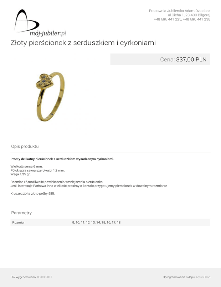 Pracownia Jubilerska Adam Dziadosz ul.Cicha 1, 23-400 Biłgoraj +48 696 441 225, +48 696 441 238 Złoty pierścionek z serduszkiem i cyrkoniami Cena: 337,00 PLN Opis produktu Prosty delikatny pierścionek z serduszkiem wysadzanym cyrkoniami. Wielkość serca 6 mm. Półokrągła szyna szerokości 1,2 mm. Waga 1,35 gr. Rozmiar 16,możliwość powiększenia/zmniejszenia pierścionka. Jeśli interesuje Państwa inna wielkość prosimy o kontakt,przygotujemy pierścionek w dowolnym rozmiarze Kruszec:żółte złoto próby 585. Parametry Rozmiar Plik wygenerowano: 08-03-2017 9, 10, 11, 12, 13, 14, 15, 16, 17, 18 Oprogramowanie sklepu: AptusShop Pracownia Jubilerska Adam Dziadosz ul.Cicha 1, 23-400 Biłgoraj +48 696 441 225, +48 696 441 238 Galeria Plik wygenerowano: 08-03-2017 Powered by TCPDF (www.tcpdf.org) Oprogramowanie sklepu: AptusShop