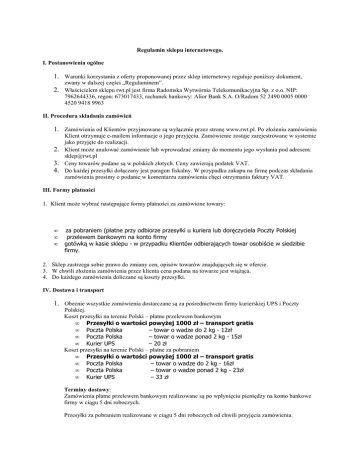 Regulamin sklepu internetowego. I. Postanowienia ogólne 1. Warunki korzystania z oferty proponowanej przez sklep internetowy reguluje poniŜszy dokument, zwany w dalszej części „Regulaminem”. 2. Właścicielem sklepu rwt.pl jest firma Radomska Wytwórnia Telekomunikacyjna Sp. z o.o. NIP: 7962644336, regon: 673017433, rachunek bankowy: Alior Bank S.A. O/Radom 52 2490 0005 0000 4520 9418 9963 II. Procedura składania zamówień 1. Zamówienia od Klientów przyjmowane są wyłącznie przez stronę www.rwt.pl. Po złoŜeniu zamówienia 2. 3. 4. Klient otrzymuje e-mailem informacje o jego przyjęciu. Zamówienie zostaje zarejestrowane w systemie jako przyjęte do realizacji. Klient moŜe anulować zamówienie lub wprowadzać zmiany do momentu jego wysłania pod adresem: [email protected] Ceny towarów podane są w polskich złotych. Ceny zawierają podatek VAT. Do kaŜdej przesyłki dołączany jest paragon fiskalny. W przypadku zakupu na firmę podczas składania zamówienia prosimy o podanie w komentarzu zamówienia chęci otrzymania faktury VAT. III. Formy płatności 1. Klient moŜe wybrać następujące formy płatności za zamówione towary: • • • za pobraniem (płatne przy odbiorze przesyłki u kuriera lub doręczyciela Poczty Polskiej przelewem bankowym na konto firmy gotówką w kasie sklepu - w przypadku Klientów odbierających towar osobiście w siedzibie firmy. 2. Sklep zastrzega sobie prawo do zmiany cen, opisów towarów znajdujących się w ofercie. 3. W chwili złoŜenia zamówienia przez klienta cena podana na towarze jest wiąŜąca. 4. Do kaŜdego zamówienia doliczane są koszty przesyłki. IV. Dostawa i transport 1. Obecnie wszystkie zamówienia dostarczane są za pośrednictwem firmy kurierskiej UPS i Poczty Polskiej. Koszt przesyłki na terenie Polski – płatne przelewem bankowym • Przesyłki o wartości powyŜej 1000 zł – transport gratis • Poczta Polska – towar o wadze do 2 kg - 12zł • Poczta Polska – towar o wadze ponad 2 kg - 15zł • Kurier UPS – 20 zł Koszt przesyłki na terenie Polski – płatne za pobraniem • Przesyłki o wartości powyŜej 1000 zł – transport gratis • Poczta Polska – towar o wadze do 2 kg - 16zł • Poczta Polska – towar o wadze ponad 2 kg - 23zł • Kurier UPS – 33 zł Terminy dostawy: Zamówienia płatne przelewem bankowym realizowane są po wpłynięciu pieniędzy na konto bankowe firmy w ciągu 5 dni roboczych. Przesyłki za pobraniem realizowane w ciągu 5 dni roboczych od chwili przyjęcia zamówienia. V. Reklamacje i zwroty 1. Reklamacje Wszystkie towary dostępne w sklepie są oryginalne, objęte gwarancją producenta oraz fabrycznie nowe. Sprzedawca uwzględnia reklamacje Klientów w przypadku niezgodności z umową towaru konsumpcyjnego w chwili jego wydania na zasadach określonych w ustawie z dnia 27 lipca 2002 r. o szczególnych warunkach sprzedaŜy konsumenckiej oraz o zmianie Kodeksu Cywilnego (DZ. U. Nr 141, poz. 1176). Towar konsumpcyjny to rzecz ruchoma nabywana przez osobę fizyczną w celu niezwiązanym z działalnością gospodarczą. Reklamowany towar powinien być odesłany za pośrednictwem Poczty Polskiej, na adres firmy: Radomska Wytwórnia Telekomunikacyjna Sp. z o.o. ul.Słowackiego 55 26-600 Radom Polska Przesyłka powinna być opłacona przez klienta. Koszty klienta związane z odesłaniem towaru reklamowanego, sklep zwraca natychmiast po otrzymaniu przesyłki i pozytywnym rozpatrzeniu reklamacji. Towar reklamowany, przesłany na adres firmy za pobraniem nie będzie przyjmowany. Towar uszkodzony zostanie wymieniony na inny, pełnowartościowy, a jeśli będzie to niemoŜliwe, sklep zwróci Nabywcy równowartość ceny produktu lub zaoferuje mu inne dostępne towary do wyboru. Reklamacje dotyczące uszkodzeń mechanicznych powstałych podczas transportu będą rozpatrywane tylko po sporządzeniu protokołu szkody w obecności kuriera. 2. Zwroty Zgodnie z Ustawą z 2 marca 2000 roku „ O ochronie niektórych praw konsumentów oraz o odpowiedzialności za szkodę wyrządzoną przez produkt niebezpieczny” Klient moŜe zrezygnować z towaru kupionego w naszym sklepie bez podania przyczyny w ciągu dziesięciu dni od daty odebrania przesyłki. Aby odstąpić od umowy zawartej na odległość Klient zobowiązany jest złoŜyć pisemne oświadczenie o odstąpieniu od umowy oraz przesłać je na adres [email protected]. KaŜdy odsyłany towar musi być nieuŜywany, z oryginalnymi plombami i oznaczeniami, zapakowany w bezpieczny sposób. Sklep gwarantuje zwrot kwoty równej cenie towaru. Pieniądze zostaną zwrócone przelewem bankowym na konto wskazane przez Klienta lub przekazem pocztowym pod adresem wskazanym w zamówieniu. Koszt dostawy i odesłania towaru nie podlega zwrotowi. Pieniądze zwracane są w terminie 7 dni roboczych. W przypadku braku informacji, zwrot dokonany będzie po wyjaśnieniu sytuacji. W przypadku zwrotu w celu wymiany na inny produkt równieŜ prosimy o wcześniejszą informację na adres [email protected]. W sprawach nieuregulowanych w niniejszym regulaminie obowiązują przepisy Kodeksu Cywilnego oraz ustawy o ochronie niektórych praw konsumentów oraz odpowiedzialności za szkodę wyrządzoną przez produkt niebezpieczny z dnia 31 marca 2000r. (Dz. U. Nr 22 poz. 271). VI. Postanowienia końcowe Dane osobowe zawarte w formularzach przechowujemy i przetwarzamy w sposób zgodny z zakresem udzielonego przez uŜytkownika zezwolenia oraz wymogami prawa polskiego, w szczególności w zgodzie z ustawą o ochronie danych osobowych z dnia 29 sierpnia 1997 roku (Dz. U. Nr 133, poz. 883 z późniejszymi zmianami). Składając zamówienie Klient akceptuje powyŜszy regulamin.