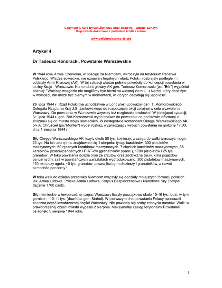 Copyright © Koło Byłych Żołnierzy Armii Krajowej - Oddział Londyn Kopiowanie dozwolone z podaniem źródła i autora www.polishresistance-ak.org Artykuł 4 Dr Tadeusz Kondracki, Powstanie Warszawskie W 1944 roku Armia Czerwona, w pościgu za Niemcami, wkroczyła na terytorium Państwa Polskiego. Władze sowieckie, nie uznawały legalnych władz Polski i rozbrajały podległe im oddziały Armii Krajowej (AK). W tej sytuacji władze polskie powróciły do koncepcji powstania w stolicy Kraju - Warszawie. Komendant główny AK gen. Tadeusz Komorowski (ps. "Bór") wyjaśniał później: "Walcząc wszędzie nie mogliśmy być bierni na własnej ziemi (..:) Naród, który chce żyć w wolności, nie może być biernym w momentach, w których decydują się jego losy". 26 lipca 1944 r. Rząd Polski (na uchodźstwie w Londynie) upoważnił gen. T. Komorowskiego i Delegata Rządu na Kraj J.S. Jankowskiego do rozpoczęcia akcji zbrojnej w celu wyzwolenia Warszawy. Do powstania w Warszawie wzywały też rozgłośnie sowieckie! W istniejącej sytuacji, 31 lipca 1944 r. gen. Bór-Komorowski wydał rozkaz do powstania na podstawie informacji o zbliżaniu się do miasta wojsk sowieckich. W następstwie komendant Okręgu Warszawskiego AK płk A. Chruściel (ps."Monter") wydał rozkaz, wyznaczający wybuch powstania na godzinę 17.00, dnia 1 sierpnia 1944 r. Siły Okręgu Warszawskiego AK liczyły około 50 tys. żołnierzy, z czego do walki wyruszyć mogło 23 tys. Na ich uzbrojeniu znajdowało się 1 sierpnia: tysiąc karabinów, 300 pistoletów maszynowych, 60 ręcznych karabinów maszynowych, 7 ciężkich karabinów maszynowych, 35 karabinów przeciwpancernych i PIAT-ów (granatników ppanc.), 1700 pistoletów i 25 tys. granatów. W toku powstania doszła broń ze zrzutów oraz zdobyczna (m.in. kilka pojazdów pancernych), zaś w powstańczych warsztatach wyprodukowano: 300 pistoletów maszynowych, 150 miotaczy ognia, 40 tys. granatów, pewną liczbę moździerzy i granatników, a nawet samochód pancerny ! W toku walk do działań przeciwko Niemcom włączyły się oddziały mniejszych formacji polskich, jak: Armia Ludowa, Polska Armia Ludowa, Korpus Bezpieczeństwa i Narodowe Siły Zbrojne (łącznie 1700 osób). Siły niemieckie w lewobrzeżnej części Warszawy liczyły początkowo około 15-16 tys. ludzi, w tym garnizon - 10-11 tys. (dowódca gen. Stahel). W pierwszym dniu powstania Polacy opanowali znaczną część lewobrzeżnej części Warszawy. Nie powiodły się próby zdobycia mostów. Walki w prawobrzeżnej części miasta wygasły 2 sierpnia. Maksymalny zasięg terytorialny Powstanie osiągnęło 5 sierpnia 1944 roku. 1 Mapka nr 1: Warszawa - 5.VIII.1944 r. Największy zasięg Powstania Źródło: Armia Krajowa w dokumentach, Tom IV, SPP Londyn 1977 Niemcy przystąpili do rozprawy z Warszawą. Duże posiłki dotarły już 3 i 4 sierpnia (kilka tysięcy esesmanów i policjantów). Reichsfuehrer SS Himmler wydał rozkaz: "Każdego mieszkańca należy zabić, nie wolno brać żadnych jeńców. Warszawa ma być zrównana z ziemią i w ten sposób ma być stworzony zastraszający przykład dla całej Europy". Zasadniczym celem Niemców było przebicie przez miasto tras na osi zachód - wschód, w stronę mostów na Wiśle, a następnie niszczenie rejonów powstańczych, w pierwszej kolejności tych, które przylegały do rzeki. W dniach 5-6 sierpnia nastąpiło uderzenie niemieckie od strony Woli w kierunku mostu Kierbedzia, które przedzieliło obszary kontrolowane przez siły AK. Na zajętych obszarach, zwłaszcza na Woli, siły niemieckie dopuszczały się masowych zbrodni na ludności cywilnej (około 25-30 tysięcy rozstrzelanych). Zaznaczył się podział terenów kontrolowanych przez powstańców na trzy rejony: • Północny z obszarem cmentarzy, dawnego Getta, Starym Miastem, Żoliborzem i lasami na północ od miasta; • Rejon Śródmieścia z Powiślem i Czerniakowem; • Rejon południowy - Mokotów z Sadybą oraz oddziały AK w lasach na południe Warszawy Od pierwszych dni Powstania w mieście stworzono namiastkę normalnego życia - powstał system dystrybucji żywności, uruchomiono harcerską pocztę. 8 sierpnia pierwszą audycję nadała powstańcza radiostacja "Błyskawica". Niemcy sukcesywnie wzmacniali swoje wojska w Warszawie. Tłumieniem Powstania kierował generał SS i policji Erich von dem Bach Zalewski. Do 20 sierpnia jego siły osiągnęły liczebność około 25 tys. żołnierzy. W walkach uczestniczyły okresowo oddziały trzech dywizji pancernych (25 DPanc., 19 DPanc. i Dywizji "Hermann Goering"). Oprócz lotnictwa bombowego, Niemcy użyli licznych pododdziałów saperów, samobieżnych min "Goliat" i czołgów wybuchowych do niszczenia umocnień, wyrzutni rakietowych oraz najcięższej artylerii (z moździerzem "Karl" o kalibrze 600 mm!). 11 sierpnia padł ostatni punkt oporu powstańców w dzielnicy Ochota, zaś siły AK zostały wyparte z dzielnicy Wola. 19 sierpnia Niemcy przypuścili generalny szturm na Stare Miasto. Nie powiodły się dwie próby AK przebicia (w otwartym terenie) zapory niemieckiej oddzielającej Stare Miasto od Żoliborza (20-22 sierpnia; 400 poległych i rannych). Znacznie skuteczniej oddziały powstańcze walczyły w terenie zabudowanym, który w pewnym stopniu niwelował niemiecką przewagę w 2 uzbrojeniu. Największe sukcesy powstańcze ostatniej dekady sierpnia, to zdobycie 20 sierpnia bastionu niemieckiego w gmachu Polskiej Akcyjnej Spółki Telefonicznej (PAST-y) przy ul. Zielnej oraz 23 sierpnia - komendy policji przy ul. Krakowskie Przedmieście i stacji telefonów przy ul. Piusa XI. Już w sierpniu siły powstańcze na szeroką skalę wykorzystywały system kanałów do komunikacji pod obszarami kontrolowanymi przez wroga. I tak, do końca walk o Stare Miasto (do 2 września) większość obrońców tej części Warszawy przeszła kanałami - do Śródmieścia (4,5 tys.) i na Żoliborz (800 osób). Dużym wsparciem dla 