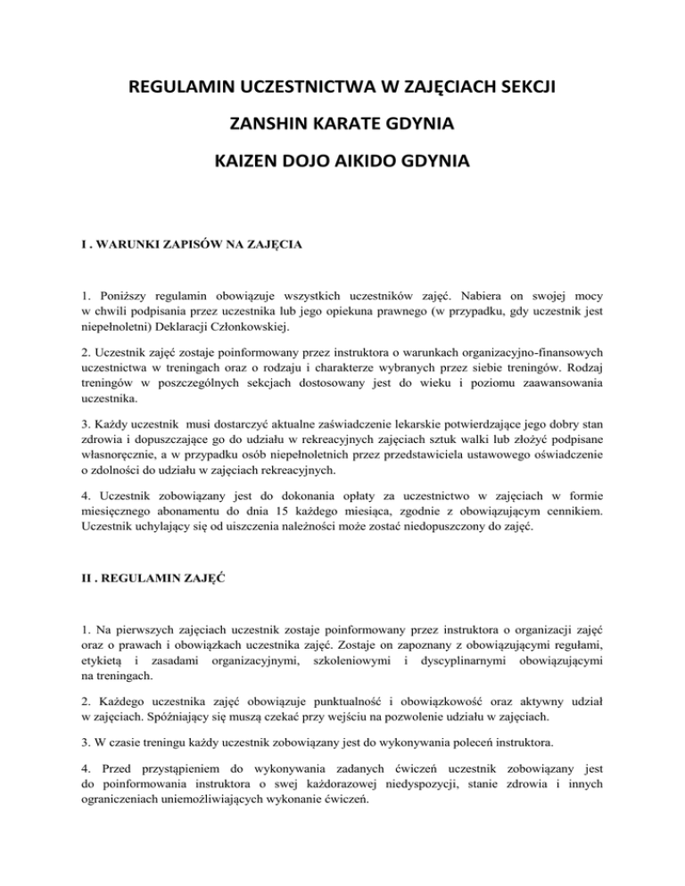 REGULAMIN UCZESTNICTWA W ZAJĘCIACH SEKCJI ZANSHIN KARATE GDYNIA KAIZEN DOJO AIKIDO GDYNIA I . WARUNKI ZAPISÓW NA ZAJĘCIA 1. Poniższy regulamin obowiązuje wszystkich uczestników zajęć. Nabiera on swojej mocy w chwili podpisania przez uczestnika lub jego opiekuna prawnego (w przypadku, gdy uczestnik jest niepełnoletni) Deklaracji Członkowskiej. 2. Uczestnik zajęć zostaje poinformowany przez instruktora o warunkach organizacyjno-finansowych uczestnictwa w treningach oraz o rodzaju i charakterze wybranych przez siebie treningów. Rodzaj treningów w poszczególnych sekcjach dostosowany jest do wieku i poziomu zaawansowania uczestnika. 3. Każdy uczestnik musi dostarczyć aktualne zaświadczenie lekarskie potwierdzające jego dobry stan zdrowia i dopuszczające go do udziału w rekreacyjnych zajęciach sztuk walki lub złożyć podpisane własnoręcznie, a w przypadku osób niepełnoletnich przez przedstawiciela ustawowego oświadczenie o zdolności do udziału w zajęciach rekreacyjnych. 4. Uczestnik zobowiązany jest do dokonania opłaty za uczestnictwo w zajęciach w formie miesięcznego abonamentu do dnia 15 każdego miesiąca, zgodnie z obowiązującym cennikiem. Uczestnik uchylający się od uiszczenia należności może zostać niedopuszczony do zajęć. II . REGULAMIN ZAJĘĆ 1. Na pierwszych zajęciach uczestnik zostaje poinformowany przez instruktora o organizacji zajęć oraz o prawach i obowiązkach uczestnika zajęć. Zostaje on zapoznany z obowiązującymi regułami, etykietą i zasadami organizacyjnymi, szkoleniowymi i dyscyplinarnymi obowiązującymi na treningach. 2. Każdego uczestnika zajęć obowiązuje punktualność i obowiązkowość oraz aktywny udział w zajęciach. Spóźniający się muszą czekać przy wejściu na pozwolenie udziału w zajęciach. 3. W czasie treningu każdy uczestnik zobowiązany jest do wykonywania poleceń instruktora. 4. Przed przystąpieniem do wykonywania zadanych ćwiczeń uczestnik zobowiązany jest do poinformowania instruktora o swej każdorazowej niedyspozycji, stanie zdrowia i innych ograniczeniach uniemożliwiających wykonanie ćwiczeń. 5. Każdy uczestnik zajęć ma prawo odmówić wykonania ćwiczenia wskazanego przez instruktora, jeśli uzna je za niebezpieczne dla swego stanu zdrowia lub jeśli ćwiczenie przekroczy jego możliwości fizyczne. 6. Uczestnikowi nie wolno samowolnie opuszczać sali, w razie potrzeby problem należy zgłosić instruktorowi. 7. Jeżeli w czasie treningu używa się jakiegokolwiek sprzętu sportowego, należy go po ćwiczeniach właściwie złożyć w wyznaczonym przez instruktora miejscu. 8. W razie niewłaściwego zachowania uczestnika zajęć, prowadzący zajęcia ma prawo do wyciągnięcia wobec niego konsekwencji - do usunięcia z zajęć włącznie. 9. Zabrania się uczestnictwa w zajęciach w trakcie choroby lub po spożyciu alkoholu lub innych środków odurzających. 10. W trakcie treningu zabrania się spożywania jakichkolwiek pokarmów. Picie płynów dozwolone jest tylko za zgodą instruktora. 11.W czasie treningów obowiązuje bezwzględny zakaz żucia gumy, noszenia wszelkiej biżuterii, zegarków oraz innych ozdób mogących stanowić zagrożenie dla zdrowia któregokolwiek z ćwiczących. Paznokcie u rąk i stóp powinny być obcięte. 12. Zabrania się przebywania na sali treningowej pod nieobecność instruktora. 13. Instruktor prowadzący zajęcia nie ponosi odpowiedzialności za wypadki zaistniałe w czasie trwania ćwiczeń wynikające ze złego stanu zdrowia oraz niestosowania się do poleceń instruktora oraz wykonywania ćwiczeń samodzielnie podczas nieobecności i bez nadzoru instruktora. 14. Uczestnika zajęć obowiązuje dbałość o porządek i dobry stan udostępnianego sprzętu sportowego oraz miejsca treningowego. Za wszelkie szkody powstałe z winy uczestnika zajęć ponosi on odpowiedzialność finansową, a w przypadku osób niepełnoletnich jego rodzice lub opiekun prawny. 15. Instruktor nie ponosi odpowiedzialności za rzeczy pozostawione, uszkodzone lub zgubione w szatni lub innych pomieszczeniach. Przedmioty wartościowe ćwiczący może oddać instruktorowi w depozyt. 16. W przypadku odniesienia urazu, kontuzji lub złego samopoczucia uczestnik zajęć powinien natychmiast zgłosić się do instruktora i poinformować go o swoich dolegliwościach. Instruktor ma obowiązek udzielić pierwszej pomocy uczestnikowi. 17. Instruktor nie odpowiada za osoby przebywające poza salą ćwiczeń. Osoby niepełnoletnie, które przebywają poza salą ćwiczeń przed rozpoczęciem zajęć, podczas ich trwania (wyjście do toalety) oraz po ich zakończeniu pozostają zawsze pod opieką rodziców/opiekunów prawnych. 19. Instruktor jest zobowiązany do prowadzenia zajęć w ustalonych dniach i godzinach z wyjątkiem świąt i innych dni ustawowo wolnych od pracy. W przypadku konieczności odwołania zajęć przez instruktora uczestnicy zostaną poinformowani o tym fakcie możliwie jak najwcześniej. 20. Podczas zajęć dopuszcza się możliwość ich dokumentacji w postaci filmów i zdjęć, które mogą być wykorzystane w materiałach zamieszczonych na stronie internetowej organizatora zajęć lub facebook’u w celach informacyjnych i promocyjnych. Uprzedza się o tym ćwiczących (a w imieniu osób niepełnoletnich ich rodziców/opiekunów ustawowych) i zakłada, że wyrażają oni zgodę na publikację swojego wizerunku, o ile w/w osoby nie zrobią stosownego zastrzeżenia w formie pisemnej, przy czym w przypadku osób niepełnoletnich wystarczy tylko zastrzeżenie ze strony jednego z rodziców/opiekunów. III . STRÓJ TRENINGOWY 1. Uczestnik zajęć zobowiązany jest do posiadania czystej i schludnej karategi lub aikidogi w kolorze białym albo innego stroju sportowego (dres, podkoszulek bawełniany). Ćwiczenia odbywają się na boso lub w specjalnym obuwiu przeznaczonym do ćwiczeń na sali. 2. Uczestnik zajęć zaawansowanych jest zobowiązany do zaopatrzeni