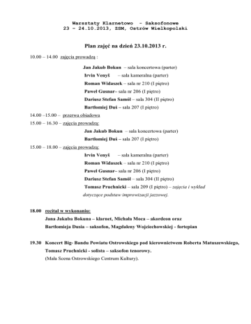 Warsztaty Klarnetowo - Saksofonowe 23 – 24.10.2013, ZSM, Ostrów Wielkopolski Plan zajęć na dzień 23.10.2013 r. 10.00 – 14.00 zajęcia prowadzą : Jan Jakub Bokun – sala koncertowa (parter) Irvin Venyš – sala kameralna (parter) Roman Widaszek – sala nr 210 (I piętro) Paweł Gusnar– sala nr 206 (I piętro) Dariusz Stefan Samól – sala 304 (II piętro) Bartłomiej Duś – sala 207 (I piętro) 14.00 –15.00 – przerwa obiadowa 15.00 – 16.30 – zajęcia prowadzą: Jan Jakub Bokun – sala koncertowa (parter) Bartłomiej Duś – sala 207 (I piętro) 15.00 – 18.00 – zajęcia prowadzą: Irvin Venyš – sala kameralna (parter) Roman Widaszek – sala nr 210 (I piętro) Paweł Gusnar– sala nr 206 (I piętro) Dariusz Stefan Samól – sala 304 (II piętro) Tomasz Pruchnicki – sala 209 (I piętro) – zajęcia i wykład dotyczące podstaw improwizacji jazzowej. 18.00 recital w wykonaniu: Jana Jakuba Bokuna – klarnet, Michała Moca – akordeon oraz Bartłomieja Dusia – saksofon, Magdaleny Wojciechowskiej - fortepian 19.30 Koncert Big- Bandu Powiatu Ostrowskiego pod kierownictwem Roberta Matuszewskiego, Tomasz Pruchnicki - solista – saksofon tenorowy. (Mała Scena Ostrowskiego Centrum Kultury). Plan zajęć na 24.10.2013 r. 10.00 –14.00 – zajęcia prowadzą: Paweł Gusnar – sala koncertowa (parter) Irvin Venyš – sala kameralna (parter) Jan Jakub Bokun – sala nr 206 (I piętro) Bartłomiej Duś – sala 207 (I piętro) 14.00 – 15.00 - przerwa obiadowa 15.00 – 16.30 – zajęcia prowadzi: Paweł Gusnar – sala koncertowa (parter) 15.00 – 18.00 – zajęcia prowadzą: Irvin Venyš – sala kameralna (parter) Jan Jakub Bokun – sala nr 206 (I piętro) Bartłomiej Duś – sala 207 (I piętro) 18.00 recital w wykonaniu : Pawła Gusnara – saksofon i Bogny Dulińskiej – fortepian Warsztatom będzie towarzyszyć wystawa akcesoriów i instrumentów dętych prowadzona przez renomowanych przedstawicieli handlowych w Polsce. Na miejscu będzie istniała także możliwość dokonania profesjonalnych korekt i napraw instrumentów przez licencjonowanego serwisanta Mariusza Steca.