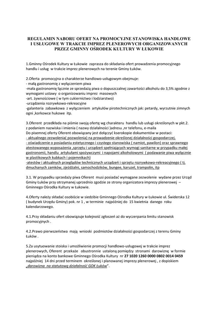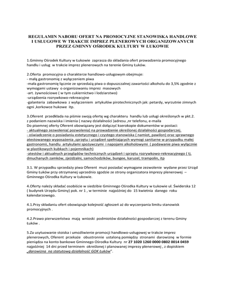 REGULAMIN NABORU OFERT NA PROMOCYJNE STANOWISKA HANDLOWE I USŁUGOWE W TRAKCIE IMPREZ PLENEROWYCH ORGANIZOWANYCH PRZEZ GMINNY OŚRODEK KULTURY W ŁUKOWIE 1.Gminny Ośrodek Kultury w Łukowie zaprasza do składania ofert prowadzenia promocyjnego handlu i usług w trakcie imprez plenerowych na terenie Gminy Łuków. 2.Oferta promocyjna o charakterze handlowo‐usługowym obejmuje: ‐ małą gastronomię z wyłączeniem piwa ‐mała gastronomię łącznie ze sprzedażą piwa o dopuszczalnej zawartości alkoholu do 3,5% zgodnie z wymogami ustawy o organizowaniu imprez masowych ‐art. żywnościowe ( w tym cukiernictwo i lodziarstwo) ‐urządzenia rozrywkowo‐rekreacyjne ‐galanteria zabawkowa z wyłączeniem artykułów pirotechnicznych jak: petardy, wyrzutnie zimnych ogni ,korkowce hukowe itp. 3.Oferent przedkłada na piśmie swoją ofertę wg charakteru handlu lub usługi określonych w pkt.2. z podaniem nazwiska i imienia ( nazwy działalności )adresu ,nr telefonu, e‐maila Do pisemnej oferty Oferent obowiązany jest dołączyć kserokopie dokumentów w postaci: ‐ aktualnego zezwolenia( pozwolenia) na prowadzenie określonej działalności gospodarczej. ‐ oświadczenie o posiadaniu estetycznego i czystego stanowiska ( namiot, pawilon) oraz sprawnego atestowanego wyposażenia ,sprzętu i urządzeń spełniających wymogi sanitarne w przypadku małej gastronomii, handlu artykułami spożywczymi i napojami alkoholowymi ( podawanie piwa wyłącznie w plastikowych kubkach i pojemnikach) ‐atestów i aktualnych przeglądów technicznych urządzeń i sprzętu rozrywkowo‐rekreacyjnego ( tj. dmuchanych zamków, zjeżdżalni, samochodzików, bungee, karuzel, trampolin, itp 3.1. W przypadku sprzedaży piwa Oferent musi posiadać wymagane zezwolenie wydane przez Urząd Gminy Łuków przy otrzymanej uprzednio zgodzie ze strony organizatora imprezy plenerowej – Gminnego Ośrodka Kultury w Łukowie. 4.Oferty należy składać osobiście w siedzibie Gminnego Ośrodka Kultury w Łukowie ul. Świderska 12 ( budynek Urzędu Gminy) pok. nr 1 , w terminie najpóźniej do 15 kwietnia danego roku kalendarzowego. 4.1.Przy składaniu ofert obowiązuje kolejność zgłoszeń aż do wyczerpania limitu stanowisk promocyjnych . 4.2.Prawo pierwszeństwa mają wnioski podmiotów działalności gospodarczej z terenu Gminy Łuków . 5.Za usytuowanie stoiska i umożliwienie promocji handlowo‐usługowej w trakcie imprez plenerowych, Oferent przekaże obustronnie ustaloną pomiędzy stronami darowiznę w formie pieniądza na konto bankowe Gminnego Ośrodka Kultury nr 27 1020 1260 0000 0802 0014 0459 najpóźniej 14 dni przed terminem określonej i planowanej imprezy plenerowej , z dopiskiem „darowizna na statutową działalność GOK Łuków”. 5.1. W przypadku odwołania imprezy plenerowej , Oferent otrzyma zwrot wpłaconej darowizny w terminie najpóźniej 7 dni od daty odwołanej imprezy plenerowej. 5.2. Organizator zastrzega sobie prawo do odwołania imprezy plenerowej bez podania przyczyny. 6. Oferent zobowiązany jest do zabezpieczenia swojego stanowiska promocyjnego podczas całego czasu trwania imprezy plenerowej i dbania o porządek w bezpośrednim sąsiedztwie swojego stanowiska. 7.Oferty nie spełniające warunków określonych w pkt. 3 i 3.1. Regulaminu ,nie będą rozpatrywane. 8. Dokonanie wpłaty darowizny przez Oferenta na konto bankowe Gminnego Ośrodka Kultury w Łukowie jest potwierdzeniem na możliwość usytuowania swojego stanowiska promocyjnego w trakcie imprezy plenerowej i jednoznaczne potwierdza przyjęcie i akceptację treści niniejszego Regulaminu. 9.Wykaz planowanych imprez plenerowych organizowanych przez Gminny Ośrodek Kultury w Łukowie zawarty jest w Planie Lokalnych Inicjatyw Kulturalnych P.L.I.K. literą P( program działalności kulturalnej ) umieszczonym na pierwszej stronie witryny internetowej www.lukow.ug.gov.pl oraz w jej w zakładce „GOK” . 10. Regulamin nie dotyczy Jarmarków Wielkanocnego i Bożonarodzeniowego, dla których ma zastosowanie odrębny regulamin. 11.Regulamin wchodzi w życie z dniem 24.03.2014 na podstawie Zarządzenia nr4/2014 Dyrektora Gminnego Ośrodka Kultury w Łukowie w sprawie Regulaminu naboru ofert na promocyjne stanowiska handlowe i usługowe w trakcie imprez plenerowych organizowanych przez Gminny Ośrodek Kultury w Łukowie Henryk Wysocki Dyrektor Gminnego Ośrodka Kultury w Łukowie