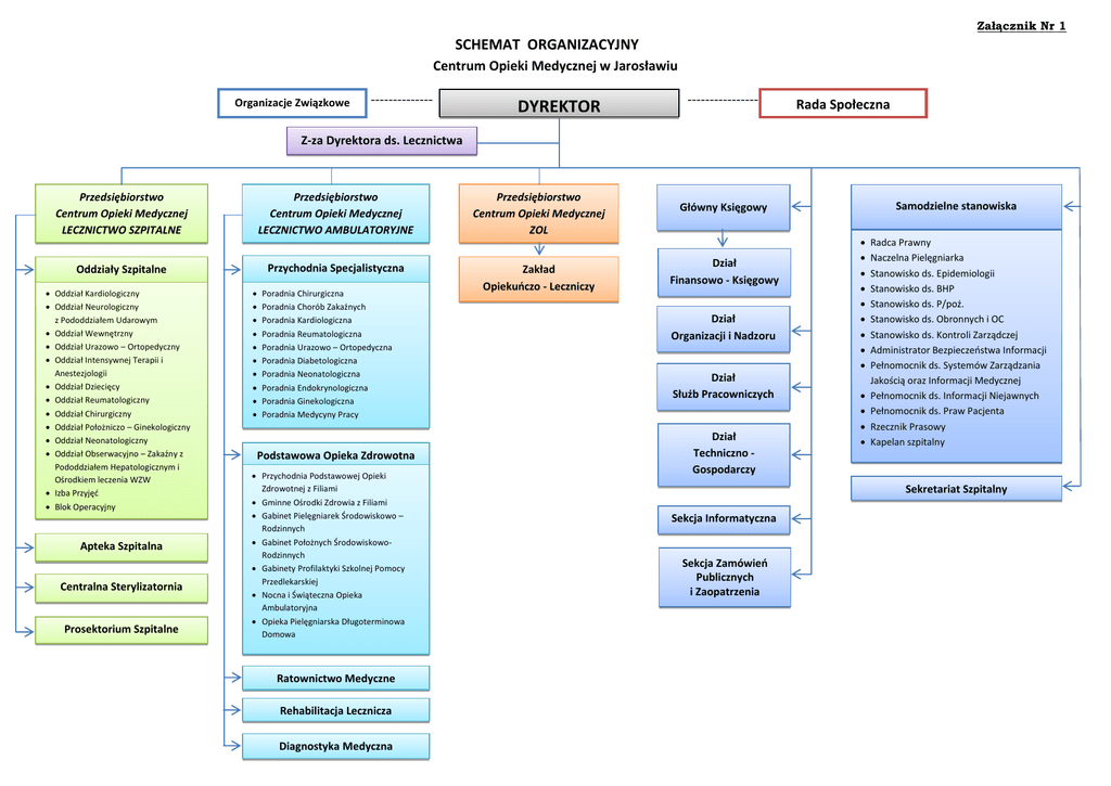 Załącznik Nr 1 SCHEMAT ORGANIZACYJNY Centrum Opieki Medycznej w Jarosławiu Organizacje Związkowe -------------- DYREKTOR ---------------- Rada Społeczna Z-za Dyrektora ds. Lecznictwa Przedsiębiorstwo Centrum Opieki Medycznej LECZNICTWO SZPITALNE Przedsiębiorstwo Centrum Opieki Medycznej LECZNICTWO AMBULATORYJNE Przychodnia Specjalistyczna Oddziały Szpitalne Oddział Kardiologiczny Oddział Neurologiczny z Pododdziałem Udarowym Oddział Wewnętrzny Oddział Urazowo – Ortopedyczny Oddział Intensywnej Terapii i Anestezjologii Oddział Dziecięcy Oddział Reumatologiczny Oddział Chirurgiczny Oddział Położniczo – Ginekologiczny Oddział Neonatologiczny Oddział Obserwacyjno – Zakaźny z Pododdziałem Hepatologicznym i Ośrodkiem leczenia WZW Izba Przyjęd Blok Operacyjny Apteka Szpitalna Centralna Sterylizatornia Prosektorium Szpitalne Poradnia Chirurgiczna Poradnia Chorób Zakaźnych Poradnia Kardiologiczna Poradnia Reumatologiczna Poradnia Urazowo – Ortopedyczna Poradnia Diabetologiczna Poradnia Neonatologiczna Poradnia Endokrynologiczna Poradnia Ginekologiczna Poradnia Medycyny Pracy Podstawowa Opieka Zdrowotna Przychodnia Podstawowej Opieki Zdrowotnej z Filiami Gminne Ośrodki Zdrowia z Filiami Gabinet Pielęgniarek Środowiskowo – Rodzinnych Gabinet Położnych ŚrodowiskowoRodzinnych Gabinety Profilaktyki Szkolnej Pomocy Przedlekarskiej Nocna i Świąteczna Opieka Ambulatoryjna Opieka Pielęgniarska Długoterminowa Domowa Ratownictwo Medyczne Rehabilitacja Lecznicza Diagnostyka Medyczna Przedsiębiorstwo Centrum Opieki Medycznej ZOL Zakład Opiekuoczo - Leczniczy Samodzielne stanowiska Główny Księgowy Dział Finansowo - Księgowy Dział Organizacji i Nadzoru Dział Służb Pracowniczych Dział Techniczno Gospodarczy Radca Prawny Naczelna Pielęgniarka Stanowisko ds. Epidemiologii Stanowisko ds. BHP Stanowisko ds. P/poż. Stanowisko ds. Obronnych i OC Stanowisko ds. Kontroli Zarządczej Administrator Bezpieczeostwa Informacji Pełnomocnik ds. Systemów Zarządzania Jakością oraz Informacji Medycznej Pełnomocnik ds. Informacji Niejawnych Pełnomocnik ds. Praw Pacjenta Rzecznik Prasowy Kapelan szpitalny Sekretariat Szpitalny Sekcja Informatyczna Sekcja Zamówieo Publicznych i Zaopatrzenia