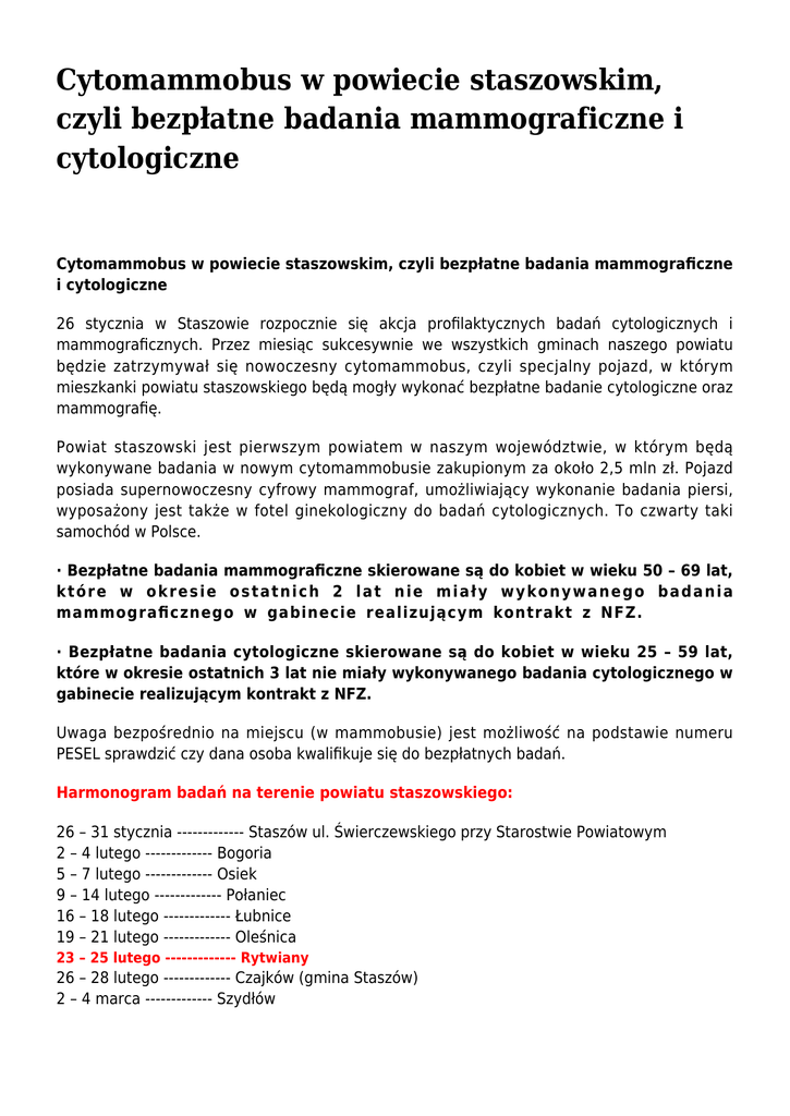 Cytomammobus w powiecie staszowskim, czyli bezpłatne badania mammograficzne i cytologiczne Cytomammobus w powiecie staszowskim, czyli bezpłatne badania mammograficzne i cytologiczne 26 stycznia w Staszowie rozpocznie się akcja profilaktycznych badań cytologicznych i mammograficznych. Przez miesiąc sukcesywnie we wszystkich gminach naszego powiatu będzie zatrzymywał się nowoczesny cytomammobus, czyli specjalny pojazd, w którym mieszkanki powiatu staszowskiego będą mogły wykonać bezpłatne badanie cytologiczne oraz mammografię. Powiat staszowski jest pierwszym powiatem w naszym województwie, w którym będą wykonywane badania w nowym cytomammobusie zakupionym za około 2,5 mln zł. Pojazd posiada supernowoczesny cyfrowy mammograf, umożliwiający wykonanie badania piersi, wyposażony jest także w fotel ginekologiczny do badań cytologicznych. To czwarty taki samochód w Polsce. · Bezpłatne badania mammograficzne skierowane są do kobiet w wieku 50 – 69 lat, które w okresie ostatnich 2 lat nie miały wykonywanego badania mammograficznego w gabinecie realizującym kontrakt z NFZ. · Bezpłatne badania cytologiczne skierowane są do kobiet w wieku 25 – 59 lat, które w okresie ostatnich 3 lat nie miały wykonywanego badania cytologicznego w gabinecie realizującym kontrakt z NFZ. Uwaga bezpośrednio na miejscu (w mammobusie) jest możliwość na podstawie numeru PESEL sprawdzić czy dana osoba kwalifikuje się do bezpłatnych badań. Harmonogram badań na terenie powiatu staszowskiego: 26 – 31 stycznia ------------- Staszów ul. Świerczewskiego przy Starostwie Powiatowym 2 – 4 lutego ------------- Bogoria 5 – 7 lutego ------------- Osiek 9 – 14 lutego ------------- Połaniec 16 – 18 lutego ------------- Łubnice 19 – 21 lutego ------------- Oleśnica 23 – 25 lutego ------------- Rytwiany 26 – 28 lutego ------------- Czajków (gmina Staszów) 2 – 4 marca ------------- Szydłów Źródło: Starostwo Powiatowe w Staszowie - staszowski.eu, 19.01.2009r. Gmina Rytwiany - www.rytwiany.com.pl