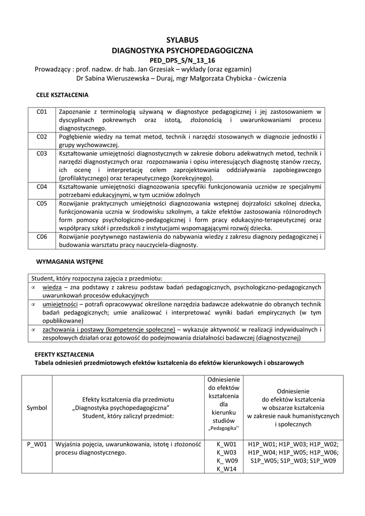 SYLABUS DIAGNOSTYKA PSYCHOPEDAGOGICZNA PED_DPS_S/N_13_16 Prowadzący : prof. nadzw. dr hab. Jan Grzesiak – wykłady (oraz egzamin) Dr Sabina Wieruszewska – Duraj, mgr Małgorzata Chybicka - ćwiczenia CELE KSZTAŁCENIA C01 C02 C03 C04 C05 C06 Zapoznanie z terminologią używaną w diagnostyce pedagogicznej i jej zastosowaniem w dyscyplinach pokrewnych oraz istotą, złożonością i uwarunkowaniami procesu diagnostycznego. Pogłębienie wiedzy na temat metod, technik i narzędzi stosowanych w diagnozie jednostki i grupy wychowawczej. Kształtowanie umiejętności diagnostycznych w zakresie doboru adekwatnych metod, technik i narzędzi diagnostycznych oraz rozpoznawania i opisu interesujących diagnostę stanów rzeczy, ich ocenę i interpretację celem zaprojektowania oddziaływania zapobiegawczego (profilaktycznego) oraz terapeutycznego (korekcyjnego). Kształtowanie umiejętności diagnozowania specyfiki funkcjonowania uczniów ze specjalnymi potrzebami edukacyjnymi, w tym uczniów zdolnych Rozwijanie praktycznych umiejętności diagnozowania wstępnej dojrzałości szkolnej dziecka, funkcjonowania ucznia w środowisku szkolnym, a także efektów zastosowania różnorodnych form pomocy psychologiczno-pedagogicznej i form pracy edukacyjno-terapeutycznej oraz współpracy szkół i przedszkoli z instytucjami wspomagającymi rozwój dziecka. Rozwijanie pozytywnego nastawienia do nabywania wiedzy z zakresu diagnozy pedagogicznej i budowania warsztatu pracy nauczyciela-diagnosty. WYMAGANIA WSTĘPNE Student, który rozpoczyna zajęcia z przedmiotu: • wiedza – zna podstawy z zakresu podstaw badań pedagogicznych, psychologiczno-pedagogicznych uwarunkowań procesów edukacyjnych • umiejętności – potrafi opracowywać określone narzędzia badawcze adekwatnie do obranych technik badań pedagogicznych; umie analizować i interpretować wyniki badań empirycznych (w tym opublikowane) • zachowania i postawy (kompetencje społeczne) – wykazuje aktywność w realizacji indywidualnych i zespołowych działań oraz gotowość do podejmowania działalności badawczej (diagnostycznej) EFEKTY KSZTAŁCENIA Tabela odniesień przedmiotowych efektów kształcenia do efektów kierunkowych i obszarowych Symbol Efekty kształcenia dla przedmiotu „Diagnostyka psychopedagogiczna” Student, który zaliczył przedmiot: Odniesienie do efektów kształcenia dla kierunku studiów „Pedagogika’’ P_W01 Wyjaśnia pojęcia, uwarunkowania, istotę i złożoność procesu diagnostycznego. K_W01 K_W03 K_ W09 K_W14 Odniesienie do efektów kształcenia w obszarze kształcenia w zakresie nauk humanistycznych i społecznych H1P_W01; H1P_W03; H1P_W02; H1P_W04; H1P_W05; H1P_W06; S1P_W05; S1P_W03; S1P_W09 P_W02 Rozpoznaje problemy edukacyjne występujące w przedszkolu i szkole, identyfikuje indywidualne potrzeby i możliwości dziecka, a także rozpoznaje objawy zagrożeń i trudności szkolnych. P_W03 Nazywa i charakteryzuje edukacyjne dziecka. P_U01 Potrafi dobierać techniki badawcze do diagnozy określonych problemów edukacyjnych. P_U02 Potrafi zaprojektować i przeprowadzić badania diagnostyczne w środowisku edukacyjnym dziecka. P_U03 Potrafi zdiagnozować wstępną dojrzałość szkolną dziecka, funkcjonowanie ucznia w środowisku szkolnym, a także efekty zastosowanej pomocy psychologiczno-pedagogicznej i pracy edukacyjno terapeutycznej (indywidualizacji nauczania) oraz zbadać efekty współpracy szkół i przedszkoli z instytucjami /stowarzyszeniami/ wspomagającymi rozwój dziecka. Potrafi dokonać analizy ilościowej i jakościowej oraz interpretacji wyników badań. P_U04 specjalne potrzeby P_U05 Potrafi zaprojektować program pomocy psychologiczno-pedagogicznej dla dziecka ze specjalnymi potrzebami edukacyjnymi. P_K01 Wykazuje aktywność, podejmuje trud i oznacza się wytrwałością w realizacji indywidualnych i zespołowych działań diagnostycznych. P_K02 Prawidłowo identyfikuje i rozstrzyga dylematy związane z wykonywaniem zadań zawodu nauczyciela. K_W04 K_W09 K_W10 K_W12 K_W16 K_W01 K_W05 K_W10 K_W15 K_U01 K_U02 K_U03 K_U09 K_U01 K_U02 K_U04 K_U05 K_U09 K_U10 K_U13 K_U01 K_U03 K_U04 K_U07 K_U08 K_U09 K_U12 K_U14 K_U01 K_U02 K_U05 K_U06 K_U14 K_U02 K_U03 K_U10 K_U12 K_U13 K_K03 K_K05 K_K06 K_K07 K_K01 K_K03 K_K07 K_K08 H1P_W01; H1P_W02; H1P_W03; H1P_W07; S1P_W02; S1P_W03; S1P_W05; S1P_W06; S1P_W08 H1P_W01; H1P_W02; H1P_W03; H1P_W08; S1P_W02; S1P_W03; S1P_W04; S1P_W05; S1P_U01; S1P_U02; S1P_U03; S1P_U04; S1P_U06; S1P_U07; S1P_U08; H1P_U03; H1P_U04; H1P_U06; H1P_U09; H1P_U10 S1P_U01; S1P_U02; S1P_U03; S1P_U04; S1P_U06; S1P_U07; S1P_U08; S1P_U11; H1P_U01; H1P_U02; H1P_U03; H1P_U04; H1P_U05; H1P_U06; H1P_U07; H1P_U09; H1P_U13; H1P_U12; H1P_U14 S1P_U01; S1P_U02; S1P_U03; S1P_U04; S1P_U05; S1P_U06; S1P_U07; S1P_U08; S1P_U10; S1P_U11; H1P_U01; H1P_U02; H1P_U03; H1P_U04; H1P_U06; H1P_U07; H1P_U09; H1P_U10; H1P_U11; H1P_U13; H1P_U14 S1P_U01; S1P_U02; S1P_U03; S1P_U06; S1P_U08; S1P_ U09; H1P_U01; H1P_U04; H1P_U05; H1P_U11; H1P_U12; H1P_U13 H1P_U04; H1P_U03; H1P_U05; H1P_U09; H1P_U10; S1P_U01; S1P_U02; S1P_U03; S1P_U04; S1P_U05; S1P_U06; S1P_U07; S1P_U08; H1P_K03; H1P_K02; H1P_K04; S1P_K02; S1P_K03; S1P_K04 H1P_K01; H1P_K02; H1P_K03; H1P_K04; S1P_K01; S1P_K02; S1P_K07; S1P_K03; S1P_K05; S1P_K06 TREŚCI KSZTAŁCENIA WYKŁADY W01 Funkcje pedagogiki a diagnoza pedagogiczna. Zasady i aspekty diagnostyki pedagogicznej – 2 liczba godzin SS/SN 1/1 W02 W03 W04 W05 W06 W07 W08 W09 W10 W11 W12 W13 W14 w cyklu tzw. zegara ewaluacyjnego. Ciągłość i zmiana w obliczu badań diagnostycznych. Diagnostyka psychopedagogiczna – struktura sytuacji edukacyjnych w kontekście psychologii uczenia się Diagnostyka edukacyjna a profilaktyka i terapia pedagogiczna Diagnostyka środowiskowa i opiekuńcza w kontekście diagnozy rozwiniętej Diagnostyka psychopedagogiczna w aspekcie psychologicznym (diagnoza aktuarialna versus diagnoza kliniczna) – istota i rodzaje interpretacji Diagnostyka pedagogiczna w aspek