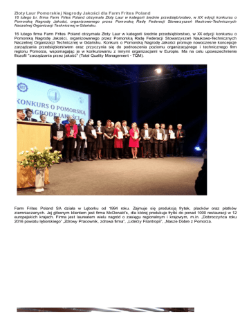 Złoty Laur Pomorskiej Nagrody Jakości dla Farm Frites Poland 16 lutego b r. firma Farm Frites Poland otrzymała Złoty Laur w kategorii średnie przedsięb iorstwo, w XX edycji konkursu o Pomorską Nagrodę Jakości, organizowanego przez Pomorską Radę Federacji Stowarzyszeń Naukowo-Technicznych Naczelnej Organizacji Technicznej w Gdańsku. 16 lutego firma Farm Frites Poland otrzymała Złoty Laur w kategorii średnie przedsiębiorstwo, w XX edycji konkursu o Pomorską Nagrodę Jakości, organizowanego przez Pomorską Radę Federacji Stowarzyszeń Naukowo-Technicznych Naczelnej Organizacji Technicznej w Gdańsku. Konkurs o Pomorską Nagrodę Jakości promuje nowoczesne koncepcje zarządzania przedsiębiorstwem oraz przyczynia się do podnoszenia poziomu organizacyjnego i technicznego firm regionu Pomorza, wspomagając je w konkurowaniu z innymi organizacjami w Europie. Ma na celu upowszechnienie filozofii "zarządzania przez jakość" (Total Quality Management - TQM). Farm Frites Poland SA działa w Lęborku od 1994 roku. Zajmuje się produkcją frytek, placków oraz płatków ziemniaczanych. Jej głównym klientem jest firma McDonald’s, dla której produkuje frytki do ponad 1000 restauracji w 12 europejskich krajach. Firma jest laureatem wielu nagród o zasięgu regionalnym i krajowym, m.in. „Dobroczyńca roku 2016 powiatu lęborskiego” „Zdrowy Pracownik, zdrowa firma”, „Liderzy Filantropii”, „Nasze Dobre z Pomorza. Dodaj do: RSS pełna lista aktualności Facebook