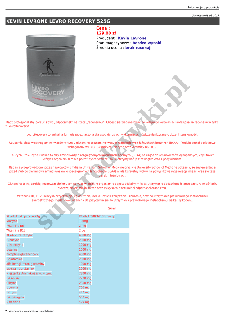 Informacje o produkcie Utworzono 08-03-2017 KEVIN LEVRONE LEVRO RECOVERY 525G Cena : 129,00 zł ki .p l Producent : Kevin Levrone Stan magazynowy : bardzo wysoki Średnia ocena : brak recenzji w Bądź profesjonalistą, porzuć słowo „odpoczynek” na rzecz „regeneracji”. Chcesz się zregenerować do kolejnego wyzwania? Profesjonalna regeneracja tylko z LevroRecovery! ro dz y LevroRecovery to unikalna formuła przeznaczona dla osób dorosłych wykonujących ćwiczenia fizyczne o dużej intensywności. Uzupełnia dietę w szereg aminokwasów w tym L-glutaminę oraz aminokwasy o rozgałęzionych łańcuchach bocznych (BCAA). Produkt został dodatkowo wzbogacony w HMB, L-karnitynę, niacynę oraz witaminy B6 i B12. Leucyna, izoleucyna i walina to trzy aminokwasy o rozgałęzionych łańcuchach bocznych (BCAA) należące do aminokwasów egzogennych, czyli takich których organizm sam nie potrafi syntetyzować i musi otrzymywać je z zewnątrz wraz z pożywieniem. Badania przeprowadzone przez naukowców z Indiana Universum School of Medicine oraz Mie University School of Medicine pokazały, że suplementacja przed i/lub po treningowa aminokwasami o rozgałęzionych łańcuchach (BCAA) miała korzystny wpływ na powysiłkową regenerację mięśni oraz syntezę białek mięśniowych. pe Glutamina to najbardziej rozpowszechniony aminokwas w ludzkim organizmie odpowiedzialny m.in za utrzymanie dodatniego bilansu azotu w mięśniach, syntezę białek mięśniowych oraz zwiększenie naturalnej odporności organizmu. su Witaminy B6, B12 i niacyna przyczyniają się do zmniejszenia uczucia zmęczenia i znużenia, oraz do utrzymania prawidłowego metabolizmu energetycznego. Dodatkowo witamina B6 przyczynia się do utrzymania prawidłowego metabolizmu białka i glikogenu. Skład: Składniki aktywne w 21g KEVIN LEVRONE Recovery Niacyna 10 mg Witamina B6 2 mg Witamina B12 2 μg BCAA 2:1:1, w tym: 4000 mg L-leucyna 2000 mg L-izoleucyna 1000 mg L-walina 1000 mg Kompleks glutaminowy: 4000 mg L-glutamine 2000 mg Alfa ketoglutaran glutaminy 1000 mg Jabłczan L-glutaminy 1000 mg Mieszanka Aminokwasów, w tym: 7800 mg L-alanina 2200 mg Glicyna 2300 mg L-seryna 700 mg L-lizyna 420 mg L-asparagina 550 mg L-treonina 400 mg Wygenerowano w programie www.oscGold.com Składniki aktywne w 21g KEVIN LEVRONE Recovery L-prolina 300 mg L-tyrozyna 200 mg L-fenyloalanina 170 mg Cysteina 100 mg L-arginina 200 mg L-histydyna 100 mg L-metionina 100 mg L-tryptofan 60 mg HMB (β-hydroksy β-metylomaślan) 3000 mg L-karnityna 1000 mg Dawkowanie: Zmieszać 2 miarki proszku (21 g) z 250 ml wody. ro dz y w ki .p l Dni treningowe: 1 porcja po treningu Dni nietreningowe: 1 porcja w ciągu dnia pomiędzy posiłkami pe ● su ●
