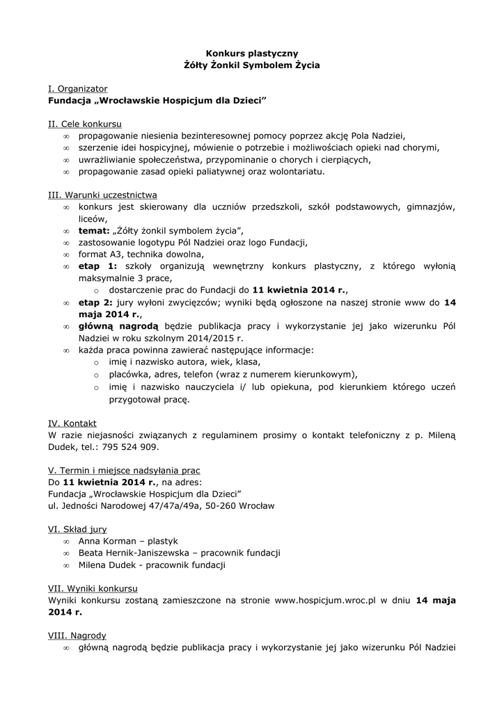Konkurs plastyczny Żółty Żonkil Symbolem Życia I. Organizator Fundacja „Wrocławskie Hospicjum dla Dzieci” II. Cele konkursu • propagowanie niesienia bezinteresownej pomocy poprzez akcję Pola Nadziei, • szerzenie idei hospicyjnej, mówienie o potrzebie i możliwościach opieki nad chorymi, • uwrażliwianie społeczeństwa, przypominanie o chorych i cierpiących, • propagowanie zasad opieki paliatywnej oraz wolontariatu. III. Warunki uczestnictwa • konkurs jest skierowany dla uczniów przedszkoli, szkół podstawowych, gimnazjów, liceów, • temat: „Żółty żonkil symbolem życia”, • zastosowanie logotypu Pól Nadziei oraz logo Fundacji, • format A3, technika dowolna, • etap 1: szkoły organizują wewnętrzny konkurs plastyczny, z którego wyłonią maksymalnie 3 prace, o dostarczenie prac do Fundacji do 11 kwietnia 2014 r., • etap 2: jury wyłoni zwycięzców; wyniki będą ogłoszone na naszej stronie www do 14 maja 2014 r., • główną nagrodą będzie publikacja pracy i wykorzystanie jej jako wizerunku Pól Nadziei w roku szkolnym 2014/2015 r. • każda praca powinna zawierać następujące informacje: o imię i nazwisko autora, wiek, klasa, o placówka, adres, telefon (wraz z numerem kierunkowym), o imię i nazwisko nauczyciela i/ lub opiekuna, pod kierunkiem którego uczeń przygotował pracę. IV. Kontakt W razie niejasności związanych z regulaminem prosimy o kontakt telefoniczny z p. Mileną Dudek, tel.: 795 524 909. V. Termin i miejsce nadsyłania prac Do 11 kwietnia 2014 r., na adres: Fundacja „Wrocławskie Hospicjum dla Dzieci” ul. Jedności Narodowej 47/47a/49a, 50-260 Wrocław VI. Skład jury • Anna Korman – plastyk • Beata Hernik-Janiszewska – pracownik fundacji • Milena Dudek - pracownik fundacji VII. Wyniki konkursu Wyniki konkursu zostaną zamieszczone na stronie www.hospicjum.wroc.pl w dniu 14 maja 2014 r. VIII. Nagrody • główną nagrodą będzie publikacja pracy i wykorzystanie jej jako wizerunku Pól Nadziei • • w roku szkolnym 2014/2015 r., jury przyzna również nagrody za zajęcie II i III miejsca, oraz 3 wyróżnienia, dyplomy i nagrody upominki zostaną wręczone 24 czerwca 2014 r. w trakcie finału Pól Nadziei. IX. Uwagi dodatkowe • prace niezgodne z regulaminem oraz zniszczone w wyniku niewłaściwego opakowania – nie będą brane pod uwagę, • prace przechodzą na własność organizatorów i będą wykorzystane jako wizerunek akcji Pola Nadziei, • do pracy powinno zostać dołączone oświadczenie autorskie z podpisem autora i opiekuna prawnego – zgłoszone do konkursu szkoły otrzymają wzór oświadczenia • rozstrzygnięcie jury jest ostateczne (od werdyktu nie przysługuje odwołanie), • osoby nagrodzone zostaną powiadomione osobnym pismem lub telefonicznie o miejscu i godzinie uroczystego rozdania nagród. SERDECZNIE ZAPRASZAMY DO UDZIAŁU W KONKURSIE