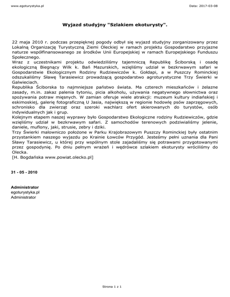 www.egoturystyka.pl Data: 2017-03-08 Wyjazd studyjny "Szlakiem ekoturysty". 22 maja 2010 r. podczas przepięknej pogody odbył się wyjazd studyjny zorganizowany przez Lokalną Organizację Turystyczną Ziemi Oleckiej w ramach projektu Gospodarstwo przyjazne naturze współfinansowanego ze środków Unii Europejskiej w ramach Europejskiego Funduszu Społecznego. Wraz z uczestnikami projektu odwiedziliśmy tajemniczą Republikę Ściborską i osadę ekologiczną Biegnący Wilk k. Bań Mazurskich, wzięliśmy udział w bezkrwawym safari w Gospodarstwie Ekologicznym Rodziny Rudziewiczów k. Gołdapi, a w Puszczy Rominckiej odszukaliśmy Sławę Tarasiewicz prowadzącą gospodarstwo agroturystyczne Trzy Świerki w Galwieciach. Republika Ściborska to najmniejsze państwo świata. Ma czterech mieszkańców i żelazne zasady, m.in. zakaz palenia tytoniu, picia alkoholu, używania negatywnego słownictwa oraz spożywania potraw mięsnych. W zamian oferuje wiele atrakcji: muzeum kultury indiańskiej i eskimoskiej, galerię fotograficzną U Jasia, największą w regionie hodowlę psów zaprzęgowych, schronisko dla zwierząt oraz szeroki wachlarz ofert skierowanych do turystów, osób indywidualnych jak i grup. Kolejnym etapem naszej wyprawy było Gospodarstwo Ekologiczne rodziny Rudziewiczów, gdzie wzięliśmy udział w bezkrwawym safari. Z samochodów terenowych podziwialiśmy jelenie, daniele, muflony, jaki, strusie, zebry i dziki. Trzy Świerki malowniczo położone w Parku Krajobrazowym Puszczy Rominckiej były ostatnim przystankiem naszego wyjazdu po Krainie Łowców Przygód. Jesteśmy pełni uznania dla Pani Sławy Tarasiewicz, u której przy wspólnym stole zajadaliśmy się potrawami przygotowanymi przez gospodynię. Po dniu pełnym wrażeń i wędrówce szlakiem ekoturysty wróciliśmy do Olecka. [H. Bogdańska www.powiat.olecko.pl] 31 - 05 - 2010 Administrator egoturystyka.pl Administrator Strona 1 z 1