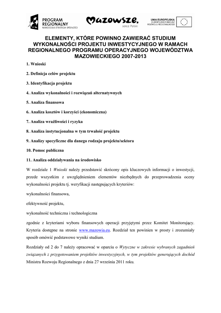 ELEMENTY, KTÓRE POWINNO ZAWIERAĆ STUDIUM WYKONALNOŚCI PROJEKTU INWESTYCYJNEGO W RAMACH REGIONALNEGO PROGRAMU OPERACYJNEGO WOJEWÓDZTWA MAZOWIECKIEGO 2007-2013 1. Wnioski 2. Definicja celów projektu 3. Identyfikacja projektu 4. Analiza wykonalności i rozwiązań alternatywnych 5. Analiza finansowa 6. Analiza kosztów i korzyści (ekonomiczna) 7. Analiza wrażliwości i ryzyka 8. Analiza instytucjonalna w tym trwałość projektu 9. Analizy specyficzne dla danego rodzaju projektu/sektora 10. Pomoc publiczna 11. Analiza oddziaływania na środowisko W rozdziale 1 Wnioski należy przedstawić skrócony opis kluczowych informacji o inwestycji, przede wszystkim z uwzględnieniem elementów niezbędnych do przeprowadzenia oceny wykonalności projektu tj. weryfikacji następujących kryteriów: wykonalności finansowa, efektywność projektu, wykonalność techniczna i technologiczna zgodnie z kryteriami wyboru finansowych operacji przyjętymi przez Komitet Monitorujący. Kryteria dostępne na stronie www.mazowia.eu. Rozdział ten powinien w prosty i zrozumiały sposób omówić podstawowe wyniki studium. Rozdziały od 2 do 7 należy opracować w oparciu o Wytyczne w zakresie wybranych zagadnień związanych z przygotowaniem projektów inwestycyjnych, w tym projektów generujących dochód Ministra Rozwoju Regionalnego z dnia 27 września 2011 roku. Ponadto rozdział 4 Analiza wykonalności i rozwiązań alternatywnych powinien zostać rozszerzony o analizę i uzasadnienie wyboru zastosowanych w projekcie rozwiązań technologicznych. Rozdział 8 Analiza instytucjonalna w tym trwałość projektu powinien przede wszystkim odpowiedzieć na pytanie: Czy beneficjent posiada zdolność organizacyjną do wdrożenia projektu? Czy beneficjent posiada zdolność organizacyjną i finansową do utrzymania projektu? Kto będzie zarządzał projektem w okresie, co najmniej 5 lat od zakończenia projektu? Rozdział 9 Analizy specyficzne dla danego rodzaju projektu/sektora Należy dokonać analizy projektu pod kątem specyfiki danego sektora np. w przypadku projektów drogowych należy przeprowadzić analizy ruchowe, edukacyjnych - analizy efektywności działań dydaktycznych itp. Rozdział 10 Pomoc publiczna Należy uzasadnić, czy projekt podlega zasadom pomocy publicznej na podstawie obowiązujących aktów prawnych i wytycznych. W przypadku stwierdzenia, że inwestycja podlega rygorowi pomocy publicznej, należy uzasadnić wnioskowany poziom dofinansowania zgodnie z poziomem wskazanym w odpowiednim rozporządzeniu. Wykaz obowiązujących aktów prawnych i wytycznych znajduje się w Uszczegółowieniu RPO WM obowiązującym w chwili ogłoszenia konkursu. Rozdział 11 Analiza oddziaływania na środowisko Dla projektów, dla których wymagane jest zgodnie z prawem polskim oraz unijnym przeprowadzenie postępowania w sprawie uzyskania decyzji o środowiskowych uwarunkowaniach, w tym oceny oddziaływania na środowisko, należy przedstawić krótką analizę oddziaływania inwestycji na poszczególne komponenty środowiska. Dla wszystkich projektów obligatoryjne jest odniesienie się do przewidywanego wpływu inwestycji na obszary Natura 2000. W obu ww. przypadkach zastosowanie mają Wytyczne Ministra Rozwoju Regionalnego w zakresie postępowania w sprawie oceny oddziaływania na środowisko dla przedsięwzięć współfinansowanych z krajowych lub regionalnych programów operacyjnych.