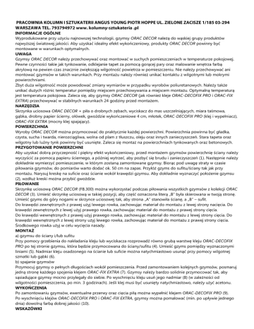 INFORMACJE OGÓLNE Wyprodukowane przy użyciu najnowszej technologii, gzymsy ORAC DECOR należą do wąskiej grupy produktów najwyższej światowej jakości. Aby uzyskać idealny efekt wykończeniowy, produkty ORAC DECOR powinny być montowane w warunkach optymalnych. UWAGA Gzymsy ORAC DECOR należy przechowywać oraz montować w suchych pomieszczeniach w temperaturze pokojowej. Pewne czynności takie jak tynkowanie, odklejanie tapet za pomocą gorącej pary oraz malowanie wnętrza farbą akrylową na pewien czas znacznie zwiększają wilgotność powietrza w pomieszczeniu. Nie należy przechowywać ani montować gzymsów w takich warunkach. Przy montażu należy również unikać kontaktu z wilgotnymi lub mokrymi powierzchniami. Zbyt duża wilgotność może powodować zmiany wymiarów w przypadku wyrobów poliuretanowych. Należy także unikać dużych różnic temperatur pomiędzy miejscem przechowywania a miejscem montażu. Optymalną temperaturą jest temperatura pokojowa. Zaleca się, aby gzymsy ORAC DECOR (jak również kleje ORAC-DECOFIX PRO i ORAC-FIX EXTRA) przechowywać w stabilnych warunkach 24 godziny przed montażem. NARZĘDZIA Skrzynka uciosowa ORAC DECOR + piła o drobnych zębach, wyciskacz do mas uszczelniających, miara taśmowa, gąbka, drobny papier ścierny, ołówek, gwoździe wykończeniowe 4 cm, młotek, ORAC-DECOFIX PRO (klej i wypełniacz), ORAC-FIX EXTRA (mocny klej spajający). POWIERZCHNIA Wyroby ORAC DECOR można przymocować do praktycznie każdej powierzchni. Powierzchnia powinna być gładka, czysta, sucha i twarda, nierozciągliwa, wolna od plam z tłuszczu, oleju oraz innych zanieczyszczeń. Stara tapeta oraz wilgotny lub luźny tynk powinny być usunięte. Zaleca się montaż na powierzchniach tynkowanych oraz betonowych. PRZYGOTOWANIE POWIERZCHNI Aby uzyskać dobrą przyczepność i piękny efekt wykończeniowy, przed montażem gzymsów powierzchnię ściany należy wyczyścić za pomocą papieru ściernego, a później wytrzeć, aby pozbyć się brudu i zanieczyszczeń (1). Następnie należy dokładnie wymierzyć pomieszczenie, w którym zostaną zamontowane gzymsy. Biorąc pod uwagę straty w czasie piłowania gzymsów, do pomiarów warto dodać ok. 50 cm na zapas. Przyłóż gzyms do sufitu/ściany tak jak przy montażu. Narysuj kreskę na suficie oraz ścianie wokół krawędzi gzymsu. Aby dokładnie wyznaczyć położenie gzymsu (2), wzdłuż kreski można przybić gwoździe. PIŁOWANIE Skrzynkę uciosową ORAC DECOR (FB.300) można wykorzystać podczas piłowania wszystkich gzymsów z kolekcji ORAC DECOR (3). Umieść skrzynkę uciosową w takiej pozycji, aby część oznaczona literą „B” była skierowana w twoją stronę. Umieść gzyms do góry nogami w skrzynce uciosowej tak, aby strona „A” stanowiła ścianę, a „B” – sufit. Do krawędzi zewnętrznych z prawej użyj lewego rowka, zachowując materiał do montażu z lewej strony nacięcia. Do krawędzi zewnętrznych z lewej użyj prawego rowka, zachowując materiał do montażu z prawej strony cięcia. Do krawędzi wewnętrznych z prawej użyj prawego rowka, zachowując materiał do montażu z lewej strony cięcia. Do krawędzi wewnętrznych z lewej strony użyj lewego rowka, zachowując materiał do montażu z prawej strony cięcia. Środkowego rowka użyj w celu wycięcia nasady. MONTAŻ a) gzymsu do ściany i/lub sufitu Przy pomocy grzebienia do nakładania kleju lub wyciskacza rozprowadź równo grubą warstwę kleju ORAC-DECOFIX PRO po tej stronie gzymsu, która będzie przymocowana do ściany/sufitu (4). Umieść gzyms pomiędzy wyznaczonymi liniami (5). Nadmiar kleju osadzonego na ścianie lub suficie można natychmiastowo usunąć przy pomocy wilgotnej szmatki lub gąbki (6). b) spajanie gzymsów Przymocuj gzymsy o pełnych długościach wokół pomieszczenia. Przed zamontowaniem kolejnych gzymsów, posmaruj jedną stronę każdego spojenia klejem ORAC-FIX EXTRA (7). Gzymsy należy bardzo solidnie przymocować tak, aby sąsiadujące gzymsy mocno przylegały do siebie. Po wyschnięciu kleju usuń jego nadmiar (8) (w zależności od wilgotności pomieszczenia, po min. 3 godzinach). Jeśli klej musi być usunięty natychmiastowo, należy użyć acetonu. WYKOŃCZENIA Po zamontowaniu gzymsów, ewentualne przerwy oraz cięcia piłą można wypełnić klejem ORAC-DECOFIX PRO (9). Po wyschnięciu klejów ORAC-DECOFIX PRO i ORAC-FIX EXTRA, gzymsy można pomalować (min. po upływie jednego dnia) dowolną farbą dobrej jakości (10). WSKAZÓWKI Chronić przed WILGOCIĄ, zarówno w czasie przechowywania jak i montażu. Używać wyłącznie klejów ORAC-DECOFIX PRO oraz ORAC-FIX EXTRA. ORAC-FIX EXTRA: unikać kontaktu ze skórą. Delikatnie wyczyścić gzymsy za pomocą drobnego papieru ściernego, aby usunąć wszelkie zanieczyszczenia i uzyskać idealną przyczepność. Do malowania oraz wykończenia należy używać wysokiej jakości farb i politur. Warunki gwarancji obowiązują wyłącznie pod warunkiem bezwzględnego stosowania zaleceń podanych w niniejszej instrukcji.